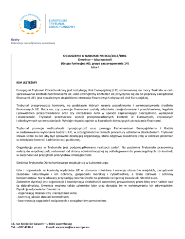 Kadry Rekrutacja i rozwój kariery zawodowej OGŁOSZENIE O NABORZE NR ECA/2015/DIR1 Dyrektor – Izba kontroli (Grupa funkcyjna AD, grupa zaszeregowania 14) Izba I KIM JESTEŚMY Europejski Trybunał Obrachunkowy jest instytucją Unii Europejskiej (UE) ustanowioną na mocy Traktatu w celu sprawowania kontroli nad finansami UE. Jako zewnętrzny kontroler UE przyczynia się on do poprawy zarządzania finansami UE i jest niezależnym strażnikiem interesów finansowych obywateli Unii Europejskiej. Trybunał przeprowadza kontrole, na podstawie których ocenia pozyskiwanie i wykorzystywanie środków finansowych UE. Bada on, czy operacje finansowe zostały właściwie zarejestrowane i przedstawione, legalnie i prawidłowo przeprowadzone oraz czy zarządzano nimi w sposób zapewniający oszczędność, wydajność i skuteczność. Trybunał przedstawia wyniki przeprowadzonych kontroli w klarownych, rzeczowych i obiektywnych sprawozdaniach. Wydaje również opinie w kwestiach dotyczących zarządzania finansami. Trybunał promuje rozliczalność i przejrzystość oraz pomaga Parlamentowi Europejskiemu i Radzie w nadzorowaniu wykonania budżetu UE, w szczególności w ramach procedury udzielania absolutorium. Trybunał stawia sobie za cel, aby być sprawnie działającą organizacją, która odgrywa zasadniczą rolę w zakresie przemian w dziedzinie kontroli i administracji publicznej. Organizacja pracy w Trybunale jest podporządkowana realizacji zadań. Na poziomie Trybunału pracownicy należą do wspólnej puli, natomiast od strony administracyjnej są oddelegowani do poszczególnych izb kontroli, w zależności od przyjętych priorytetów strategicznych. Siedziba Trybunału Obrachunkowego znajduje się w Luksemburgu. Izba I odpowiada za kontrolę wydatków UE w obszarze rolnictwa i rozwoju obszarów wiejskich, zarządzania zasobami naturalnymi i ich ochrony, gospodarki morskiej i rybołówstwa, a także zdrowia i ochrony konsumentów. Na te obszary przypadają rocznie środki na płatności w łącznej kwocie ok. 58 mld euro. Zadaniem dyrekcji jest organizacja i koordynacja działalności kontrolnej prowadzonej przez Izbę oraz nadzór nad tą działalnością. Dyrekcja wspiera także członków Izby oraz doradza im w wykonywaniu ich obowiązków. Dyrekcja odpowiada również za: - organizację działań Izby i zarządzanie nimi; - kontrolę jakości działań kontrolnych; - koordynację zagadnień związanych z zarządzaniem personelem. 12, rue Alcide De Gasperi – L-1615 Luxembourg E-mail: [email protected] Tel.: +352 4398-1 PROPONUJEMY Objęcie stanowiska dyrektora nastąpi w dniu 1 lutego 2016 r. Na podstawie art. 29 ust. 2 Regulaminu pracowniczego urzędników Wspólnot Europejskich (zwanego dalej „regulaminem”) Europejski Trybunał Obrachunkowy postanowił rozpocząć procedurę mającą na celu obsadzenie stanowiska dyrektora (grupa zaszeregowania AD14) w Izbie I. Procedura ta, której celem jest zapewnienie organowi powołującemu większego wyboru kandydatów, odbędzie się równolegle z wewnętrzną i międzyinstytucjonalną procedurą naboru. Nabór nastąpi do grupy zaszeregowania AD14. Wynagrodzenie podstawowe wynosi 13 322,22 euro miesięcznie. Kwota wynagrodzenia podstawowego, która podlega opodatkowaniu podatkiem wspólnotowym i jest zwolniona z podatku krajowego, może zostać zwiększona o określone dodatki zgodnie z warunkami przewidzianymi w regulaminie. W ramach izby dyrektor jest urzędnikiem najwyższej rangi; podlega on bezpośredniemu zwierzchnictwu członków z danej izby. Zarządza on izbą i ponosi ogólną odpowiedzialność za terminową realizację programu prac, zgodną z ramami budżetu i normami jakości, a także ze strategią i standardami kontroli Trybunału. W tym celu dyrektor wyznacza do każdego zadania niezbędne zasoby w zakresie: - personelu i środków finansowych (wizyty kontrolne i eksperci zewnętrzni); - kontroli: kadry, zapewnienie dostępności personelu i kadry zarządzającej, wsparcie w postaci wiedzy specjalistycznej w zakresie jakości i kontroli jakości, umiejętności. Dyrektor asystuje przewodniczącemu w zarządzaniu izbą, a także w realizacji zadań z zakresu ustalania strategii, monitorowania i sprawozdawczości. Zapewnia też sprawny przebieg wszystkich wizyt i zadań kontrolnych, które zostały mu powierzone. POSZUKUJEMY Niniejsza procedura naboru jest otwarta dla kandydatów, którzy w dniu, w którym upływa termin składania kandydatur, spełniają następujące warunki: 1. Poziom wykształcenia - zgodnie z art. 5 regulaminu wymagane są w szczególności: ٭poziom wykształcenia odpowiadający pełnemu cyklowi studiów uniwersyteckich, potwierdzony uzyskaniem dyplomu, w przypadku gdy normalny czas trwania wspomnianych studiów wynosi co najmniej cztery lata, lub ٭poziom wykształcenia odpowiadający pełnemu cyklowi studiów uniwersyteckich, potwierdzony uzyskaniem dyplomu oraz odpowiednie doświadczenie zawodowe o długości co najmniej jednego roku, w przypadku gdy normalny czas trwania wspomnianych studiów wynosi co najmniej trzy lata, lub ٭w przypadku gdy jest to uzasadnione interesem służby – wykształcenie zawodowe na równoważnym poziomie. 2. Doświadczenie zawodowe - udokumentowane, co najmniej piętnastoletnie stosowne doświadczenie zawodowe, liczone od momentu uzyskania wyżej wymienionego dyplomu (doświadczenie w środowisku międzynarodowym będzie dodatkowym atutem); co najmniej czteroletnie doświadczenie na stanowisku kierowniczym; w szczególności udokumentowane, gruntowne doświadczenie w dziedzinie kontroli, w tym kontroli jakości w tym zakresie, postępowań kontradyktoryjnych z udziałem podmiotów kontrolowanych oraz publikacji sprawozdań; 3. Wymagana wiedza - doskonała znajomość ogólnych standardów i metodyk kontroli, w szczególności w zakresie kontroli finansowej i kontroli zgodności; - doskonała znajomość jednego języka urzędowego Unii Europejskiej oraz znajomoś