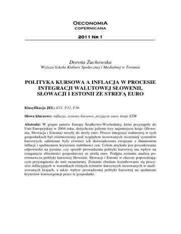 OeconomiA copernicana 2011 2011 Nr 1 Dorota Żuchowska Wyższa Szkoła Kultury Społecznej i Medialnej w Toruniu POLITYKA KURSOWA A INFLACJA W PROCESIE INTEGRACJI WALUTOWEJ SŁOWENII, SŁOWACJI I ESTONII ZE STREFĄ EURO Klasyfikacja JEL: E31, F31, F36 Słowa kluczowe: inflacja, systemy kursowe, przyjęcie euro, kraje EŚW Abstrakt: W grupie państw Europy Środkowo-Wschodniej, które przystąpiły do Unii Europejskiej w 2004 roku, dotychczas jedynie trzy najmniejsze kraje (Słowenia, Słowacja i Estonia) weszły do strefy euro. Proces integracji walutowej w tych gospodarkach był zróżnicowany pod względem stosowanych wcześniej systemów kursowych, odmienne były również ich doświadczenia związane z tłumieniem inflacji i spełnieniem kryterium stabilności cen. Celem artykułu jest poszukiwanie odpowiedzi na pytanie, czy sposób prowadzenia polityki kursowej ma wpływ na osiągnięcie zbieżności gospodarczej ze strefą euro. Podjęta zostanie analiza porównawcza polityki kursowej Słowenii, Słowacji i Estonii w okresie poprzedzającym przystąpienie do unii monetarnej. Zostanie zbadane kształtowanie się procesów inflacyjnych w warunkach różnych reżimów kursowych stosowanych w analizowanych krajach, a także wpływ prowadzonej polityki kursowej na spełnienie kryteriów konwergencji przez te gospodarki. 8 Dorota Żuchowska EXCHANGE RATE POLICY AND INFLATION IN THE PROCESS OF CURRENCY INTEGRATION IN SLOVENIA, SLOVAKIA AND ESTONIA WITH THE EUROZONE JEL Classification Codes: E31, F31, F36 Keywords: Inflation, Exchange Rate Regimes, Euro Adoption, Central-Eastern Europe Abstract: Among the Central-Eastern Europe countries which joined the European Union in 2004 only three – the smallest (Slovenia, Slovakia and Estonia) – joined the Eurozone. Within these economies the process of currency integration was diversified in respect to their previously used systems of exchange rate regimes. Also experiences concerning suppressing inflation and meeting the condition of prices stability varied among them. The aim of this article is to answer the question whether the mode of the applied exchange rate regime has an impact on achieving economical convergence with the Eurozone. I shall compare exchange rate regimes in Slovenia, Slovakia and Estonia in the period preceding joining the Eurozone. I shall also examine formation of inflation processes within the conditions of various exchange rate regimes existing in the analyzed countries as well as influence of the employed exchange rate regime policy on satisfying the criteria of convergence by those economies. WPROWADZENIE Kraje Europy Środkowo-Wschodniej (Litwa, Łotwa, Estonia, Polska, Czechy, Słowacja, Węgry, Słowenia, Rumunia i Bułgaria) w okresie transformacji przeszły proces fundamentalnych zmian gospodarczych, które umożliwiły im akcesję do Unii Europejskiej i dążenie do członkowstwa w unii walutowej. Jednak mimo oficjalnych deklaracji wszystkich gospodarek EŚW o realizacji celu integracji walutowej, do strefy euro zostały przyjęte dopiero trzy z nich: Słowenia (1 stycznia 2007 roku), Słowacja (1 stycznia 2009 roku) i ostatnio Estonia (1 stycznia 2011 roku), które spełniły wymagane warunki konwergencji tj. stabilności cen, kryterium stóp procentowych, kryteria fiskalne oraz kryterium stabilności kursu walutowego po minimum dwuletnim pobycie w systemie ERM II. Proces integracji walutowej tych gospodarek przebiegał w warunkach różnych systemów kursowych, odmienne były również ich wcześniejsze doświadczenia w walce z inflacją. Za cel analizy w niniejszym artykule Polityka kursowa a inflacja… 9 przyjęto więc porównanie polityki kursowej Słowenii, Słowacji i Estonii oraz kształtowania się procesów inflacyjnych w okresie przed przystąpieniem do ERM II, a także sposób spełnienia kryterium stabilności cen w tych krajach. Pozwoli to na wyciągnięcie wniosków odnośnie wpływu prowadzonej w tych krajach polityki kursowej na osiągnięcie zbieżności gospodarczej ze strefą euro, w szczególności na spełnienie kryterium inflacyjnego. POLITYKA KURSOWA SŁOWENII PRZED WEJŚCIEM DO ERM II I JEJ SKUTKI DEZINFLACYJNE Słowenia na początku transformacji zastosowała system kierowanego kursu płynnego, zaś odziedziczona po Jugosławii hiperinflacja miała zasadniczy wpływ na wybór – jako podstawowego celu prowadzonej polityki pieniężnej – osiągnięcia stabilności poziomu cen (Por. PrzybylskaKapuścińska 2007, s. 293). Władze monetarne zdecydowały się na ścieżkę stabilizacji monetarnej poprzez kontrolę podaży pieniądza w kraju, w warunkach systemu kursu płynnego 1. Mimo iż de iure od 1991 roku Słowenia stosowała system kierowanego kursu płynnego, de facto w początkowym okresie (do 1995 roku) był to – jak określają Caprirolo i Lavrač (2001) – kurs swobodnie spadający (freely falling exchange rate regime), w którym walutę odniesienia stanowiła marka niemiecka. Prowadzona w tym czasie przez słoweńskie władze monetarne polityka kursowa nakierowana była bowiem na deprecjację kursu tolara i wiązała się z prowadzeniem interwencji walutowych, mających nie dopuścić do nadmiernej aprecjacji waluty narodowej. Takie interwencje w celu przeciwdziałania zbyt dużej aprecjacji tolara rozpoczęły się już w drugiej połowie 1992 roku. Od 1996 roku w celu osiągnięcia stabilizacji cen w Słowenii była realizowana strategia kontroli podaży pieniądza (najpierw M1, a następnie M3). Jednocześnie jednak prowadzono politykę kontroli kursu walutowego w celu stabilizacji realnego efektywnego kursu tolara. Taka polityka kursowa była możliwa jedynie dzięki stopniowemu wprowadzaniu (od lutego 1995 roku) dodatkowych ograniczeń w przepływach kapitałowych w tym kraju2. Co prawda, stosowany w Słowenii od 1996 roku system kursu walutowego nadal klasyfikowany był formalnie jako reżim kursu płynnego kierowanego, ale faktycznie mieliśmy tam do czynienia z p