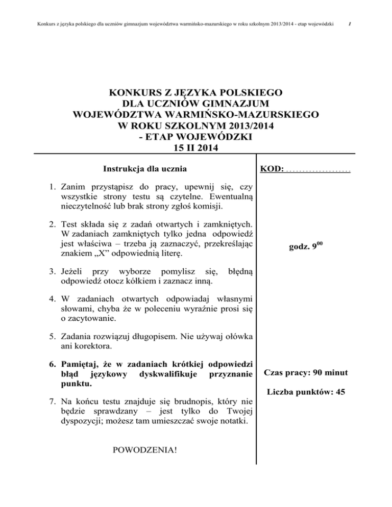 Konkurs z języka polskiego dla uczniów gimnazjum województwa warmińsko-mazurskiego w roku szkolnym 2013/2014 - etap wojewódzki 1 KONKURS Z JĘZYKA POLSKIEGO DLA UCZNIÓW GIMNAZJUM WOJEWÓDZTWA WARMIŃSKO-MAZURSKIEGO W ROKU SZKOLNYM 2013/2014 - ETAP WOJEWÓDZKI 15 II 2014 Instrukcja dla ucznia KOD: . . . . . . . . . . . . . . . . . . . . 1. Zanim przystąpisz do pracy, upewnij się, czy wszystkie strony testu są czytelne. Ewentualną nieczytelność lub brak strony zgłoś komisji. 2. Test składa się z zadań otwartych i zamkniętych. W zadaniach zamkniętych tylko jedna odpowiedź jest właściwa – trzeba ją zaznaczyć, przekreślając znakiem „X” odpowiednią literę. 3. Jeżeli przy wyborze pomylisz się, odpowiedź otocz kółkiem i zaznacz inną. godz. 900 błędną 4. W zadaniach otwartych odpowiadaj własnymi słowami, chyba że w poleceniu wyraźnie prosi się o zacytowanie. 5. Zadania rozwiązuj długopisem. Nie używaj ołówka ani korektora. 6. Pamiętaj, że w zadaniach krótkiej odpowiedzi błąd językowy dyskwalifikuje przyznanie punktu. 7. Na końcu testu znajduje się brudnopis, który nie będzie sprawdzany – jest tylko do Twojej dyspozycji; możesz tam umieszczać swoje notatki. POWODZENIA! Czas pracy: 90 minut Liczba punktów: 45 Konkurs z języka polskiego dla uczniów gimnazjum województwa warmińsko-mazurskiego w roku szkolnym 2013/2014 - etap wojewódzki 2 Przeczytaj uważnie poniższy tekst i wykonaj związane z nim zadania. TEKST ŹRÓDŁOWY NR 1 Anna Kamieńska, Wieża Babel Rozmnożyli się ludzie po potopie. Wszyscy byli potomkami trzech synów Noego ocalonych z nim razem – Sema, Chama i Jafeta. Od imienia Sema ród jego nazwany został Semitami, zaś Heber, jeden z potomków Sema, dał nazwę narodowi Hebrajczyków i językowi hebrajskiemu. A choć ród rozgałęział się coraz bardziej jak wielkie drzewo, wszyscy mówili jednym językiem i wszyscy rozumieli się, jak liście szumiące na jednej gałęzi rozumiałyby szum liści na drugiej gałęzi. I tak idąc wciąż i zaludniając nowe krainy, znaleźli się na ziemi Sennaar, gdzie osiedli. Znajdująca się tam czerwona glinka nadawała się znakomicie na wyrób cegieł. Zbudowali w ziemi piece i zaczęli wypalać mnóstwo cegieł. Cegła była lżejsza i lepsza od kamiennych głazów, które trzeba było nosić z gór. Wynaleźli też kleisty ił, niby smołę do spajania cegieł. – Teraz możemy zbudować miasto – rzekli. – A co by było, gdybyśmy zbudowali wieżę tak wysoką, aby dosięgła nieba? – Uczyńmy tak! – zawołali. – Okryjemy sławą nasze imię, zanim rozproszymy się po całej ziemi. – Wszystko możemy! Potrafimy wszystko! Zajrzymy w okna samemu Bogu! – mówili i wzięli się do budowy. Rosła wieża piętro po piętrze, coraz wyższa, coraz wspanialsza. Pysznili się ludzie swoim dziełem. Zstąpił z nieba Pan, aby zobaczyć miasto i wieżę, pomnik ludzkiej pychy. I rzekł: – Oto jeden lud. A wszyscy mówią jednym językiem i jeden rozumie drugiego. Ale pomieszajmy im języki, aby się więcej nie pysznili swoimi dziełami. Im wyżej będą się wznosić w swojej budowie, tym bardziej różne będą ich języki. Już brat nie zrozumie głosu brata, już przyjaciel nie pojmie przyjaciela. Pewnego dnia okazało się, że już nikt nie rozumie nikogo. Skończyła się cywilizacja pyszniąca się techniką i rozumem. Opustoszało miasto, porzucona waliła się w rumowisko wielka wieża wzniesiona ludzkimi rękami. A nazwano ją Babel, to znaczy miejsce, gdzie pomieszały się ludzkie języki. Odtąd Bóg rozproszył ludzi i narody, przydzielił im osobne krainy i osobną dla każdego narodu mowę. A. Kamieńska, Książka nad książkami, Warszawa 1988. Do rozwiązania zadań od 1. do 7. wykorzystaj TEKST ŹRÓDŁOWY NR 1. Zadanie 1. (0–1) Wyjaśnij, dlaczego Bóg pomieszał ludziom języki. ………………………………………………………………………………………………………… ………………………………………………………………………………………………………… ………………………………………………………………………………………………………… ……………………………………………………………………………………………………….. Konkurs z języka polskiego dla uczniów gimnazjum województwa warmińsko-mazurskiego w roku szkolnym 2013/2014 - etap wojewódzki 3 Zadanie 2. (0–2) Jak rozumiesz słowa ludzi: „Zajrzymy w okna samemu Bogu!” oraz Boga: „Im wyżej będą się wznosić w swojej budowie, tym bardziej różne będą ich języki”? Wypowiedź ludzi: ………………………………………………………………………………………………………… ………………………………………………………………………………………………………… ………………………………………………………………………………………………………… Wypowiedź Boga: ………………………………………………………………………………………………………… ………………………………………………………………………………………………………… ……………………………………………………………………………………………………….. Zadanie 3. (0-1) Przeczytaj definicję słowa „topos”. Wyjaśnij, czego toposem jest wieża Babel. Topos – element tematyczny lub zbiór takich elementów (motywów), powtarzający się w literaturze danego kręgu kulturowego. Literatura i nauka o języku. Encyklopedia szkolna, Warszawa 1999. ………………………………………………………………………………………………………… ………………………………………………………………………………………………