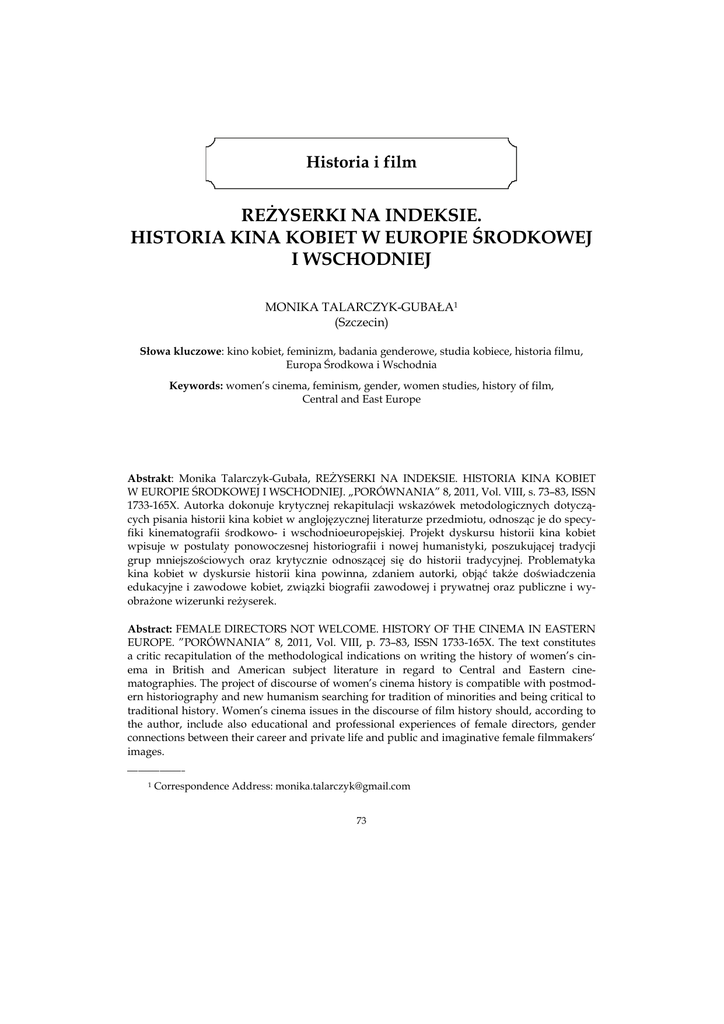 Historia i film REŻYSERKI NA INDEKSIE. HISTORIA KINA KOBIET W EUROPIE ŚRODKOWEJ I WSCHODNIEJ MONIKA TALARCZYK-GUBAŁA1 (Szczecin) Słowa kluczowe: kino kobiet, feminizm, badania genderowe, studia kobiece, historia filmu, Europa Środkowa i Wschodnia Keywords: women’s cinema, feminism, gender, women studies, history of film, Central and East Europe Abstrakt: Monika Talarczyk-Gubała, REŻYSERKI NA INDEKSIE. HISTORIA KINA KOBIET W EUROPIE ŚRODKOWEJ I WSCHODNIEJ. „PORÓWNANIA” 8, 2011, Vol. VIII, s. 73–83, ISSN 1733-165X. Autorka dokonuje krytycznej rekapitulacji wskazówek metodologicznych dotyczących pisania historii kina kobiet w anglojęzycznej literaturze przedmiotu, odnosząc je do specyfiki kinematografii środkowo- i wschodnioeuropejskiej. Projekt dyskursu historii kina kobiet wpisuje w postulaty ponowoczesnej historiografii i nowej humanistyki, poszukującej tradycji grup mniejszościowych oraz krytycznie odnoszącej się do historii tradycyjnej. Problematyka kina kobiet w dyskursie historii kina powinna, zdaniem autorki, objąć także doświadczenia edukacyjne i zawodowe kobiet, związki biografii zawodowej i prywatnej oraz publiczne i wyobrażone wizerunki reżyserek. Abstract: FEMALE DIRECTORS NOT WELCOME. HISTORY OF THE CINEMA IN EASTERN EUROPE. ”PORÓWNANIA” 8, 2011, Vol. VIII, p. 73–83, ISSN 1733-165X. The text constitutes a critic recapitulation of the methodological indications on writing the history of women’s cinema in British and American subject literature in regard to Central and Eastern cinematographies. The project of discourse of women’s cinema history is compatible with postmodern historiography and new humanism searching for tradition of minorities and being critical to traditional history. Women’s cinema issues in the discourse of film history should, according to the author, include also educational and professional experiences of female directors, gender connections between their career and private life and public and imaginative female filmmakers‘ images. ________________ 1 Correspondence Address: [email protected] 73 PORÓWNANIA 8, 2011 Pojęcie kina kobiet, wprowadzone przez brytyjskie i amerykańskie badaczki w krytyce feministycznej lat siedemdziesiątych, nadal jest żywo dyskutowane, zwłaszcza w kontekście poststrukturalistycznej krytyki teorii autorskiej. Przyjęto, że kino kobiet obejmuje przedsięwzięcia reżyserek w dziedzinie kinematografii, dążące do ekspresji kobiecego doświadczania świata i przekształcenia dominującego modelu kina, a zarazem przeciwstawione tzw. kinu kobiecemu, utożsamianemu z melodramatycznym czy telenowelowym kinem popularnym, rzekomo budzącym najżywsze zainteresowanie kobiecej widowni. Poza anglojęzycznym kręgiem badawczym terminu „kino kobiet“ właściwie nie odnosi się do twórczości filmowej kobiet z Europy Środkowej i Wschodniej, zwłaszcza tej, która stała się już przedmiotem historii. Biorąc pod uwagę, że feminizm jest jednym z wiodących nurtów refleksji nad współczesną kulturą, warto zmodernizować dyskurs historii filmu środkowo- i wschodnioeuropejskiego regionu i włączyć perspektywę kobiecą do debaty tożsamościowej krajów byłego bloku wschodniego. W anglojęzycznych bazach danych o reżyserkach filmowych znajdziemy nieliczne nazwiska autorek ze środkowo- i wschodnioeuropejskiego regionu. Statystycznie reprezentatywny jest Index Foster2 (1995) – międzynarodowy biograficzno-krytyczny słownik autorstwa przedstawicielki postfeministycznej teorii krytycznej, profesorki Gweldolyn Andrey Foster z Uniwersytetu w Nebrasce3. Hasła w Indeksie Foster obejmują informację biograficzną, krótką notkę krytyczną (essey), filmografię i wybór bibliografii, indeks tytułów, dodatek z listą uporządkowaną według narodowości reżyserek oraz listą uporządkowaną według dekad i aktywności poszczególnych reżyserek. Jak zaznaczyła we wstępie autorka słownika, dobór reżyserek zależał od dostępnych, zwykle anglojęzycznych informacji (sic!), objął filmy fabularne i dokumentalne, ale nie zawiera informacji o artystkach wideo, ma charakter amerykańsko- i zachodnioeurocentryczny. Dla przykładu, z polskich reżyserek Foster odnotowała jedynie Wandę Jakubowską i Agnieszkę Holland, z czeskich tylko Věrę Chytilovą, z węgierskich zaledwie Judith Elek i Mártę Mészáros. Dużo lepiej przedstawia się udział reżyserek z Rosji, a w nim: Dinara Asanova, Lana Gogoberidze, Kira Muratova, Olga Preobrazhernskaya, Larissa Shepitko, Ester Shub, Iuliia Solnstseva, Elizaveta Svilova. Nie można liczyć na to, że międzynarodowe bazy biograficzne odnotują dokonania reżyserek z naszego regionu, nawet tak jednoznacznie skoncentrowanych na problematyce kobiecej jak Barbara Sass-Zdort czy Ester Krumbachová, jeśli autorzy z rodzimego kręgu kulturowego nie poświęcą im więcej miejsca w rewizji dyskursu historii ki________________ Formułując tytuł Reżyserki na indeksie, poza pierwszym skojarzeniem cenzury w kinematografiach krajów komunistycznych, miałam na myśli także Indeks Foster oraz doświadczenia edukacyjne reżyserek na wyższych uczelniach filmowych, które uważam za kluczowe dla problematyki kina kobiet. 3 G.A. Foster, Women Film Directors. An international bio-critical dictionary, USA 1995. Wcześniej ukazał się przewodnik A. Kuhn, S. Radstone (eds.), Women in Film. An International Guide. New Jork 1990. 2 74 Monika Talarczyk-Gubała, Reżyserki na indeksie na. Co więcej, same reżyserki, pozbawione wsparcia ze strony historyczek, dezawuują tradycję kina kobiet. Na wzór projektów tworzenia regionalnych słowników pisarek, można byłoby historię kina kobiet w Europie Środkowej i Wschodniej rozpocząć od elementarnego opracowania sylwetek kobiet reżyserek, a w wariancie rozszerzonym – kobiet tworzących kino (od scenarzystek, przez reżyserki, po montażystki, kostiumografki i kierowniczki produkcji). Gweldolyn A