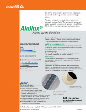 Gaz Alulinx® został specjalnie opracowany jako najlepszy gaz osłonowy do jakościowego spawania aluminium oraz jego stopów. Najwyższe wymagania wymuszają stosowanie starannie dobranych gazów, jak Alulinx®. Ten gaz ma wiele zastosowań, ale jest szczególnie przeznaczony do spawania metodą MIG oraz TIG aluminium i jego stopów, praktycznie o każdej grubości. Alulinx Jedyny gaz do aluminium ® Gaz osłonowy Alulinx® zapewnia znakomitą spawalność, połączoną z dużą prędkością spawania – nawet do 35% wyższą w porównaniu z argonem. A równocześnie poprawia warunki pracy, dzięki niższej emisji ozonu. Średnia ręcznego Average prędkość weld speedspawania for manual MIG andmetodą TIG welding MIG orazthick TIG blachy 10mm ze plate stopu aluminium of 10mm aluminium alloy 100 200 300 400 500 600 81 109 439 545 mm/min mm/min TIGargon argon TIG ® ® Plus (35% speed increase) TIG Alulinx Alumaxx TIG (prędkość wyższa o 35%) MIGargon argon MIG ® ® MIG Alulinx Alumaxx Plus (24%wyższa speed oincrease) MIG (prędkość 24%) Average emisja ozone exposure forręcznym manual MIG welding Średnia ozonu przy spawaniu metodą aluminium 5%stopu magnesium alloy plate (spray transfer) MIG blach ze AlMg5 (przenoszenie natryskowe) 0.04 0.08 0.12 0.16 0.20* Jakie przynosi korzyści: Przy najwyższych wymaganiach jakościowych zjawisko porowatości spoin może stanowić problem. Jego rozwiązaniem jest zastosowanie gazu Alulinx®, zawierającego odpowiedni dodatek helu. Wyższa wydajność Gaz osłonowy Alulinx® zapewnia wyższą prędkość spawania ręcznego – do 24% przy metodzie MIG i do 35% przy metodzie TIG. Wyższa jakość Gaz osłonowy Alulinx® jest łatwy w użyciu, zapewnia wyjątkowo niską porowatość spoin i doskonały profil wtopienia. To oznacza wyższą jakość połączeń i mniej wad. Lepsze warunki pracy ozone exposure emisja ozonu (ppm) (ppm) argon ® Alumaxx Alulinx® Plus * Occupational Standard for ozone min. ref. period) *) NDS dlaExposure ozonu (czas ekspozycji 15(15 min) Ponieważ ozon jest czynnikiem szkodliwym, który nie zawsze zostaje usunięty przez system wentylacyjny, firma Air Products opracowała gaz osłonowy obniżający emisję ozonu podczas spawania. W rezultacie uzyskano poprawę warunków pracy, oraz wyższą jakość i wydajność. Alulinx ® Najlepszy i jedyny gaz do spawania aluminium • podnosi jakość spoin i obniża ilość wad dzięki doskonałemu wtopieniu, niskiej porowatości i gładkości lica. Równocześnie ułatwia zajarzenie łuku w metodzie TIG • podwyższa wydajność spawania w porównaniu z argonem – do 24% przy metodzie MIG i do 35% przy metodzie TIG • o wielu zastosowaniach (metoda MIG oraz TIG, do każdej grubości i rodzaju przenoszenia metalu w łuku) • poprawia warunki pracy, dzięki niższej emisji ozonu • pozwala obniżyć ilość butli w zapasie spoina pachwinowa wykonana metodą MIG z użyciem gazu Alulinx® (blacha 10 mm, stop Al 4140) spoina czołowa wykonana metodą TIG z użyciem gazu Alulinx® (blacha 10 mm, stop Al 4140) tell me more www.airproducts.com.pl/ spawalnictwo Air Products Sp. z o.o., ul. Pory 59, 02-757 Warszawa. Infolinia 0 801 100 107 Air Products and Chemical, Inc. 2008 (EU000696) 231-09-098-PL