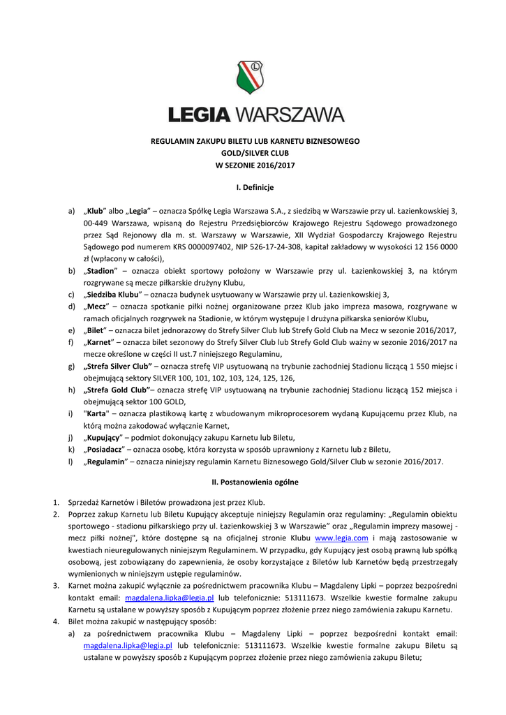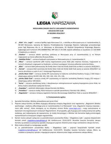 REGULAMIN ZAKUPU BILETU LUB KARNETU BIZNESOWEGO GOLD/SILVER CLUB W SEZONIE 2016/2017 I. Definicje a) „Klub” albo „Legia” – oznacza Spółkę Legia Warszawa S.A., z siedzibą w Warszawie przy ul. Łazienkowskiej 3, 00-449 Warszawa, wpisaną do Rejestru Przedsiębiorców Krajowego Rejestru Sądowego prowadzonego przez Sąd Rejonowy dla m. st. Warszawy w Warszawie, XII Wydział Gospodarczy Krajowego Rejestru Sądowego pod numerem KRS 0000097402, NIP 526-17-24-308, kapitał zakładowy w wysokości 12 156 0000 zł (wpłacony w całości), b) „Stadion” – oznacza obiekt sportowy położony w Warszawie przy ul. Łazienkowskiej 3, na którym rozgrywane są mecze piłkarskie drużyny Klubu, c) „Siedziba Klubu” – oznacza budynek usytuowany w Warszawie przy ul. Łazienkowskiej 3, d) „Mecz” – oznacza spotkanie piłki nożnej organizowane przez Klub jako impreza masowa, rozgrywane w ramach oficjalnych rozgrywek na Stadionie, w którym występuje I drużyna piłkarska seniorów Klubu, e) „Bilet” – oznacza bilet jednorazowy do Strefy Silver Club lub Strefy Gold Club na Mecz w sezonie 2016/2017, f) „Karnet” – oznacza bilet sezonowy do Strefy Silver Club lub Strefy Gold Club ważny w sezonie 2016/2017 na mecze określone w części II ust.7 niniejszego Regulaminu, g) „Strefa Silver Club” – oznacza strefę VIP usytuowaną na trybunie zachodniej Stadionu liczącą 1 550 miejsc i obejmującą sektory SILVER 100, 101, 102, 103, 124, 125, 126, h) „Strefa Gold Club”– oznacza strefę VIP usytuowaną na trybunie zachodniej Stadionu liczącą 152 miejsca i obejmującą sektor 100 GOLD, i) "Karta" – oznacza plastikową kartę z wbudowanym mikroprocesorem wydaną Kupującemu przez Klub, na którą można zakodować wyłącznie Karnet, j) „Kupujący” – podmiot dokonujący zakupu Karnetu lub Biletu, k) „Posiadacz” – oznacza osobę, która korzysta w sposób uprawniony z Karnetu lub z Biletu, l) „Regulamin” – oznacza niniejszy regulamin Karnetu Biznesowego Gold/Silver Club w sezonie 2016/2017. II. Postanowienia ogólne 1. 2. 3. 4. Sprzedaż Karnetów i Biletów prowadzona jest przez Klub. Poprzez zakup Karnetu lub Biletu Kupujący akceptuje niniejszy Regulamin oraz regulaminy: „Regulamin obiektu sportowego - stadionu piłkarskiego przy ul. Łazienkowskiej 3 w Warszawie” oraz „Regulamin imprezy masowej mecz piłki nożnej", które dostępne są na oficjalnej stronie Klubu www.legia.com i mają zastosowanie w kwestiach nieuregulowanych niniejszym Regulaminem. W przypadku, gdy Kupujący jest osobą prawną lub spółką osobową, jest zobowiązany do zapewnienia, że osoby korzystające z Biletów lub Karnetów będą przestrzegały wymienionych w niniejszym ustępie regulaminów. Karnet można zakupić wyłącznie za pośrednictwem pracownika Klubu – Magdaleny Lipki – poprzez bezpośredni kontakt email: [email protected] lub telefonicznie: 513111673. Wszelkie kwestie formalne zakupu Karnetu są ustalane w powyższy sposób z Kupującym poprzez złożenie przez niego zamówienia zakupu Karnetu. Bilet można zakupić w następujący sposób: a) za pośrednictwem pracownika Klubu – Magdaleny Lipki – poprzez bezpośredni kontakt email: [email protected] lub telefonicznie: 513111673. Wszelkie kwestie formalne zakupu Biletu są ustalane w powyższy sposób z Kupującym poprzez złożenie przez niego zamówienia zakupu Biletu; b) poprzez transakcję online za pośrednictwem oficjalnej strony Klubu www.legia.com; c) w kasach Klubu przy ul. Łazienkowskiej 3 w Warszawie. 5. 6. 7. 8. 9. 10. 11. 12. 13. 14. 15. Ceny Karnetów i Biletów dostępne będą na stronie www.legia.com oraz biznes.legia.com. Wskazane w zdaniu poprzednim ceny Karnetów i Biletów określone są w złotych polskich i zawierają podatek VAT. Po uprzednim ustaleniu z Klubem Kupujący może otrzymać bilety na pojedyncze spotkania objęte Karnetem lub Kartę z zakodowanym Karnetem. W przypadku biletów na pojedyncze spotkania objętych Karnetem będą one przesyłane do Kupującego drogą elektroniczną na wskazany przez niego adres mailowy, w formie do samodzielnego wydruku. Karnet obowiązuje na mecze piłki nożnej I drużyny seniorów Klubu w ramach rozgrywek o mistrzostwo Ekstraklasy, Puchar Polski oraz w kwalifikacjach i fazach grupowych Ligi Europy oraz w kwalifikacjach Ligi Mistrzów, organizowanych oraz przeprowadzanych przez Klub jako impreza masowana Stadionie. Kupujący nie może bez zgody Klubu sprzedać Karnetu lub Biletu osobie trzeciej. W przypadku, gdy Kupujący jest osobą prawną lub spółką osobową może udostępnić Karnet lub Bilet nieodpłatnie wyłącznie swoim pracownikom, klientom lub gościom, bez prawa ich dalszego przekazywania przez te osoby osobom trzecim, pod następującymi warunkami: a) wcześniejszego zgłoszenia tego faktu Klubowi podając imię, nazwisko oraz nr PESEL tej osoby poprzez specjalny formularz https://it.legia.pl/vip; powiadomienie Klubu powinno nastąpić zgodnie z częścią V ust. 2 niniejszego Regulaminu. b) poinformowania przez Kupującego osoby, której udostępnia Karnet lub Bilet o treści niniejszego Regulaminu, „Regulaminu obiektu sportowego - stadionu piłkarskiego przy ul. Łazienkowskiej 3” oraz „Regulaminu imprezy masowej - mecz piłki nożnej". Kupujący ponosi odpowiedzialność za działania osób, którym udostępnił Karnet lub Bilet jak za działania własne. Wejście na Mecz objęty Biletem lub Karnetem następuje na podstawie wydrukowanego Biletu lub Karty z zakodowanym Karnetem. Karnet lub Bilet ważny jest wyłącznie wraz z dokumentem potwierdzającym tożsamość. Przy wejściu na Stadion, oprócz ważnego Karnetu lub Biletu, należy okazać ważny dokument potwierdzający tożsamość. Po wejściu na Stadion przez bramki systemu dostępowego Karnet lub Bilet uznaje się za wykorzystany na danym Meczu. Wykorzystany w danym Meczu Karnet lub Bilet nie uprawnia do ponownego wejścia na teren impre
