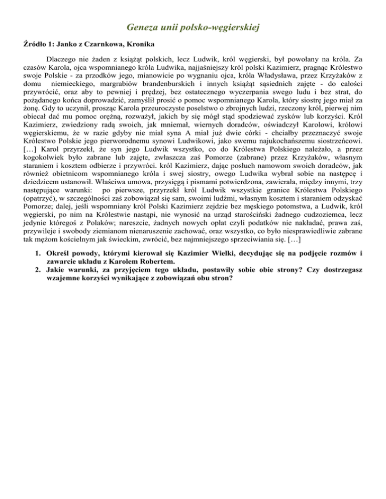 Geneza unii polsko-węgierskiej Źródło 1: Janko z Czarnkowa, Kronika Dlaczego nie żaden z książąt polskich, lecz Ludwik, król węgierski, był powołany na króla. Za czasów Karola, ojca wspomnianego króla Ludwika, najjaśniejszy król polski Kazimierz, pragnąc Królestwo swoje Polskie - za przodków jego, mianowicie po wygnaniu ojca, króla Władysława, przez Krzyżaków z domu niemieckiego, margrabiów brandenburskich i innych książąt sąsiednich zajęte - do całości przywrócić, oraz aby to pewniej i prędzej, bez ostatecznego wyczerpania swego ludu i bez strat, do pożądanego końca doprowadzić, zamyślił prosić o pomoc wspomnianego Karola, który siostrę jego miał za żonę. Gdy to uczynił, prosząc Karola przeuroczyste poselstwo o zbrojnych ludzi, rzeczony król, pierwej nim obiecał dać mu pomoc orężną, rozważył, jakich by się mógł stąd spodziewać zysków lub korzyści. Król Kazimierz, zwiedziony radą swoich, jak mniemał, wiernych doradców, oświadczył Karolowi, królowi węgierskiemu, że w razie gdyby nie miał syna A miał już dwie córki - chciałby przeznaczyć swoje Królestwo Polskie jego pierworodnemu synowi Ludwikowi, jako swemu najukochańszemu siostrzeńcowi. […] Karol przyrzekł, że syn jego Ludwik wszystko, co do Królestwa Polskiego należało, a przez kogokolwiek było zabrane lub zajęte, zwłaszcza zaś Pomorze (zabrane) przez Krzyżaków, własnym staraniem i kosztem odbierze i przywróci. król Kazimierz, dając posłuch namowom swoich doradców, jak również obietnicom wspomnianego króla i swej siostry, owego Ludwika wybrał sobie na następcę i dziedzicem ustanowił. Właściwa umowa, przysięgą i pismami potwierdzona, zawierała, między innymi, trzy następujące warunki: po pierwsze, przyrzekł król Ludwik wszystkie granice Królestwa Polskiego (opatrzyć), w szczególności zaś zobowiązał się sam, swoimi ludźmi, własnym kosztem i staraniem odzyskać Pomorze; dalej, jeśli wspomniany król Polski Kazimierz zejdzie bez męskiego potomstwa, a Ludwik, król węgierski, po nim na Królestwie nastąpi, nie wynosić na urząd starościński żadnego cudzoziemca, lecz jedynie któregoś z Polaków; nareszcie, żadnych nowych opłat czyli podatków nie nakładać, prawa zaś, przywileje i swobody ziemianom nienaruszenie zachować, oraz wszystko, co było niesprawiedliwie zabrane tak mężom kościelnym jak świeckim, zwrócić, bez najmniejszego sprzeciwiania się. […] 1. Określ powody, którymi kierował się Kazimier Wielki, decydując się na podjęcie rozmów i zawarcie układu z Karolem Robertem. 2. Jakie warunki, za przyjęciem tego układu, postawiły sobie obie strony? Czy dostrzegasz wzajemne korzyści wynikające z zobowiązań obu stron? Unia w Krewie Źródło 2: Umowa w Krewie – 14 sierpnia 1385 r. My Jagiełło, z mocy boskiej wielki książę litewski, Rusi pan i dziedzic przyrodzony, oznajmujemy wszystkim, komu należy, a którzy niniejsze pismo widzieć będą, to, o czem nas powiadomili ze strony najjaśniejszej pani, z bożej łaski, królowej węgierskiej, polskiej, dalmackiej […] Naprzód tedy powiedzieli, jako oświecony książę litewski, Jagiełło, wyprawił swoich uroczystych posłów najpierw do panów ziemian polskich, a następnie do jej królewskiego majestatu. […]„Wielu cesarzów, królów i różnych książąt pragnęło wejść w stałe stosunki pokrewieństwa z tymże wielkim księciem litewskim; lecz Bóg wszechmogący zachował to dla osoby waszej królewskiej mości. Przeto, najjaśniejsza pani, spełnij to zbawienne polecenie, przyjmij wielkiego księcia Jagiełłę za syna i oddaj mu w małżeństwo najukochańszą córkę swoją, Jadwigę, królowę polską. Ufamy, że z tego związku wyniknie chwała Bogu, zbawienie duszom, cześć ludziom a pomnożenie królestwu. Nim zaś to, o czem mowa, do końca stosownego dojdzie, wielki książę Jagiełło ze wszystkimi swoimi braćmi, jeszcze nie ochrzczonymi, tudzież z krewnymi, ze szlachtą, ziemianami większymi i mniejszymi, w ziemiach jego zamieszkałymi, chce, życzy i pragnie przyjąć wiarę katolicką świętego Rzymskiego Kościoła. […]Na oczywistość i moc tego, obiecuje wielki książę Jagiełło złożyć i wydać wszystkie swoje skarby dla odzyskania utrat, które poniosły tak Polska jak Litwa, jeżeli tylko królowa węgierska córkę swoją, Jadwigę, królowę polską, ślubem małżeńskim z nim skojarzy. Wielki książę Jagiełło obiecuje sumę, zaręczoną między królową węgierską a księciem Austryi, mianowicie dwakroć sto tysięcy florenów, złożyć i wypłacić. Tenże wielki książę Jagiełło obiecuje i zaręcza własnym kosztem i staraniem przywrócić królestwu polskiemu wszystkie kraje, przez kogokolwiek oderwane od niego i zabrane. Tenże wielki książę Jagiełło obiecuje wrócić pierwotną wolność wszystkim chrześcijanom, zwłaszcza ludziom obojej płci, z ziemi polskiej, obyczajem wojennym zabranym i przesiedlonym, a to tak, że każdy lub każda będzie się mógł udać tam, gdzie będzie chciał. Nareszcie tenże wielki książę Jagiełło obiecuje ziemie swoje litewskie i ruskie na wieczne czasy do korony Królestwa Polskiego przyłączyć” Dan w Krewie, w poniedziałek, w wigilię Wniebowzięcia Najświętszej Maryi Panny [14 VIII] roku Pańskiego 1385 . 1. Do kogo skierowany jest ten list? Jakie związki pokrewieństwa łączą wymienioną tu królową Węgier z Jadwigą koronowaną na króla Polski? 2. Wymień zobowiązania Jagiełły wobec Królestwa Polskiego, wynikające z zawartego układu. 3. W jaki sposób rozwiązano problem wcześniejszych układów dotyczących małżeństwa Jadwigi z księciem Wilhelmem? Kto ponosił koszty zerwania układu? ANALIZA TEKSTÓW DLA CHĘTNYCH NA OCENĘ CELUJĄCĄ! Jadwiga i Jagiełło Źródło 3: Jan Długosz „Roczniki czyli kroniki sławnego Królestwa polskiego”, rok pański 1385. Głoszono nadto i lic