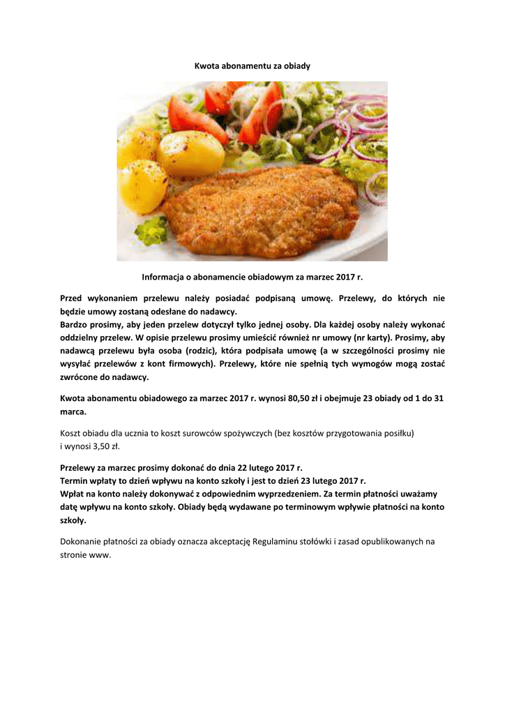 Kwota abonamentu za obiady Informacja o abonamencie obiadowym za marzec 2017 r. Przed wykonaniem przelewu należy posiadać podpisaną umowę. Przelewy, do których nie będzie umowy zostaną odesłane do nadawcy. Bardzo prosimy, aby jeden przelew dotyczył tylko jednej osoby. Dla każdej osoby należy wykonać oddzielny przelew. W opisie przelewu prosimy umieścić również nr umowy (nr karty). Prosimy, aby nadawcą przelewu była osoba (rodzic), która podpisała umowę (a w szczególności prosimy nie wysyłać przelewów z kont firmowych). Przelewy, które nie spełnią tych wymogów mogą zostać zwrócone do nadawcy. Kwota abonamentu obiadowego za marzec 2017 r. wynosi 80,50 zł i obejmuje 23 obiady od 1 do 31 marca. Koszt obiadu dla ucznia to koszt surowców spożywczych (bez kosztów przygotowania posiłku) i wynosi 3,50 zł. Przelewy za marzec prosimy dokonać do dnia 22 lutego 2017 r. Termin wpłaty to dzień wpływu na konto szkoły i jest to dzień 23 lutego 2017 r. Wpłat na konto należy dokonywać z odpowiednim wyprzedzeniem. Za termin płatności uważamy datę wpływu na konto szkoły. Obiady będą wydawane po terminowym wpływie płatności na konto szkoły. Dokonanie płatności za obiady oznacza akceptację Regulaminu stołówki i zasad opublikowanych na stronie www.