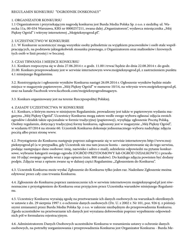 REGULAMIN KONKURSU ”OGRODNIK DOSKONAŁY” 1. ORGANIZATOR KONKURSU 1.1 Organizatorem i przyrzekającym nagrodę konkursu jest Burda Media Polska Sp. z o.o. z siedzibą: ul. Warecka 11a, 00-034 Warszawa, KRS nr 0000257211, zwana dalej „Organizatorem”, wydawca miesięcznika „Mój Piękny Ogród” i witryny internetowej „Mojpieknyogrod.pl”. 2. UCZESTNICTWO W KONKURSIE 2.1. W Konkursie uczestniczyć mogą wszystkie osoby pełnoletnie za wyjątkiem pracowników i osób stale współpracujących, na podstawie jakiegokolwiek stosunku prawnego, z Organizatorem oraz małżonków i krewnych tych osób w linii prostej i w bocznej. 3. CZAS TRWANIA I MIEJSCE KONKURSU 3.1. Konkurs rozpoczyna się w dniu 27.06.2014 r. o godz. 11.00 i trwać będzie do dnia 22.08.2014 r. do godz. 21.00. Konkurs przeprowadzany jest w serwisie internetowym www.mojpieknyogrod.pl, z zastrzeżeniem punktu 4.1 niniejszego Regulaminu. 3.2. Rozstrzygnięcie i ogłoszenie wyników Konkursu nastąpi 26.09.2014 r. Ogłoszenie wyników będzie miało miejsce w magazynie papierowym „Mój Piękny Ogród” w numerze 10/14, na witrynie www.mojpieknyogrod.pl, oraz na kanale Facebook www.facebook.com/mojpieknyogrodmagazyn. 3.3. Konkurs organizowany jest na terenie Rzeczpospolitej Polskiej. 4. ZASADY UCZESTNICTWA W KONKURSIE 4.1. Konkurs, o którym mowa w niniejszym Regulaminie, prowadzony jest także w papierowym wydaniu magazynu „Mój Piękny Ogród”. Uczestnicy Konkursu mogą zatem wedle swego wyboru zgłaszać zdjęcia swoich ogrodów i działek także opcjonalnie w formie tradycyjnej (papierowej), wysyłając zgłoszenie Pocztą Polską. Osobny regulamin, dotyczący tradycyjnej formy konkursu, ogłoszony jest w magazynie „Mój Piękny Ogród”, w wydaniu 07/2014 na stronie 60. Uczestnik Konkursu dokonuje jednoznacznego wyboru nadsyłając zdjęcia pocztą albo przez stronę www. 4.2. Przystąpienie do Konkursu następuje poprzez zalogowanie się w serwisie internetowym http://www.mojpieknyogrod.pl (a w przypadku, gdy Uczestnik nie ma tam jeszcze konta – zarejestrowanie się do tego serwisu, podając następujące dane osobowe: imię, nazwisko i adres e-mail), udzielenie odpowiedzi na pytanie konkursowe, wybranie kategorii swojego ogrodu (OGRÓD PRZYDOMOWY lub OGRÓD DZIAŁKOWY) i przesłanie 10 zdjęć swojego ogrodu wraz z jego opisem (min. 800 znaków). Do każdego zdjęcia powinien być dodany podpis. Zdjęcia wraz z opisem zwane są w dalszej części Regulaminu „Zgłoszeniem do Konkursu”. 4.3. Uczestnik Konkursu może wysłać Zgłoszenie do Konkursu tylko jeden raz. Nadesłane Zgłoszenie można edytować przez cały czas trwania Konkursu. 4.4. Zgłoszenie do Konkursu poprzez zamieszczenie ich w serwisie internetowym mojpieknyogrod.pl jest równoznaczne z przystąpieniem do Konkursu oraz przyjęciem przez Uczestnika warunków niniejszego Regulaminu. 4.5. Uczestnicy Konkursu wyrażają zgodę na przetwarzanie ich danych osobowych na warunkach określonych w ustawie z dn. 29 sierpnia 1997 r. o ochronie danych osobowych (Dz. U. z 2002 r. Nr 101, poz. 926 tj. z późniejszymi zmianami) przez Burda Media Polska Sp. z o.o. w zakresie niezbędnym do przeprowadzenia Konkursu. Zgoda uczestników na przetwarzanie ich danych jest wyrażana dobrowolnie poprzez wypełnienie odpowiednich pól w formularzu rejestracyjnym. 4.6. Administratorem Danych Osobowych uczestników Konkursu w rozumieniu ustawy o ochronie danych osobowych, na potrzeby zorganizowania i przeprowadzenia Konkursu jest Organizator Konkursu - Burda Me- dia Polska Sp. z o.o. . 4.7. Zakres przetwarzania danych osobowych: - imię - nazwisko - miejsce zamieszkania - adres e-mail 4.8. Celem przetwarzania danych osobowych jest realizacja Konkursu i wysyłka nagród. 4.9. Uczestnicy Konkursu mają prawo do wglądu do swoich danych osobowych oraz ich poprawiania, aktualizacji, uzupełniania i usuwania. Prawo to może być wykonane poprzez przesłanie odpowiedniego wniosku w formie pisemnej na adres Burda Media Polska Sp. z o.o., ul. Warecka 11a, 00-034 Warszawa z dopiskiem „OGRODNIK DOSKONAŁY”. 4.10. Uczestnik jest zobowiązany niezwłocznie powiadomić Organizatora o zmianie adresu lub innych danych podanych w formularzu rejestracyjnym. 4.11. Nadesłanie zdjęć i opisów jest jednocześnie wyrażeniem zgody na ich publikację bezterminowo na obszarze Polski i poza jej granicami, w ramach działalności prowadzonej przez Burda Media Polska Sp. z o.o. oraz spółki powiązane z nią kapitałowo lub osobowo. 4.12. Przez zgłoszenie zdjęć Uczestnik oświadcza, że jest ich autorem oraz, że nie narusza przepisów prawa, ani prawem chronionych dóbr osób trzecich i zobowiązuje się zwolnić Organizatora z odpowiedzialności za naruszenie praw osób trzecich. 4.13. W przypadku naruszenia zakazów wskazanych w punkcie 4.12, Zgłoszenie do Konkursu zostanie usunięte z witryn, o których mowa w punkcie 4.11 Regulaminu. 5. ZASADY WYŁONIENIA ZWYCIĘZCÓW I OFEROWANE NAGRODY 5.1. Nagrodzeni Uczestnicy poinformowani zostaną przez Organizatora o przyznaniu im nagród drogą e-mailową. 5.2. Nagrodami w Konkursie są: 1) W kategorii OGRÓD PRZYDOMOWY: Nagrody główne: Zestaw mebli ogrodowych Master grill&party Bahia. Wartość nagrody to 2800 zł. Kosiarka spalinowa NAC JL 56Z C3. Wartość nagrody to 1560 zł. Zestaw narzędzi ogrodniczych Fiskars: dźwigniowe nożyce do trawy i żywopłotu, sekator z rączką obrotową PowerGearTM, dźwigniowe nożyce do żywopłotu PowerGearTM Steel, piła do gałęzi (S) XtractTM SW 73, dwuręczny sekator nożycowy PowerGearTM Steel i piła do gałęzi (L) XtractTM SW 75. Wartość nagrody to ok. 1073 zł. Wyróżnienia: 1 zestaw Explorer marki Cellfast: wózek Explorer, wąż ogrodowy Multiflex ½’’, zestaw ze zraszaczem pistoletowym Jet, zestaw przyłączeniowy Multiflex. Wartość nagrody to ok. 500 zł. 10 zestawów preparatów owadobójczych marki Bayer: Calypso, Calypso AL, Decis Ogród, Zato, Teldor. Warto