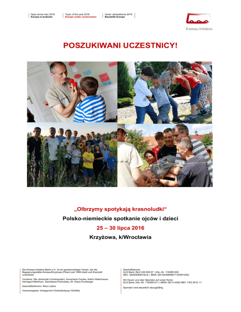 Nasz temat roku 2016 Europa w budowie Topic of the year 2016 Europe under construction Unser Jahresthema 2016 Baustelle Europa POSZUKIWANI UCZESTNICY! „Olbrzymy spotykają krasnoludki“ Polsko-niemieckie spotkanie ojców i dzieci 25 – 30 lipca 2016 Krzyżowa, k/Wrocławia Die Kreisau-Initiative Berlin e.V. ist ein gemeinnütziger Verein, der die Begegnungsstätte Kreisau/Krzyżowa (Polen) seit 1989 ideell und finanziell unterstützt. Geschäftskonto GLS Bank | BLZ 430 609 67 | Kto.-Nr. 1163951200 (BIC: GENODEM1GLS | IBAN: DE19430609671163951200) Vorstand: Ole Jantschek (Vorsitzender), Annemarie Cordes, Katrin Hattenhauer, Heimgard Mehlhorn, Stanisława Piotrowska, Dr. Klaus Pumberger Wir freuen uns über Spenden auf unser Konto GLS Bank | Kto.-Nr. 1163951211 | IBAN: DE13 4306 0967 1163 9512 11 Geschäftsführerin: Nina Lüders Vereinsregister: Amtsgericht Charlottenburg 10244Nz Spenden sind steuerlich abzugsfähig. Nasz temat roku 2016 Europa w budowie Topic of the year 2016 Europe under construction Unser Jahresthema 2016 Baustelle Europa „OLBRZYMY SPOTYKAJĄ KRASNOLUDKI“ Stowarzyszenie Kreisau-Initiative zaprasza ojców i dzieci do udziału w polsko-niemieckim spotkaniu! Co? Od 2008 roku ojcowie i ich dzieci spotykają się w Krzyżowej, by w polskoniemieckich grupach lepiej się poznać, wymienić doświadczeniami z codziennego życia rodzinnego i podyskutować o relacjach łączących „olbrzymy” i „krasnoludki”. Wiele czasu dzieci i ojcowie spędzają razem, współzawodnicząc w olimpiadach, wspinając się na najwyższy szczyt w okolicy w poszukiwaniu skarbu, przygotowując ognisko czy wpadając na trop krasnoludków w pobliskim Wrocławiu. Jest także chwila na refleksję podczas osobnych zajęć dla ojców i dzieci – pozwala to omówić nowe przeżycia i przenieść je do codzienności własnej rodziny. Dlaczego? Spotkanie „Olbrzymy spotykają krasnoludki” wspiera mężczyzn w roli ojców, a dzieci w rozwoju poczucia własnej wartości, wiary we własne siły, możliwości i umiejętności, a także w poznawaniu swoich praw. Poza tym chcemy włączyć uczestników w budowanie polsko-niemieckiego porozumienia. Kiedy? Od 25 do 30 lipca 2016 Gdzie? Międzynarodowy Dom Spotkań Młodzieży w Krzyżowej (k/Wrocławia) Kto? 10 rodzin (ojcowie i dzieci w wieku od 8 do 12 lat), łącznie ok. 25 osób Koszty? 800 PLN dla ojców, 200 PLN dla każdego dziecka (opłata soldarnościowa) 450 PLN dla ojców, 100 PLN dla każdego dziecka (opłata normalna) 250 PLN dla ojców, 50 PLN dla każdego dziecka (opłata ulgowa) Opłata za uczestnictwo zgodnie z możliwościami finansowymi. Obejmuje zakwaterowanie i pełne wyżywienie, program, wycieczki oraz wszystkie atrakcje na miejscu. Koszty podróży uczestnicy pokrywają sami. Aby się zgłosić, prosimy wypełnić formularz zgłoszeniowy na stronie internetowej KreisauInitiative do 30 kwietnia 2016r: www.kreisau.de. W razie jakichkolwiek pytań prosimy o kontakt z koordynatorem projektu, Patrykiem Grudzińskim: [email protected], (030) 53 89 38 63 94. 2 Nasz temat roku 2016 Europa w budowie Topic of the year 2016 Europe under construction Unser Jahresthema 2016 Baustelle Europa Program (z zastrzeżeniem zmian) Poniedziałek, 25 lipca Do godz.16:00 Przyjazd uczestników Popołudnie Integracja grupy Wieczór Spacer i ognisko Wtorek, 26 lipca Przedpołudnie Warsztat teatralny z grupą Jubilo Popołudnie Warsztat teatralny z grupą Jubilo (cz. II) Wieczór Wspólny czas na refleksję / nocna wędrówka Środa, 27 lipca Przedpołudnie Wędrówka z przygodami Popołudnie Wędrówka z przygodami (cz. II) / czas na refleksję dla dzieci i ojców Wieczór Gry i zabawy Czwartek, 28 lipca Przedpołudnie Wycieczka do Wrocławia: Poszukiwanie Pana X Popołudnie Czas wolny we Wrocławiu Wieczór Czas na refleksję dla dzieci i ojców Piątek, 29 lipca Przedpołudnie Maszyna „Latające Jajko” z podchodami Popołudnie Czas na refleksję dla dzieci i ojców / wspólne gotowanie Wieczór Zabawa pożegnalna Sobota, 30 lipca Przedpołudnie Ewaluacja i zakończenie Ok. godz. 12:00 Odjazd uczestników 3