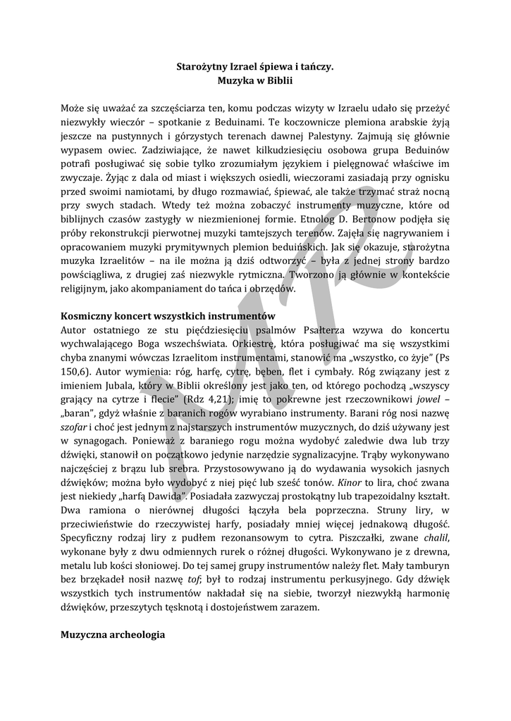 Starożytny Izrael śpiewa i tańczy. Muzyka w Biblii Może się uważać za szczęściarza ten, komu podczas wizyty w Izraelu udało się przeżyć niezwykły wieczór – spotkanie z Beduinami. Te koczownicze plemiona arabskie żyją jeszcze na pustynnych i górzystych terenach dawnej Palestyny. Zajmują się głównie wypasem owiec. Zadziwiające, że nawet kilkudziesięciu osobowa grupa Beduinów potrafi posługiwać się sobie tylko zrozumiałym językiem i pielęgnować właściwe im zwyczaje. Żyjąc z dala od miast i większych osiedli, wieczorami zasiadają przy ognisku przed swoimi namiotami, by długo rozmawiać, śpiewać, ale także trzymać straż nocną przy swych stadach. Wtedy też można zobaczyć instrumenty muzyczne, które od biblijnych czasów zastygły w niezmienionej formie. Etnolog D. Bertonow podjęła się próby rekonstrukcji pierwotnej muzyki tamtejszych terenów. Zajęła się nagrywaniem i opracowaniem muzyki prymitywnych plemion beduińskich. Jak się okazuje, starożytna muzyka Izraelitów – na ile można ją dziś odtworzyć – była z jednej strony bardzo powściągliwa, z drugiej zaś niezwykle rytmiczna. Tworzono ją głównie w kontekście religijnym, jako akompaniament do tańca i obrzędów. Kosmiczny koncert wszystkich instrumentów Autor ostatniego ze stu pięćdziesięciu psalmów Psałterza wzywa do koncertu wychwalającego Boga wszechświata. Orkiestrę, która posługiwać ma się wszystkimi chyba znanymi wówczas Izraelitom instrumentami, stanowić ma „wszystko, co żyje” (Ps 150,6). Autor wymienia: róg, harfę, cytrę, bęben, flet i cymbały. Róg związany jest z imieniem Jubala, który w Biblii określony jest jako ten, od którego pochodzą „wszyscy grający na cytrze i flecie” (Rdz 4,21); imię to pokrewne jest rzeczownikowi jowel – „baran”, gdyż właśnie z baranich rogów wyrabiano instrumenty. Barani róg nosi nazwę szofar i choć jest jednym z najstarszych instrumentów muzycznych, do dziś używany jest w synagogach. Ponieważ z baraniego rogu można wydobyć zaledwie dwa lub trzy dźwięki, stanowił on początkowo jedynie narzędzie sygnalizacyjne. Trąby wykonywano najczęściej z brązu lub srebra. Przystosowywano ją do wydawania wysokich jasnych dźwięków; można było wydobyć z niej pięć lub sześć tonów. Kinor to lira, choć zwana jest niekiedy „harfą Dawida”. Posiadała zazwyczaj prostokątny lub trapezoidalny kształt. Dwa ramiona o nierównej długości łączyła bela poprzeczna. Struny liry, w przeciwieństwie do rzeczywistej harfy, posiadały mniej więcej jednakową długość. Specyficzny rodzaj liry z pudłem rezonansowym to cytra. Piszczałki, zwane chalil, wykonane były z dwu odmiennych rurek o różnej długości. Wykonywano je z drewna, metalu lub kości słoniowej. Do tej samej grupy instrumentów należy flet. Mały tamburyn bez brzękadeł nosił nazwę tof; był to rodzaj instrumentu perkusyjnego. Gdy dźwięk wszystkich tych instrumentów nakładał się na siebie, tworzył niezwykłą harmonię dźwięków, przeszytych tęsknotą i dostojeństwem zarazem. Muzyczna archeologia Muzyka dawnych Izraelitów zakotwiczona była przypuszczalnie w tradycjach muzycznych Babilonii i Egiptu. Abraham przywędrował w XIX stuleciu przed Chr. do Kanaanu z Ur Chaldejskiego. Właśnie w Ur Woolley dokonał niezwykłego odkrycia archeologicznego: z jednej z grot położonej obok grobowca królewskiego wydobyto cztery wspaniale zdobione harfy. Instrumenty służyły nie tylko tworzeniu muzyki; same w sobie stanowiły niezrównane dzieło sztuki. Inkrustowany panel przedstawiał typowy dla starożytności motyw muzyczny – orkiestrę zwierząt: grający na lirze osioł, tańczący niedźwiedź i szakal wybijający rytm na tamburynie. A trzeba pamiętać, że już tysiąc lat przed Abrahamem na religijnych zgromadzeniach i podczas uczt posługiwano się na terenie Babilonii tamburynami. Poświadcza to odnaleziona podczas wykopalisk pieczęć jednej z chaldejskich władczyń. Tabliczki gliniane z Uruk, które powstały aż na trzy tysiąclecia przed Chr. zawierają znak typowej sumeryjskiej harfy. Posiadała ona kształt czółna. Z tego także okresu pochodzą najstarsze sumeryjskie hymny świątynne i królewskie. W drugim tysiącleciu przed Chr. istniał w Babilonii profesjonalne szkoły muzyczne. Na tabliczkach klinowych z pierwszej połowy drugiego tysiąclecia utrwalono teorię muzyki. Znano wówczas siedem skal muzycznych, z których jedna jest bardzo podobna do naszej skali majorowej. Zapis pierwszego pełnego utwory muzycznego znaleziono natomiast w Syrii, w Ugarit. Datowany na 1400 rok hymn ku czci bogini księżyca Nikkal opatrzony został adnotacją z nazwą interwału. Równie stara jak babilońska jest tradycja muzyczna Egiptu. Wiele instrumentów ze starożytnych czasów przetrwało do dnia dzisiejszego. Są wśród nich harfy, lutnie, liry i trąbki, podłużne flety, piszczałki wycięte z trzciny, bębny, cymbały, dzwonki, grzechotki i kołatki. Stanowią one znakomity materiał porównawczy do studiów nad muzyką dawnych Babilończyków. Początki muzykoterapii Król Dawid, który objął panowanie nad Izraelitami na dziesięć wieków przed Chr., znany jest nie tylko jako świetny władca, ale również jako twórca Psałterza. To jemu tradycja przypisuje całą Księgę Psalmów. Jest to oczywiście tylko tradycja, wiele bowiem psalmów powstało wieki później. Nie można jednak zaprzeczyć, że przynajmniej niektóre z nich sięgać mogą kręgów dworskich czasów Dawida. Natchniony autor opowiada zdarzenie, które psychologowie uznali za biblijne początki muzykoterapii. Saula, którego opuścił Duch Pański, „opętał duch zły, zesłany przez Pana” (1Sm 16,14). Z pomocą udręczonemu Saulowi przyszedł właśnie Dawid. Potrafił oddalić złego ducha poprzez dźwięki muzyki: „Kiedy zły duch zesłany przez Boga napadał na Saula, brał Dawid cytrę i gra