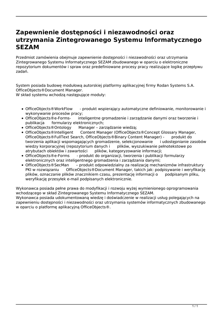 Zapewnienie dostępności i niezawodności oraz utrzymania Zintegrowanego Systemu Informatycznego SEZAM Przedmiot zamówienia obejmuje zapewnienie dostępności i niezawodności oraz utrzymania Zintegrowanego Systemu Informatycznego SEZAM zbudowanego w oparciu o elektroniczne repozytorium dokumentów i spraw oraz predefiniowane procesy pracy realizujące logikę przepływu zadań. System posiada budowę modułową autorskiej platformy aplikacyjnej firmy Rodan Systems S.A. OfficeObjects®Document Manager. W skład systemu wchodzą następujące moduły: OfficeObjects®WorkFlow - produkt wspierający automatyczne definiowanie, monitorowanie i wykonywanie procesów pracy; OfficeObjects®e-Formsinteligentne gromadzenie i zarządzanie danymi oraz tworzenie i publikacja formularzy elektronicznych; OfficeObjects®Ontology Manager – zarządzanie wiedzą; OfficeObjects®Intelligent Content Manager (OfficeObjects®Concept Glossary Manager, OfficeObjects®FullText Search, OfficeObjects®Binary Content Manager) produkt do tworzenia aplikacji wspomagających gromadzenie, selekcjonowanie i udostępnianie zasobów wiedzy korporacyjnej (repozytorium danych i plików, wyszukiwanie pełnotekstowe po atrybutach obiektów i zawartości plików, kategoryzowanie informacji; OfficeObjects®e-Forms - produkt do organizacji, tworzenia i publikacji formularzy elektronicznych oraz inteligentnego gromadzenia i zarządzania danymi; OfficeObjects®SecMan – produkt odpowiedzialny za realizację mechanizmów infrastruktury PKI w rozwiązaniu OfficeObjects®Document Manager, takich jak: podpisywanie i weryfikację plików, oznaczanie plików znacznikiem czasu, prezentację informacji o podpisanym pliku, weryfikację przesyłek e-mail podpisanych elektronicznie. Wykonawca posiada pełne prawa do modyfikacji i rozwoju wyżej wymienionego oprogramowania wchodzącego w skład Zintegrowanego Systemu Informatycznego SEZAM. Wykonawca posiada udokumentowaną wiedzę i doświadczenie w realizacji usług polegających na zapewnieniu dostępności i niezawodności oraz utrzymania systemów informatycznych zbudowanego w oparciu o platformę aplikacyjną OfficeObjects®. 1/1