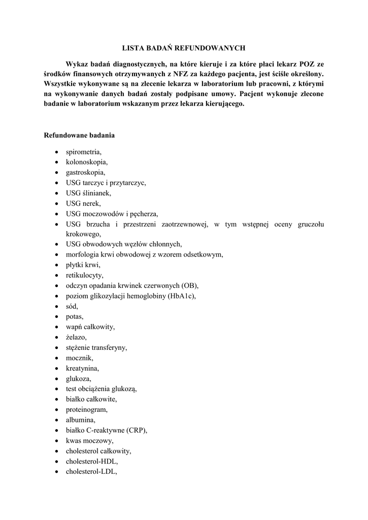 LISTA BADAŃ REFUNDOWANYCH Wykaz badań diagnostycznych, na które kieruje i za które płaci lekarz POZ ze środków finansowych otrzymywanych z NFZ za każdego pacjenta, jest ściśle określony. Wszystkie wykonywane są na zlecenie lekarza w laboratorium lub pracowni, z którymi na wykonywanie danych badań zostały podpisane umowy. Pacjent wykonuje zlecone badanie w laboratorium wskazanym przez lekarza kierującego. Refundowane badania spirometria, kolonoskopia, gastroskopia, USG tarczyc i przytarczyc, USG ślinianek, USG nerek, USG moczowodów i pęcherza, USG brzucha i przestrzeni zaotrzewnowej, w tym wstępnej oceny gruczołu krokowego, USG obwodowych węzłów chłonnych, morfologia krwi obwodowej z wzorem odsetkowym, płytki krwi, retikulocyty, odczyn opadania krwinek czerwonych (OB), poziom glikozylacji hemoglobiny (HbA1c), sód, potas, wapń całkowity, żelazo, stężenie transferyny, mocznik, kreatynina, glukoza, test obciążenia glukozą, białko całkowite, proteinogram, albumina, białko C-reaktywne (CRP), kwas moczowy, cholesterol całkowity, cholesterol-HDL, cholesterol-LDL, triglicerydy (TG), bilirubina całkowita, bilirubina bezpośrednia, fosfataza alkaliczna (ALP), minotransferaza asparaginianowa (AST), aminotransferaza alaninowa (ALT), gammaglutamylotranspeptydaza (GGT), amylaza, kinaza kreatynowa (CK), fosfataza kwaśna całkowita (ACP), czynnik reumatoidalny (RF), miano antystreptolizyn O (ASO), hormon tyreotropowy (TSH), antygen HBs-AgHBs, VDRL, żelazo - całkowita zdolność wiązania - TIBC, PSA, FT3, FT4, ogólne badanie moczu z oceną mikroskopową osadu, ilościowe oznaczanie białka, ilościowe oznaczanie glukozy, ilościowe oznaczanie wapnia, ilościowe oznaczanie amylazy, badanie ogólne, pasożyty, krew utajona - metodą immunochemiczną. Badania układu krzepnięcia: wskaźnik protrombinowy (INR), czas kaolinowo-kefalinowy (APTT), fibrynogen, posiew moczu z antybiogramem, posiew wymazu z gardła, ogólny posiew kału w kierunku pałeczek Salmonella, Shigella, badanie elektrokardiograficzne (EKG) w spoczynku, zdjęcie RTG klatki piersiowej w projekcji AP i bocznej; zdjęcia RTG kostne – w przypadku kręgosłupa, kończyn i miednicy w projekcji AP i bocznej, zdjęcie RTG czaszki i zatok w projekcji AP i bocznej, zdjęcie RTG płuc, zdjęcie RTG przeglądowe jamy brzusznej.