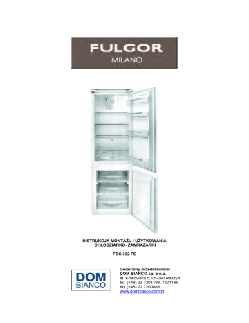 INSTRUKCJA MONTAŻU I UŻYTKOWANIA CHŁODZIARKO- ZAMRAŻARKI FBC 332 FE Generalny przedstawiciel DOM BIANCO sp. z o.o. al. Krakowska 5, 05-090 Raszyn tel. (+48) 22 7201198, 7201199 fax (+48) 22 7200688 www.dombianco.com.pl -2- W imieniu firmy Fulgor-Milano dziękujemy za zaufanie i zakup naszej chłodziarko-zamrażarki. Od 1949 roku nasza firma opracowuje nowe rozwiązania technologiczne i rozszerza swoją ofertę produktową. Jednocześnie stale pracujemy nad podnoszeniem jakości produkowanych urządzeń. Gratulujemy dokonanego wyboru! Zakupione urządzenie będzie Państwu służyć przez wiele lat. Urządzenie jest przeznaczone do użytkowania w indywidualnych gospodarstwach domowych i odpowiada wymaganiom wszystkich obowiązujących w tym zakresie przepisów. Urządzeni wyprodukowano z przeznaczeniem do przechowywania wina w butelkach. Wszelkie inne zastosowania będą uznane za niewłaściwe. Urządzenia Fulgor-Milano wykonane są z różnorodnych materiałów najwyższej jakości. Odcień i faktura powierzchni może nieznacznie różnić się w danym egzemplarzu, jak również w danej grupie kolorystycznej. Nie jest to podstawa do reklamacji produktu. Producent i Generalny przedstawiciel nie ponoszą żadnej odpowiedzialności za szkody i straty wynikłe z niewłaściwego użycia urządzenia. Więcej informacji o ofercie Fulgor na www.dombianco.pl -3 Spis treści 1. Zasady użytkowania 2. Bezpieczeństwo użytkowania 3. Odpowiedzialność za środowisko naturalne 4. Opis urządzenia 5. Wprowadzenie 6. Transport i rozpakowanie 7. Przekładanie drzwi 8. Montaż w szafce 9. Montaż prowadnic 10. Podłączenie elektryczne 11. Użytkowanie 12. Czyszczenie i konserwacja 4 4 5 7 8 9 10 11 12 13 14 20 Więcej informacji o ofercie na www.dombianco.com.pl -41. Zasady użytkowania Niniejsza instrukcja jest integralną częścią urządzenia i z tego względu powinna być przechowywana w jego pobliżu w łatwo dostępnym miejscu przez cały okres użytkowania urządzenia. Zalecamy uważne przeczytanie instrukcji oraz zapoznanie się z zawartymi w niej zaleceniami przed przystąpieniem do użytkowania urządzenia. Instalacja powinna być wykonana przez odpowiednio wykwalifikowane osoby i zgodnie z obowiązującymi przepisami i normami. Urządzenie jest przeznaczone do przechowywania wina w butelkach w indywidualnych gospodarstwach domowych i odpowiada wymaganiom wszystkich obowiązujących przepisów. Wszelkie inne zastosowania będą uznane za niewłaściwe. Producent i Generalny przedstawiciel nie ponoszą żadnej odpowiedzialności za szkody i straty wynikłe z niewłaściwego użycia urządzenia. Urządzenie jest oznakowane zgodnie z wymaganiami dyrektywy 2002/96/WE o zużytym sprzęcie elektrycznym i elektronicznym – WEEE (w Polsce ustawa z dnia 19 lipca 2005 r. o zużytym sprzęcie elektrycznym i elektronicznym wraz z późniejszymi zmianami i uzupełnieniami). Powyższa dyrektywa i ustawa stanowi ramowe zasady utylizacji i recyklingu zużytych urządzeń elektrycznych i elektronicznych. Tabliczka znamionowa z danymi technicznymi, numerem rejestracyjnym oraz marką urządzenia jest umieszczona w widocznym miejscu wewnątrz urządzenia. Tabliczki znamionowej nie wolno usuwać. Przed uruchomieniem urządzenia należy usunąć z jego obudowy i wnętrza wszelkie nalepki oraz folie i elementy opakowaniowe. Podczas pracy urządzenie może się rozgrzewać. Należy uważać, aby nie dotknąć do elementów grzewczych. Nie wolno dopuścić do zasłonięcia otworów wentylacyjnych oraz otworów służących do usuwania nadmiaru ciepła. Nie wolno opierać się ani siadać na otwartych drzwiczkach. Do czyszczenia nie wolno używać zmywaków metalowych oraz ostrych przedmiotów, gdyż mogą one doprowadzić do uszkodzenia powierzchni. Należy używać normalnych środków do mycia naczyń nie zawierających substancji ściernych, a w razie potrzeby – drewnianych lub plastikowych narzędzi. Po umyciu dokładnie spłukać i wytrzeć do sucha za pomocą miękkiej szmatki lub irchy. 2. BEZPIECZEŃSTWO UŻYTKOWANIA Instalacja urządzenia powinna odbywać się zgodnie z obowiązującymi przepisami i normami, szczególnie rozporządzeniem Ministra Infrastruktury z dn. 12 kwietnia 2002 r. w sprawie warunków technicznych, jakim powinny odpowiadać budynki i ich usytuowanie (Dz.U. nr 75 z 2002 r., poz. 690 wraz z późniejszymi zmianami i uzupełnieniami) oraz zasadami podanymi w niniejszej instrukcji. W interesie bezpieczeństwa Użytkownika jest, aby wszelkie czynności związane z podłączeniem i serwisowaniem urządzeń elektrycznych były wykonywane przez mających odpowiednie uprawnienia pracowników autoryzowanych serwisów. Także odłączenia urządzenia elektrycznego od instalacji powinna dokonywać osoba mająca odpowiednie uprawnienia. Przed przystąpieniem do jakichkolwiek prac związanych z czyszczeniem i/lub obsługą bieżącą urządzenia należy je odłączyć od zasilania. -5W przypadku podłączania do gniazdka sieciowego należy upewnić się, że gniazdko i wtyczka są kompatybilne i zgodne z obowiązującymi przepisami. Gniazdko sieciowe musi być łatwo dostępne po zainstalowaniu urządzenia. Nie wolno odłączać urządzenia od sieci elektrycznej ciągnąc za przewód zasilający. W przypadku uszkodzenia przewodu podłączeniowego należy skontaktować się z autoryzowanym serwisem. Urządzenie musi być podłączone do uziemienia, a uziemienie musi być sprawne i zgodne z obowiązującymi przepisami i normami. Natychmiast po zainstalowaniu urządzenia należy dokonać krótkiej kontroli prawidłowości jego działania zgodnie z zasadami podanymi w niniejszej instrukcji. Jeżeli urządzenie nie będzie funkcjonować, należy odłączyć je od instalacji elektrycznej i wezwać najbliższy, autoryzowany serwis. Nie wolno podejmować prób samodzielnej naprawy urządzenia. W urządzeniu i obok niego nie wolno przechowywać materiałów i substancji łatwopalnych. Urządzenia nie