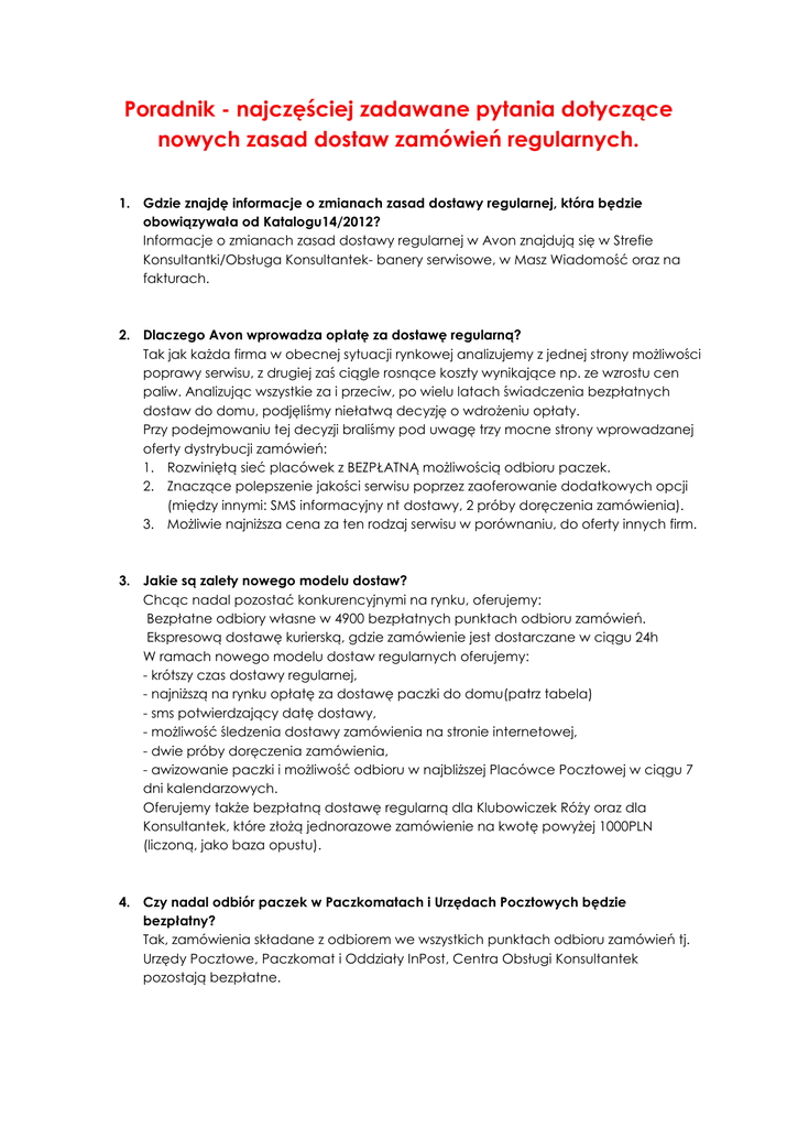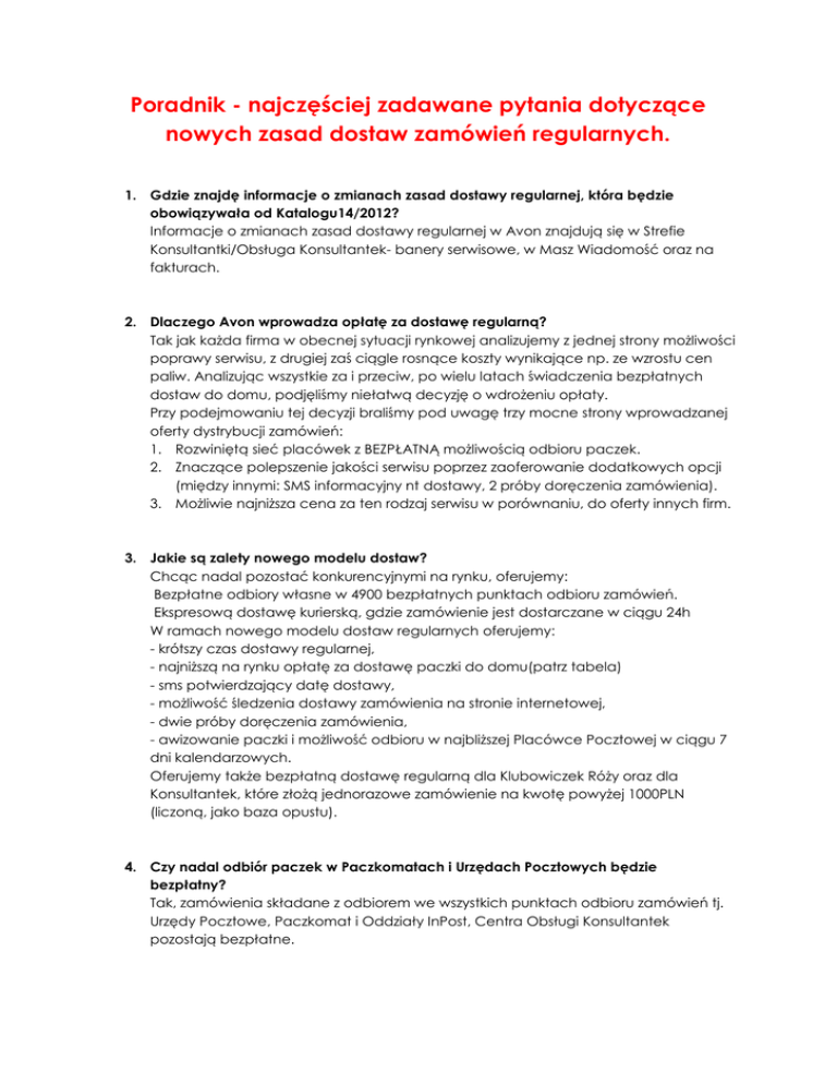 Poradnik - najczęściej zadawane pytania dotyczące nowych zasad dostaw zamówień regularnych. 1. Gdzie znajdę informacje o zmianach zasad dostawy regularnej, która będzie obowiązywała od Katalogu14/2012? Informacje o zmianach zasad dostawy regularnej w Avon znajdują się w Strefie Konsultantki/Obsługa Konsultantek- banery serwisowe, w Masz Wiadomość oraz na fakturach. 2. Dlaczego Avon wprowadza opłatę za dostawę regularną? Tak jak każda firma w obecnej sytuacji rynkowej analizujemy z jednej strony możliwości poprawy serwisu, z drugiej zaś ciągle rosnące koszty wynikające np. ze wzrostu cen paliw. Analizując wszystkie za i przeciw, po wielu latach świadczenia bezpłatnych dostaw do domu, podjęliśmy niełatwą decyzję o wdrożeniu opłaty. Przy podejmowaniu tej decyzji braliśmy pod uwagę trzy mocne strony wprowadzanej oferty dystrybucji zamówień: 1. Rozwiniętą sieć placówek z BEZPŁATNĄ możliwością odbioru paczek. 2. Znaczące polepszenie jakości serwisu poprzez zaoferowanie dodatkowych opcji (między innymi: SMS informacyjny nt dostawy, 2 próby doręczenia zamówienia). 3. Możliwie najniższa cena za ten rodzaj serwisu w porównaniu, do oferty innych firm. 3. Jakie są zalety nowego modelu dostaw? Chcąc nadal pozostać konkurencyjnymi na rynku, oferujemy: Bezpłatne odbiory własne w 4900 bezpłatnych punktach odbioru zamówień. Ekspresową dostawę kurierską, gdzie zamówienie jest dostarczane w ciągu 24h W ramach nowego modelu dostaw regularnych oferujemy: - krótszy czas dostawy regularnej, - najniższą na rynku opłatę za dostawę paczki do domu(patrz tabela) - sms potwierdzający datę dostawy, - możliwość śledzenia dostawy zamówienia na stronie internetowej, - dwie próby doręczenia zamówienia, - awizowanie paczki i możliwość odbioru w najbliższej Placówce Pocztowej w ciągu 7 dni kalendarzowych. Oferujemy także bezpłatną dostawę regularną dla Klubowiczek Róży oraz dla Konsultantek, które złożą jednorazowe zamówienie na kwotę powyżej 1000PLN (liczoną, jako baza opustu). 4. Czy nadal odbiór paczek w Paczkomatach i Urzędach Pocztowych będzie bezpłatny? Tak, zamówienia składane z odbiorem we wszystkich punktach odbioru zamówień tj. Urzędy Pocztowe, Paczkomat i Oddziały InPost, Centra Obsługi Konsultantek pozostają bezpłatne. 5. Czy w związku z wprowadzeniem opłaty 3,90 PLN za dostawę regularną obowiązują zasady naliczania Kosztu realizacji małego zamówienia? Tak, zasada naliczania kosztu obowiązuje bez zmian. Koszt realizacji małego zamówienia naliczany jest do pierwszego zamówienia w kampanii, złożonego na kwotę poniżej 150zł oraz do kolejnego w kampanii, jeśli jego wartość jest niższa niż 50zł. 6. Dlaczego opłata za dostawę regularną wynosi 3,90PLN? Cena opłaty za dostawę została ustalona po wielu analizach rynkowych. Staraliśmy się ustalić jak najniższą opłatę za ten rodzaj serwisu oferując przy tym szeroki wachlarz benefitów. Prosimy o zwrócenie uwagi, że ustalona przez nas kwota za dostawę jest zdecydowanie niższa od tych oferowanych na rynku*, a jej wartość nie przekracza średniej ceny jednorazowego biletu komunikacji miejskiej. 7. Czy dla Konsultantek, które wypracowały już w danej kampanii bazę opustu 1000zł dostawa kolejnych zamówień regularnych niezależnie od ich wysokości będzie bezpłatna? Nie, bezpłatna dostawa dotyczy jednorazowych zamówień na kwotę 1000zł (podstawa opustu). W przypadku dostaw wartość zamówień w kampanii nie łączy się. Tabela opłat za dostawę - porównanie FIRMA Avon Dostawa regularna Odbiór własny (5 tys. punktów) Przesyłka kurierska Oriflame Biuro regionalne/odbiór własny Paczkomat Przesyłka kurierska Yves Rocher Eris.pl Mary Kay Przesyłka Pocztowa Priorytetowa np. Allegro (gabaryt A od 5 do 10kg) CENA DOSTAWY PLN CZAS DOSTAWY 3,90 zł 0zł 6,90zł po 2 dniach 2 dni 1 dzień 7,90zł 9,90zł 11,90zł 9,95zł 16-26zł 15zł 20,50 wg harmonogramu 2-3 dni 2-3 dni 2-3 dni 1 dzień 2 dni 1 dzień * na podstawie badań wewnętrznych Avon kwiecień 2012