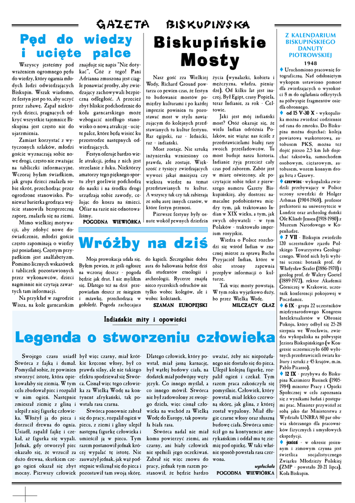 Pęd do wiedzy i ucięte palce Wszyscy jesteśmy pod wrażeniem ogromnego pędu do wiedzy, który ogarnia mło− dych ludzi odwiedzających Biskupin. Wszak wiadomo, że festyn jest po to, aby uczyć przez zabawę. Zapał niektó− rych dzieci, pragnących od− kryć wszystkie tajemnice Bi− skupina jest często nie do ujarzmienia. Zamiast korzystać z wy− tyczonych szlaków, młodzi goście wyznaczają sobie no− we drogi, często nie zważając na tabliczki informacyjne. Wczoraj byłam świadkiem, jak grupa dzieci znalazła so− bie skrót, przechodząc przez ogrodzone stanowisko. Po− nieważ barierka grodząca wej− ście stanowiła bezsprzeczną zaporę, znalazła się na ziemi. Mimo wielkiej motywa− cji, aby zdobyć nowe do− świadczenie, młodzi goście często zapominają o wiedzy już posiadanej. Częstym przy− padkiem jest analfabetyzm. Pomimo licznych wskazówek i tabliczek pozostawionych przez wykonawców, dzieci nagminnie nie czytają zawar− tych tam informacji. Na przykład w zagrodzie Wisza, na kole garncarskim Biskupińskie Mosty znajduje się napis “Nie doty− kać”, Cóż z tego! Pani Adrianna zmuszona jest ciąg− le ponawiać prośby, aby zwie− dzający zachowywali bezpie− czną odległość. A przecież zbyt bliskie podchodzenie do koła garncarskiego może wzbogacić niedługo stano− wisko o nową atrakcję − ucię− te palce, które będą wisieć ku przestrodze następnych od− wiedzających. Festyn oferuje bardzo wie− le atrakcji, jedną z nich jest strzelanie z łuku. Niektórzy amatorzy tego pięknego spor− tu zbyt gorliwie podchodzą do nauki i na środku drogi urządzają sobie zawody, ce− lując do kosza na śmieci. Ofiar na razie nie odnotowa− liśmy. Nasz gość zza Wielkiej Wody, Richard Ground pow− tarza co pewien czas, że festyn to budowanie mostów po− między kulturami i po każdej imprezie powinien tu pozo− stawać most w stylu nawią− zującym do kolejnych przed− stawianych tu kultur festynu. Raz egipski, raz − lednicki, raz − indiański. Most zostaje. Nie sztuką inżynierską wzniesiony co prawda, ale zostaje. Więk− szość z tysięcy zwiedzających wywozi jakąś mniejszą czy większą wiedzę na temat przedstawianych tu kultur. A wszyscy tak czy tak zabierają ze sobą aurę innych czasów, w które festyn przenosi. Pierwsze festyny były os− POGODNA WIEWIÓRKA nute wokół pewnych dziedzin Wróżby na dziś Moja prowokacja udała się. Byłem pewien, że jeśli ogłoszę na wczoraj deszcz − pogoda będzie jak drut. I nie myliłem się. Dlatego też na dziś prze− powiadam deszcz ze śniegiem i mżawkę, przechodzącą w gołoledź. Pogoda zachęcająca do kąpieli. Szczególnie dobra aura do baliowania będzie dziś dla studentów etnologii i archeologii. Rycerze znajdą nieco rycerskich odruchów nie tylko wobec kolegów, ale i wobec koleżanek. SZAMAN EUROPEJSKI życia (wynalazki, kobieta i mężczyzna, władza, pienią− dze). Od kilku lat jest ina− czej. Był Egipt, czasy Popiela, teraz Indianie, za rok − Cel− towie. Jaki jest mój indiański most? Otóż okazuje się, że wielu Indian odróżnia Po− laków, nie wiążąc nas ściśle z przedstawicielami białej rasy swoich prześladowców. Tu most buduje nasza historia. Indianie żyją przecież cały czas pod zaborem. Zabór jest w miarę oświecony, ale po− czytajcie sobie tekst z pierw− szego numeru Gazety Bis− kupińskiej, aby dostrzec na− macalne podobieństwa mię− dzy tym, jak traktowano In− dian w XIX wieku, a tym, jak swych obywateli − w tym Polaków − traktowało imper− ium rosyjskie. Wiedza o Polsce rozcho− dzi się wśród Indian w zna− cznej mierze za sprawą Ruchu Przyjaciół Indian, które w obie strony zapewnia przepływ informacji o kul− turze. Tak więc mosty powstają. W tym roku wyjątkowo duży, bo przez Wielką Wodę. MILCZĄCY GŁAZ Indiańskie mity i opowieści Legenda o stworzeniu człowieka Swojego czasu usiadł Stwórca z fajką i dumał. Pomyślał sobie, że powinien stworzyć istotę, która opie− kowałaby się ziemią. W tym celu zbudował piec i rozpalił w nim ogień. Następnie zmieszał ziemię z gliną i ulepił z niej figurkę człowie− ka. Włożył ją do pieca i dorzucił drewna do ognia. Usiadł, zapalił fajkę i cze− kał, aż figurka się wypali. Jednak, gdy otworzył piec okazało się, że wrzucił za dużo drewna, skutkiem cze− go ogień okazał się zbyt mocny. Pierwszy człowiek był więc czarny, miał krót− kie kręcone włosy, był co prawda silny, ale nie takiego efektu spodziewał się Stwór− ca. Cisnął więc tego człowie− ka za Wielką Wodę na kon− tynent afrykański, tak po− wstała rasa czarna. Stwórca ponownie zabrał się do pracy, rozpalił ogień w piecu, z ziemi i gliny ulepił następną figurkę człowieka i umieścił ją w piecu. Tym razem postanowił jednak kró− cej wypalać tę istotę. Nie zauważył jednak, jak wąż pod− stępnie wśliznął się do pieca i pozostawił tam swoją skórę. Dlatego człowiek, który po− wstał, miał jasną karnację, był wątłej budowy ciała, na dodatek miał podwójny węży język. Co innego myślał, a co innego mówił. Stwórca nie był zadowolony ze swoje− go dzieła, więc cisnął czło− wieka na wschód za Wielką Wodę do Europy, tak powsta− ła biała rasa. Stwórca nadal nie miał komu powierzyć ziemi, ani czarny, ani biały człowiek nie spełnili jego oczekiwań. Zabrał się więc znowu do pracy, jednak tym razem po− stanowił, że będzie bardzo uważać, żeby nic niepożąda− nego nie dostało się do pieca. Ulepił kolejną figurkę, roz− palił ogień i czekał. Tym razem praca zakończyła się pomyślnie. Człowiek, który powstał, miał lekko czerwo− ną skórę, jak glina, z której został wypalony. Miał dłu− gie czarne włosy oraz słuszną budowę ciała. Stwórca umie− ścił go na kontynencie ame− ryka