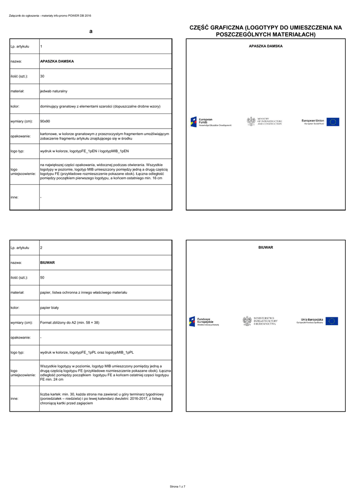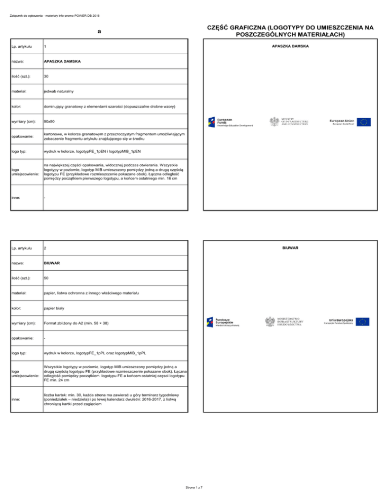 Załącznik do ogłoszenia - materiały info-promo POWER DB 2016 CZĘŚĆ GRAFICZNA (LOGOTYPY DO UMIESZCZENIA NA POSZCZEGÓLNYCH MATERIAŁACH) a Lp. artykułu 1 nazwa: APASZKA DAMSKA ilość (szt.): 30 materiał: jedwab naturalny kolor: dominujący granatowy z elementami szarości (dopuszczalne drobne wzory) wymiary (cm): 90x90 opakowanie: kartonowe, w kolorze granatowym z przezroczystym fragmentem umożliwiającym zobaczenie fragmentu artykułu znajdującego się w środku logo typ: wydruk w kolorze, logotypFE_1pEN i logotypMIB_1pEN logo umiejscowienie: na największej części opakowania, widocznej podczas otwierania. Wszystkie logotypy w poziomie, logotyp MIB umieszczony pomiędzy jedną a drugą częścią logotypu FE (przykładowe rozmieszczenie pokazane obok). Łączna odległość pomiędzy początkiem pierwszego logotypu, a końcem ostatniego min. 16 cm inne: - Lp. artykułu 2 nazwa: BIUWAR ilość (szt.): 50 materiał: papier, listwa ochronna z innego właściwego materiału kolor: papier biały wymiary (cm): Format zbliżony do A2 (min. 58 × 38) opakowanie: - logo typ: wydruk w kolorze, logotypFE_1pPL oraz logotypMIB_1pPL logo umiejscowienie: Wszystkie logotypy w poziomie, logotyp MIB umieszczony pomiędzy jedną a drugą częścią logotypu FE (przykładowe rozmieszczenie pokazane obok). Łączna odległość pomiędzy początkiem logotypu FE a końcem ostatniej częsci logotypu FE min. 24 cm inne: liczba kartek: min. 30, każda strona ma zawierać u góry terminarz tygodniowy (poniedziałek – niedziela) i po lewej kalendarz dwuletni: 2016-2017, z listwą chroniącą kartki przed zagięciem APASZKA DAMSKA BIUWAR Strona 1 z 7 Załącznik do ogłoszenia - materiały info-promo POWER DB 2016 Lp. artykułu 3 nazwa: DŁUGOPIS BIAŁY ilość (szt.): 200 materiał: plastik kolor: biały wymiary (cm): - opakowanie: - logo typ: wydruk w kolorze, logotypFE_1pEN i logotypMIB_1pEN logo umiejscowienie: Po obu stronach korpusu długopisu po jednym logo na każdej stronie (wykonane np. techniką tampondruku lub grawer) inne: mechanizm przyciskany - z klipsem, wkład piszący w kolorze niebieskim Lp. artykułu 4 nazwa: DŁUGOPIS GRANATOWY ilość (szt.): 200 materiał: plastik kolor: ciemnogranatowy wymiary (cm): - opakowanie: - logo typ: DŁUGOPIS BIAŁY DŁUGOPIS GRANATOWY logotypFE_3pEN i logotypMIB_1pEN (odwrócone kolory) logo umiejscowienie: po obu stronach korpusu po jednym logo na każdej stronie (wykonane np. techniką tampondruku lub grawer) inne: mechanizm przyciskany - z klipsem, wkład piszący w kolorze niebieskim Strona 2 z 7 Załącznik do ogłoszenia - materiały info-promo POWER DB 2016 Lp. artykułu 5 nazwa: KRAWAT MĘSKI ilość (szt.): 30 materiał: jedwab naturalny kolor: ciemnoczerwony wymiary (cm): szerokość w dużym czubie: 6-8 długość: 142 -150 opakowanie: kartonowe, w kolorze czarnym lub granatowym z przezroczystym fragmentem umożliwiającym zobaczenie fragmentu artykułu znajdującego się w środku logo typ: wydruk w kolorze, logotypFE_1pEN i logotypMIB_1pEN logo umiejscowienie: na największej części opakowania, widocznej podczas otwierania. Wszystkie logotypy w poziomie, logotyp MIB umieszczony pomiędzy jedną a drugą częścią logotypu FE (przykładowe rozmieszczenie pokazane obok). Łączna odległość pomiędzy początkiem pierwszego logotypu a końcem ostatniego min. 16 cm inne: - Lp. artykułu 6 nazwa: KUBEK ilość (szt.): 90 materiał: ceramiczny kolor: biały na zewnątrz, w środku kolor zbliżony do koloru tła flagi UE wymiary (cm): pojemność min. 270 ml, o podstawie koła, średnica (na dole min. 4,8 maks. 6, na górze min. 7,8) opakowanie: kartonowe logo typ: wydruk w kolorze, logotypFE_1pPL oraz logotypMIB_1pPL logo umiejscowienie: dwa logotypy na zewnętrznej stronie kubka, po przeciwnych stronach inne: Kubek ceramiczny z uchem (o rozmiarze od dolnego do górnego mocowania min. 6,5 cm) KRAWAT MĘSKI KUBEK Strona 3 z 7 Załącznik do ogłoszenia - materiały info-promo POWER DB 2016 Lp. artykułu 7 nazwa: NOTATNIK TYPU "ZESZYT" A5 ilość (szt.): 100 materiał: papier, oprawa twarda kolor: oprawa z przodu i z tyłu biała, papier biały wymiary (cm): A5 opakowanie: - logo typ: wydruk w kolorze, logotypFE_1pPL oraz logotypMIB_1pPL logo umiejscowienie: na przedniej okładce na górze po środku logotypMIB_1pPL, na dole po środku logotypFE_1pPL inne: szyty, papier w kratkę, min. 80 str. Lp. artykułu 8 nazwa: NOTATNIK TYPU "ZESZYT" B5 ilość (szt.): 100 materiał: papier, oprawa twarda kolor: oprawa z przodu i z tyłu biała, papier biały wymiary (cm): B5 opakowanie: - logo typ: wydruk w kolorze, logotypFE_1pPL oraz logotypMIB_1pPL logo umiejscowienie: na przedniej okładce na górze po środku logotypMIB_1pPL, na dole po środku logotypFE_1pPL inne: szyty, papier w kratkę, min. 80 str. NOTATNIK TYPU "ZESZYT" A5 NOTATNIK TYPU "ZESZYT" B5 Strona 4 z 7 Załącznik do ogłoszenia - materiały info-promo POWER DB 2016 PAMIĘĆ USB (PENDRIVE) Lp. artykułu 9 nazwa: PAMIĘĆ USB (PENDRIVE) ilość (szt.): 60 materiał: plastik z obrotową metalową osłoną kolor: plastik - biały, metal - srebrny wymiary (cm): - opakowanie: kartonowe logo typ: wydruk w kolorze, logotypFE_1pEN logo umiejscowienie: grawer laserowy na obu stronach metalowej osłony: logotypFE_1pEN w połowie wykorzystany po jednej stronie, druga połowa na drugiej stronie. inne: pojemność: min. 16 Gb; typ podłączenia: USB 3.0., kompatybilne min. z OS Windows XP/Vista/Win7,8,10 Lp. artykułu 10 nazwa: PIÓRO WIECZNE ilość (szt.): 30 materiał: oprawa metalowa, korpus plastikowy kolor: czarny błyszczący (klips w kolorze srebrnym lub złotym) wymiary (cm): - opakowanie: kartonowe, w kolorze czarnym z przezroczystym fragmentem umożliwiającym zobaczenie fragmentu artykułu znajdującego się w środku. Dodatkowo pióro wyposażone w stylowe i eleganckie etui w kolorze czarnym (skóra) opakowanie EN: na piórze: 15 sztuk w wersji angielskiej: logotypFE_3pEN (ew. w ko