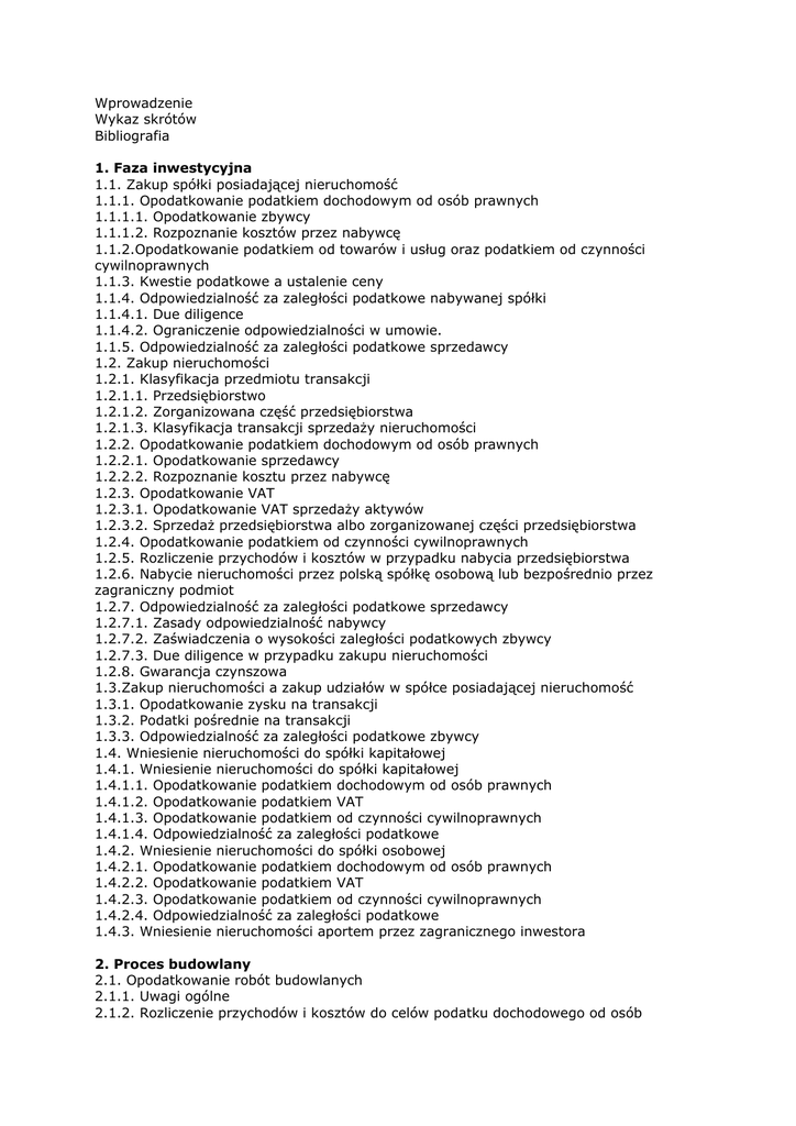 Wprowadzenie Wykaz skrótów Bibliografia 1. Faza inwestycyjna 1.1. Zakup spółki posiadającej nieruchomość 1.1.1. Opodatkowanie podatkiem dochodowym od osób prawnych 1.1.1.1. Opodatkowanie zbywcy 1.1.1.2. Rozpoznanie kosztów przez nabywcę 1.1.2.Opodatkowanie podatkiem od towarów i usług oraz podatkiem od czynności cywilnoprawnych 1.1.3. Kwestie podatkowe a ustalenie ceny 1.1.4. Odpowiedzialność za zaległości podatkowe nabywanej spółki 1.1.4.1. Due diligence 1.1.4.2. Ograniczenie odpowiedzialności w umowie. 1.1.5. Odpowiedzialność za zaległości podatkowe sprzedawcy 1.2. Zakup nieruchomości 1.2.1. Klasyfikacja przedmiotu transakcji 1.2.1.1. Przedsiębiorstwo 1.2.1.2. Zorganizowana część przedsiębiorstwa 1.2.1.3. Klasyfikacja transakcji sprzedaŜy nieruchomości 1.2.2. Opodatkowanie podatkiem dochodowym od osób prawnych 1.2.2.1. Opodatkowanie sprzedawcy 1.2.2.2. Rozpoznanie kosztu przez nabywcę 1.2.3. Opodatkowanie VAT 1.2.3.1. Opodatkowanie VAT sprzedaŜy aktywów 1.2.3.2. SprzedaŜ przedsiębiorstwa albo zorganizowanej części przedsiębiorstwa 1.2.4. Opodatkowanie podatkiem od czynności cywilnoprawnych 1.2.5. Rozliczenie przychodów i kosztów w przypadku nabycia przedsiębiorstwa 1.2.6. Nabycie nieruchomości przez polską spółkę osobową lub bezpośrednio przez zagraniczny podmiot 1.2.7. Odpowiedzialność za zaległości podatkowe sprzedawcy 1.2.7.1. Zasady odpowiedzialność nabywcy 1.2.7.2. Zaświadczenia o wysokości zaległości podatkowych zbywcy 1.2.7.3. Due diligence w przypadku zakupu nieruchomości 1.2.8. Gwarancja czynszowa 1.3.Zakup nieruchomości a zakup udziałów w spółce posiadającej nieruchomość 1.3.1. Opodatkowanie zysku na transakcji 1.3.2. Podatki pośrednie na transakcji 1.3.3. Odpowiedzialność za zaległości podatkowe zbywcy 1.4. Wniesienie nieruchomości do spółki kapitałowej 1.4.1. Wniesienie nieruchomości do spółki kapitałowej 1.4.1.1. Opodatkowanie podatkiem dochodowym od osób prawnych 1.4.1.2. Opodatkowanie podatkiem VAT 1.4.1.3. Opodatkowanie podatkiem od czynności cywilnoprawnych 1.4.1.4. Odpowiedzialność za zaległości podatkowe 1.4.2. Wniesienie nieruchomości do spółki osobowej 1.4.2.1. Opodatkowanie podatkiem dochodowym od osób prawnych 1.4.2.2. Opodatkowanie podatkiem VAT 1.4.2.3. Opodatkowanie podatkiem od czynności cywilnoprawnych 1.4.2.4. Odpowiedzialność za zaległości podatkowe 1.4.3. Wniesienie nieruchomości aportem przez zagranicznego inwestora 2. Proces budowlany 2.1. Opodatkowanie robót budowlanych 2.1.1. Uwagi ogólne 2.1.2. Rozliczenie przychodów i kosztów do celów podatku dochodowego od osób prawnych 2.1.2.1. Moment powstania przychodu 2.1.2.2. Moment rozliczenia kosztów 2.1.3. Moment powstania obowiązku podatkowego w VAT. 2.1.4. Fakturowanie 2.1.5. Odliczenie VAT z faktur za roboty budowlane 2.1.6. Zwrot VAT w czasie procesu budowlanego 2.1.7. Kaucje gwarancyjne 2.1.8. Kary umowne 2.1.9. Koszty i opłaty sądowe 2.1.10. Udział w przetargach 2.1.11. Przekazanie infrastruktury 2.1.11.1. Przekazanie infrastruktury niedrogowej (media) 2.1.11.2. Przekazanie infrastruktury drogowej 2.1.12. Zagraniczna spółka jako dostawca usług 2.1.12.1. Zagraniczna spółka jako wykonawca kontraktu budowlanego 2.1.12.2. Konsekwencje nabywania usług od zagranicznych spółek na gruncie VAT 2.1.13. Waluta rozliczeń kontraktów budowlanych 2.1.13.1. Kontrakt w walucie obcej 2.1.13.2. Kontrakt denominowany do waluty obcej 2.2. Kapitalizacja kosztów 2.2.1. Zakres kapitalizacji kosztów 2.2.2. Kapitalizacja kosztów finansowych 2.2.3. Segregacja kosztów 2.3. Zaniechane inwestycje 2.4. Budowa projektów na sprzedaŜ 3. Faza operacyjna 3.1. Zasady opodatkowania najmu 3.1.1. Opodatkowanie podatkiem dochodowym od osób prawnych 3.1.1.1. Uwagi ogólne 3.1.1.2. Moment rozpoznania przychodu z tytułu najmu 3.1.1.3. Moment rozpoznania kosztów z tytułu najmu po stronie najemcy 3.1.2. Opodatkowanie VAT 3.1.2.1. Uwagi ogólne 3.1.2.2. Moment powstania obowiązku podatkowego w VAT 3.1.2.3. Odliczenie podatku naliczonego przez najemcę 3.1.3. Amortyzacja jako koszt w najmie - zasady ogólne 3.1.3.1. Technika dokonywania odpisów amortyzacji podatkowej 3.1.3.2. Podstawa dokonywania odpisów amortyzacyjnych i stawki amortyzacji 3.1.3.3. Inwestycje w obcych środkach trwałych oraz budynki i budowle na cudzym gruncie 3.1.3.4. Czasowy brak wykorzystywania nieruchomości przeznaczonych pod wynajem 3.1.4. Modernizacje (ulepszenia) a remonty 3.1.5. Koszty z tytułu pośrednictwa przy zawarciu umów najmu 3.1.6. Kaucje związane z zawarciem umów najmu 3.1.7. Rozwiązanie bądź wygaśnięcie umowy a dalsze korzystanie 3.1.8. Zapłata czynszu przez gwaranta 3.1.9. Rozliczenia z tytułu opłat eksploatacyjnych 3.1.9.1. "Zaliczki" na poczet opłat eksploatacyjnych i rozliczenie roczne 3.1.9.2. BieŜące refakturowanie opłat eksploatacyjnych 3.1.10. Zachęty dla najemców 3.1.10.1. Okres zwolnienia z czynszu 3.1.10.2. Wynagrodzenie za zawarcie umowy najmu 3.1.10.3. Pokrycie kosztów aranŜacji wnętrz 3.1.10.4. "Wykup" najemcy 3.1.11. Rozliczenie nakładów poniesionych przez najemcę na przedmiot najmu 3.1.11.1. Rozliczenie nakładów za wynagrodzeniem ze strony wynajmującego 3.1.11.2. Rozliczenie nakładów bez wynagrodzenia ze strony wynajmującego 3.1.11.3. Likwidacja nakładów przez najemcę 3.1.12. Rozliczenie nakładów w związku ze wzniesieniem budynków lub budowli na cudzym gruncie 3.1.13. Odszkodowanie za zerwanie umowy najmu 3.1.14. Podatek od nieruchomości 3.1.14.1. Ogólne zasady opodatkowania podatkiem od nieruchomości 3.1.14.2. Kwalifikacja przedmiotów opodatkowania podatkiem od nieruchomości 3.2. Opodatkowanie sprzedaŜy mieszkań 3.2.1. Uwagi ogólne 3.2.2. Opodatkowanie dochodu ze sprzedaŜy mieszkań 3.2.3. Opodatkowanie VAT sprzedaŜy mieszkań 3.2.3.1. SprzedaŜ udziałów we współwłasności mieszkań 3.2.3.2. SprzedaŜ garaŜu/miejsca postojowego 3.2.4. Opłaty rezerwacyjne 3.3. 