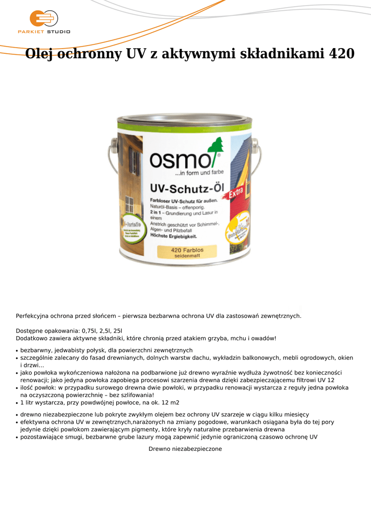 Olej ochronny UV z aktywnymi składnikami 420 Perfekcyjna ochrona przed słońcem – pierwsza bezbarwna ochrona UV dla zastosowań zewnętrznych. Dostępne opakowania: 0,75l, 2,5l, 25l Dodatkowo zawiera aktywne składniki, które chronią przed atakiem grzyba, mchu i owadów! ● ● ● ● ● ● ● ● bezbarwny, jedwabisty połysk, dla powierzchni zewnętrznych szczególnie zalecany do fasad drewnianych, dolnych warstw dachu, wykładzin balkonowych, mebli ogrodowych, okien i drzwi… jako powłoka wykończeniowa nałożona na podbarwione już drewno wyraźnie wydłuża żywotność bez konieczności renowacji; jako jedyna powłoka zapobiega procesowi szarzenia drewna dzięki zabezpieczającemu filtrowi UV 12 ilość powłok: w przypadku surowego drewna dwie powłoki, w przypadku renowacji wystarcza z reguły jedna powłoka na oczyszczoną powierzchnię – bez szlifowania! 1 litr wystarcza, przy powdwójnej powłoce, na ok. 12 m2 drewno niezabezpieczone lub pokryte zwykłym olejem bez ochrony UV szarzeje w ciągu kilku miesięcy efektywna ochrona UV w zewnętrznych,narażonych na zmiany pogodowe, warunkach osiągana była do tej pory jedynie dzięki powłokom zawierającym pigmenty, które kryły naturalne przebarwienia drewna pozostawiające smugi, bezbarwne grube lazury mogą zapewnić jedynie ograniczoną czasowo ochronę UV Drewno niezabezpieczone ● ● ● Osmo Olej Ochronny UV zawiera specjalne, bezbarwne składniki, które uniemożliwiają ingerencję promieni UV w powierzchnię drewna. Filtr ochronny UV 12 zapobiega procesowi szarzenia drewna bez potrzeby maskowania jego zmian kolorystycznych Osmo Olej Ochronny UV nie zamyka mikroporów, nie pęka i nie rozwarstwia się Drewno zabezpieczone