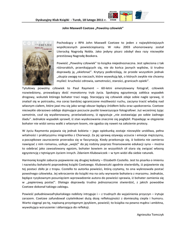 Dyskusyjny Klub Książki - Turek, 18 lutego 2011 r. John Maxwell Coetzee „Powolny człowiek” Pochodzący z RPA John Maxwell Coetzee to jeden z najwybitniejszych współczesnych powieściopisarzy. W roku 2003 uhonorowany został Literacką Nagrodą Nobla. Jako jedyny pisarz zdobył dwa razy niezwykle prestiżową Nagrodę Bookera. Powieść „Powolny człowiek” to książka niejednoznaczna. Jest spleciona z tak różnorakich, przenikających się, nie do końca jasnych wątków, iż trudno doprawdy ją „okiełznać”. Krytycy podkreślają, że przede wszystkim jednak „skupia uwagę na rzeczach, które wywołują lęk, o których zwykle nie chcemy myśleć: kruchości zdrowia, samotności, starości, granicach opieki”. Tytułowy powolny człowiek to Paul Rayment – 60-letni emerytowany fotograf, człowiek rozwiedziony, prowadzący dość monotonny tryb życia. Spokojną egzystencję zakłóca wypadek drogowy, wskutek którego bohater traci nogę. Starzejący się człowiek zdaje sobie nagle sprawę, iż znalazł się w potrzasku, ma coraz bardziej ograniczone możliwości ruchu, zaczyna tracić władzę nad własnym ciałem, które jawi mu się jako wrogi obszar będący źródłem bólu oraz upokorzenia. Coetzee niezwykle obrazowo oddaje dojmujące poczucie pustki towarzyszące fotografowi. Już wcześniej żyjąc samotnie, czuł się wyalienowany, przeświadczony, iż egzystuje „nie zostawiając po sobie żadnego śladu”. Jednakże wypadek sprawił, iż stan wyobcowania znacznie się pogłębił. Popadając w otępienie bohater nie widzi sensu walki z własnym losem, nie zgadza się nawet na założenie protezy. W życiu Raymenta pojawia się jednak kobieta – jego opiekunką zostaje niezwykle urokliwa, pełna witalności i praktycyzmu imigrantka z Chorwacji. Za jej sprawą ożywają uczucia i emocje mężczyzny, a początkowe zauroczenie przeradza się w fascynację. Kiedy przekonuje się, iż kobieta nie zamierza nawiązać z nim romansu, usiłuje „wejść” do jej rodziny poprzez finansowanie edukacji syna – można to odebrać jako zawoalowany egoizm, bohater bowiem ze wszystkich sił stara się związać własną egzystencję z tętniącym życiem innych. Zdaniem Klubowiczek – w tym widzi dla siebie ratunek. Harmonię książki zaburza pojawienie się drugiej kobiety – Elizabeth Costello. Jest to pisarka o imieniu i nazwisku bohaterki poprzedniej książki Coetzeego. Klubowiczki zgodnie stwierdziły, iż pojawienie się tej postaci zbiło je z tropu. Costello to autorka powieści, którą czytamy, to ona wykreowała postać powolnego człowieka. Jej wkroczenie do książki ma na celu wyrwanie bohatera z marazmu. Jednakże, będące ryzykownym posunięciem wprowadzenie autora do powieści sprawia, iż bohater zamienia się w „papierową postać”. Dlatego doprawdy trudno jednoznacznie stwierdzić, z jakich powodów Coetzee dokonał takiego zabiegu. Powieść południowoafrykańskiego noblisty intryguje i – z trudnych do wyjaśnienia przyczyn – irytuje zarazem. Coetzee zafundował czytelnikowi dużą dozę refleksyjności z domieszką ciepła i humoru. Warto sięgnąć po tę, napisaną przystępnym językiem, powieść; to książka na pewno mądra i ambitna, wywołująca wzruszenie i skłaniająca do refleksji. Agnieszka Tomczyk Dyskusyjny Klub Książki - Turek, 18 lutego 2011 r.