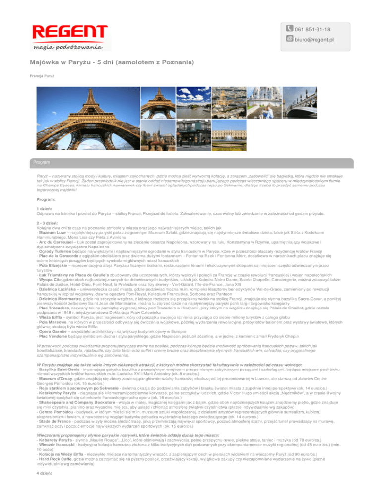 061 851-31-18 [email protected] Majówka w Paryżu - 5 dni (samolotem z Poznania) Francja Paryż Program Paryż – nazywany stolicą mody i kultury, miastem zakochanych, gdzie można zjeść wytworną kolację, a zarazem „zadowolić” się bagietką, która nigdzie nie smakuje tak jak w stolicy Francji. Żaden przewodnik nie jest w stanie oddać niesamowitego nastroju panującego podczas wieczornego spaceru w międzynarodowym tłumie na Champs Elysees, klimatu francuskich kawiarenek czy feerii świateł oglądanych podczas rejsu po Sekwanie, dlatego trzeba to przeżyć samemu podczas tegorocznej majówki! Program: 1 dzień: Odprawa na lotnisku i przelot do Paryża – stolicy Francji. Przejazd do hotelu. Zakwaterowanie, czas wolny lub zwiedzanie w zależności od godzin przylotu. 2 - 3 dzień: Kolejne dwa dni to czas na poznanie atmosfery miasta oraz jego najważniejszych miejsc, takich jak - Muzeum Luwr – najpiękniejszy paryski pałac z ogromnym Muzeum Sztuki, gdzie znajdują się najsłynniejsze światowe dzieła, takie jak Stela z Kodeksem Hammurabiego, Mona Lisa czy Pieta z Avinionu - Arc du Carrousel – Łuk został zaprojektowany na zlecenie cesarza Napoleona, wzorowany na łuku Konstantyna w Rzymie, upamiętniający wojskowe i dyplomatyczne zwycięstwa Napoleona - Ogrody Tuileries będące największymi i najdawniejszymi ogrodami w stylu francuskim w Paryżu, które w przeszłości otaczały rezydencję królów Francji - Plac de la Concorde z egipskim obeliskiem oraz dwiema dużymi fontannami - Fontanna Rzek i Fontanna Mórz, dodatkowo w narożnikach placu znajduje się osiem kobiecych posągów będących symbolami głównych miast francuskich - Pola Elizejskie – reprezentacyjna aleja Paryża z licznymi teatrami, restauracjami, kinami i ekskluzywnymi sklepami są miejscem często odwiedzanym przez turystów - Łuk Triumfalny na Placu de Gaulle'a zbudowany dla uczczenia tych, którzy walczyli i polegli za Francję w czasie rewolucji francuskiej i wojen napoleońskich - Wyspa Cite, gdzie obok najbardziej znanych średniowiecznych budynków, takich jak Katedra Notre Dame, Sainte Chapelle, Conciergerie, można zobaczyć także Palais de Justice, Hotel-Dieu, Pont-Neuf, la Prefecture oraz trzy skwery - Vert-Galant, l’Ile-de-France, Jana XIII - Dzielnica Łacińska – uniwersytecka część miasta, gdzie podziwiać można m.in. kompleks klasztorny benedyktynów Val-de-Grace, zamieniony po rewolucji francuskiej w szpital wojskowy, dawne opactwo Port-Royal, Kolegium Francuskie, Sorbonę oraz Panteon - Dzielnica Montmartre, gdzie na szczycie wzgórza, z którego roztacza się przepiękny widok na stolicę Francji, znajduje się słynna bazylika Sacre-Coeur, a poniżej pierwszy kościół żelbetowy Saint Jean de Montmartre, można tu zajrzeć także na najsłynniejszy paryski pchli targ i targowisko księgarzy - Plac Trocadero, nazwany tak na pamiątkę wygranej bitwy pod Trocadero w Hiszpanii, przy którym na wzgórzu znajduje się Palais de Chaillot, gdzie została podpisana w 1948 r. międzynarodowa Deklaracja Praw Człowieka - Wieża Eiffla – symbol Paryża, jest magnesem, który od początku swojego istnienia przyciąga do siebie miliony turystów z całego globu - Pola Marsowe, na których w przeszłości odbywały się ćwiczenia wojskowe, później wydarzenia rewolucyjne, próby lotów balonem oraz wystawy światowe, których główną atrakcją była wieża Eiffla - Opera Garnier – arcydzieło architektury i największy budynek opery w Europie - Plac Vendome będący symbolem ducha i stylu paryskiego, gdzie Napoleon poślubił Józefinę, a w jednej z kamienic zmarł Fryderyk Chopin W przerwach podczas zwiedzania proponujemy czas wolny na posiłek, podczas którego będzie możliwość spróbowania francuskich potraw, takich jak bouillabaisse, brandada, ratatouille, czy tarta tartin oraz suflet i creme brulee oraz skosztowania słynnych francuskich win, calvados, czy oryginalnego szampana(płatne indywidualnie wg zamówienia). W Paryżu znajduje się także wiele innych ciekawych atrakcji, z których można skorzystać fakultatywnie w zależności od czasu wolnego: - Bazylika Saint-Denis - imponująca gotycka bazylika z przepięknym wnętrzem przepełnionym zabytkowymi posągami i sarkofagami, będąca miejscem pochówku niemal wszystkich królów francuskich m.in. Ludwika XVI i Marii Antoniny (ok. 8 euro/os.) - Museum d’Orsay, gdzie znajdują się zbiory zawierające głównie sztukę francuską młodszą od tej prezentowanej w Luwrze, ale starszą od zbiorów Centre Georges Pompidou (ok. 15 euro/os.) - Rejs statkiem spacerowym po Sekwanie - świetna okazja do podziwiania zabytków i blasku świateł miasta z zupełnie innej perspektywy (ok. 14 euro/os.) - Katakumby Paryża - ciągnące się kilometrami podziemne korytarze, pełne szczątków ludzkich, gdzie Victor Hugo umieścił akcję „Nędzników”, a w czasie II wojny światowej spotykali się członkowie francuskiego ruchu oporu (ok. 16 euro/os.) - Shakespeare and Company Bookstore - wizyta w małej, magicznej księgarni jak z bajek, gdzie obok najróżniejszych książek znajdziemy piętro, gdzie znajduje się mini czytelnia, pianino oraz wygodne miejsca, aby usiąść i chłonąć atmosferę świątyni czytelnictwa (płatne indywidualnie wg zakupów) - Centre Pompidou - budynek, w którym mieści się m.in. muzeum sztuki współczesnej, z dziełami artystów reprezentujących głównie surrealizm, kubizm, ekspresjonizm i fowizm, a nowoczesny wygląd budynku pobudza wyobraźnię każdego zwiedzającego (ok. 14 euro/os.) - Stade de France - podczas wizyty można śledzić trasę, jaką przemierzają najwięksi sportowcy, poczuć atmosferę szatni, przejść tunel prowadzący na murawę, zamknąć oczy i poczuć emocje największych wydarzeń sportowych (ok. 15 euro/os.) Wieczorami proponujemy słynne paryskie rozrywki, które świetnie oddają ducha tego miasta: - Kabarety Paryża - słynne „Moulin 