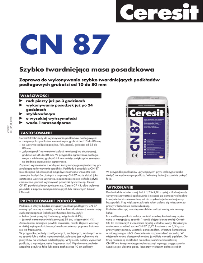 CN 87 Szybko twardniejąca masa posadzkowa CERESIT CN_87_KT_02.15 Zaprawa do wykonywania szybko twardniejących podkładów podłogowych grubości od 10 do 80 mm WŁAŚCIWOŚCI ruch pieszy już po 3 godzinach wykonywanie posadzek już po 24 godzinach szybkoschnąca o wysokiej wytrzymałości wodo- i mrozoodporna ZASTOSOWANIE Ceresit CN 87 służy do wykonywania podkładów podłogowych: — związanych z podłożem cementowym, grubości od 10 do 80 mm, — na warstwie oddzielającej (np. folii, papie), grubości od 35 do 80 mm, — „pływających” na warstwie izolacji termicznej lub akustycznej, grubości od 45 do 80 mm. W przypadku ogrzewania podłogowego – minimalną grubość 45 mm należy zwiększyć o zewnętrzną średnicę przewodów ogrzewania. Zaprawa wymieszana z wodą ma konsystencję gęstoplastyczną, pozwalającą na formowanie spadków. Podkłady i posadzki z CN 87 (nie zbrojone lub zbrojone) mogą być stosowane wewnątrz i na zewnątrz budynków. Jastrych z zaprawy CN 87 może służyć jako ostateczna warstwa użytkowa, można także na nim układać płytki ceramiczne, parkiet, wykonywać posadzki żywiczne np. Ceresit CF 37, powłoki z farby żywicznej np. Ceresit CF 43, albo wylewać posadzki z zapraw samopoziomujących lub rozlewnych Ceresit i Thomsit. PRZYGOTOWANIE PODŁOŻA Podłoża, z którymi będzie związany podkład podłogowy CN 87 muszą być mocne, szorstkie, suche i wolne od substancji zmniejszających przyczepność (takich jak: tłuszcze, bitumy, pyły): — beton (wiek powyżej 3 miesięcy, wilgotność ≤ 4%), — jastrych cementowy (wiek powyżej 28 dni, wilgotność ≤ 4%). Zabrudzenia, istniejące powłoki malarskie, resztki klejów i warstwy o niskiej wytrzymałości usunąć mechanicznie np. poprzez śrutowanie lub frezowanie. W przypadku podłoży zawilgoconych, zaolejonych, skażonych w inny sposób lub o niskiej wytrzymałości, zalecane jest wykonywanie jastrychów na warstwie oddzielającej. W tym celu należy wyrównać podłoże, a wystające, ostre fragmenty skuć. Wyrównane podłoże szczelnie przykryć folią lub papą zachowując 10 cm zakłady. W przypadku podkładów „pływających” płyty izolacyjne trzeba ułożyć na wyrównanym podłożu. Warstwę izolacji szczelnie pokryć folią. WYKONANIE Do dokładnie odmierzonej ilości: 1,75–2,0 l czystej, chłodnej wody wsypywać zawartość opakowania i mieszać za pomocą wolnoobrotowej wiertarki z mieszadłem, aż do uzyskania jednorodnej masy bez grudek. Przy większym zakresie robót zaleca się mieszanie zaprawy w betoniarce przeciwbieżnej. Podłoże odkurzyć, a następnie obficie zwilżyć wodą, nie tworząc kałuż. Na zwilżone podłoże należy nanieść warstwę kontaktową, wykonaną w następujący sposób: 1 część objętościową emulsji Ceresit CC 81 rozcieńczyć 2 częściami czystej, chłodnej wody. Uzyskanym roztworem zarabiać suche CN 87 (0,75 l roztworu na 3,5 kg zaprawy) przy pomocy wiertarki z mieszadłem. Warstwę kontaktową w miarę postępu robót równomiernie rozprowadzać szczotką. W miejscach trudno dostępnych można ją obficie nanosić pędzlem. Gotową mieszankę rozkładać na mokrej warstwie kontaktowej. CN 87 ma konsystencję gęstoplastyczną i wymaga zagęszczania. Możliwe jest ubijanie pacą, lecz przy większym zakresie robót należy zaprawę zagęszczać za pomocą łaty wibracyjnej i zacieraczek wirnikowych. UWAGA Wilgotność podkładu: Jeżeli w podłożu występują dylatacje, to trzeba je odtworzyć w warstwie podkładu. Szczeliny przeciwskurczowe należy nacinać nie rzadziej niż co 6 m oraz w progach pomieszczeń. Uzyskane prostokątne pola nie powinny przekraczać dla zastosowań wewnętrznych 36 m2, dla zastosowań zewnętrznych 25 m2. Przy przyjmowaniu długości i szerokości pól należy zachować proporcje zbliżone do kwadratu. Stosunek długości do szerokości pola nie powinien przekraczać 1,5–2,0. Gdy podkład narażony będzie na wahania temperatury, należy go całkowicie przeciąć szczelinami dylatacyjnymi przy maksymalnych wielkościach pól dylatacyjnych jak wyżej. Należy również wykonać dylatacje obwodowe wokół ścian, słupów itp. o szerokości od 0,5 do 1,0 cm. Po min. 24 godz. od wykonania na podkładzie można mocować płytki ceramiczne zaprawami Ceresit CM. Układanie parkietu należy poprzedzić pomiarem wilgotności podkładu. W przypadku podkładów grzejnych ogrzewanie można włączyć nie wcześniej niż po 3 dniach od wykonania podkładu, zwiększając temperaturę nie więcej niż o 5°C na dobę, aż do osiągnięcia maksymalnej temperatury roboczej, którą trzeba utrzymać przez 3 dni. Następnie można zmniejszać temperaturę podkładu, ale nie szybciej niż o 10°C dziennie. W momencie mocowania płytek ceramicznych temperatura podkładu powinna wynosić od +15°C do +18°C. SKŁADOWANIE Do 9 miesięcy od daty produkcji, przy składowaniu na paletach, w suchych warunkach i w oryginalnych, nieuszkodzonych opakowaniach. OPAKOWANIA Worek 25 kg. DANE TECHNICZNE Baza: gotowa sucha mieszanka na bazie spoiw hydraulicznych, modyfikatorów oraz wypełniaczy mineralnych Proporcje mieszania: 1,75–2,0 l wody na 25 kg Ruch pieszy: po 3 godz. Wytrzymałość na ściskanie: C40 wg PN-EN 13813 Wytrzymałość na zginanie: F7 wg PN-EN 13813 Skurcz: –0,80 mm/m wg PN-EN 13813 Ścieralność na tarczy Bohmego: A9 wg PN-EN 13813 Reakcja na ogień: klasa A1fl wg PN-EN 13813 Uwalnianie substancji lotnych: spełnia wymagania 3,5 cm 7,0 cm 1 2,50% 3,00% 4,25% 2 2,00% 2,25% 3,00% 3 1,80% 2,00% 2,25% 4 1,70% 1,85% 2,00% Testy wykonano w warunkach laboratoryjnych. Każdorazowo przed aplikacją materiałów posadzkarskich należy wykonać testy wilgotności podkładu. ok. 2,0 kg/m2 na każdy mm grubości –warstwa kontaktowa: ok. 0,25 l CC 81 + 3,5 kg CN 87 –zaprawa CN 87: Orientacyjne zużycie: ZALECENIA 1 cm –Wyrób zgodny z normą PN-EN 13813:2003. Wszelkie porady techniczne można u
