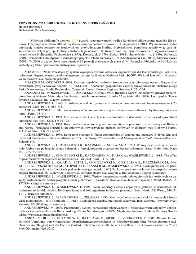 1 PRZYRODNICZA BIBLIOGRAFIA KOTLINY BIEBRZAŃSKIEJ Helena Bartoszuk Biebrzański Park Narodowy Niniejsza bibliografia zawiera 1805 pozycji uszeregowanych według kolejności alfabetycznej nazwisk ich autorów. Obejmuje ona blisko 200 lat: najstarsza pozycja pochodzi z roku 1811, najnowsza z 2013. Wymieniono tu tylko publikacje mające związek ze środowiskiem przyrodniczym Kotliny Biebrzańskiej, pominięte zostało więc całe piśmiennictwo dotyczące np. kultury i historii tego obszaru. W trakcie prac nad tym zestawieniem wykorzystywano wcześniejsze bibliografie: Fabianowicz (1973), Kowalczyk (1979), Żurka (1983), Sterzyńskiej i in. (1999), Bartoszuk (2001), załącznik 1 do Operatu Generalnego projektu Planu Ochrony BPN (Mioduszewski i in. 2001), Marczakiewicz (2005). W 2006 r. uzupełniono zestawienie o 86 pozycji przekazanych przez dr M. Falencką-Jabłońską, wśród których znalazły się także opracowania historyczne i społeczne. ADAMUS Ł. 2008. Przestrzenny system zagospodarowania odpadów organicznych dla Biebrzańskiego Parku Narodowego. Organic waste spatial management system for Biebrza National Park. SGGW. Wydział Inżynierii i Kształtowania Środowiska, praca magisterska. ANASZKO M., GRODZKI S. 2001. Ochrona zasobów i walorów środowiska przyrodniczego obszaru Bagien Biebrzańskich. [W:] Sadowska-Snarska C. (red.) 2001. Społeczno-gospodarcze aspekty funkcjonowania Biebrzańskiego Parku Narodowego. Studia Regionalne. Central & Eastern Europe Regional Studies, 4: 231-264. ANASZKO M., MODZELEWSKI R., ŻEGALSKA E. (red.) 1998. Biebrza i Narew: dziedzictwo przyrodnicze regionu łomżyńskiego. Materiały z konferencji popularnonaukowej. Łomża 22 października 1998r. Łomżyńskie Towa rzystwo Naukowe. im. Wagów, Łomża. ANDRZEJEWSKA L. 1965. Stratification and its dynamics in meadow communities of Auchenorrhyncha (Homoptera). Ekol. Pol., 8: 686-715. ANDRZEJEWSKA L. 1981. Auchenorrhyncha communities in peatsoils meadows influenced by draining. Acta entomol. Fenn., 38: 5-6. ANDRZEJEWSKA L. 1991. Formation of Auchenorrhyncha communities in diversified structures of agricultural landscape. Pol. Ecol. Stud. 17: 267-287. ANDRZEJEWSKA L. 1991. Root production of some grass communities on peat soil in river valleys of Biebrza and Narew. Produkcja korzeni kilku zbiorowisk trawiastych na glebach torfowych w dolinach rzek Biebrzy i Narwi. Pol. Ecol. Stud., 17(1/2): 63-72. ANDRZEJEWSKA L. 1994. Long term changes in fauna communities of drained and managed Biebrza fens and predicted tendencies of their recultivation. Proc. Int. Symp. "Conservation and Management of fens", Warsaw-Biebrza, Poland: 1-8. ANDRZEJEWSKA L., CHMIELEWSKI K., KACZMAREK M., KAJAK A. 1983. Waloryzacja siedlisk w pradolinie Biebrzy na podstawie składu i danych o funkcjonowaniu organizmów heterotroficznych. Zesz. Probl. Post. Nauk Rol., 255: 259-277. ANDRZEJEWSKA L., CHMIELEWSKI K., KACZMAREK M., KAJAK A., WASILEWSKA L. 1985. The effect of peat meadow management on biocoenosis. Pol. ecol. Stud., 11: 53-78. ANDRZEJEWSKA L., KAJAK A., PĘTAL J., CHMIELEWSKI K., CIESIELSKA Z., KACZMAREK M., MAKULEC G., RYSZKOWSKA M., STOPNICKI J., SZANSER M., WASILEWSKA L. 1984. Ekologiczna analiza prze mian zachodzących na torfowiskach pod wpływem gospodarki. [W:] Naukowe podstawy ochrony i zagospodarowania Bagien Biebrzańskich. Wojewoda Łomżyński. Ośrodek Badań Naukowych w Białymstoku. (English summary). ANDRZEJEWSKA L., WASILEWSKA L. 1990. Wpływ zagospodarowania odwodnionych łąk torfowych na zespoły roślinożerców bezkręgowych: nicieni glebowych i piewików (Homoptera-Auchenorrhyncha). Wiad. IMUZ, 16: 177-194. (English summary). ANDRZEJEWSKA L., WASILEWSKA L. 1994. Fauna warstwy zielnej i organizmy glebowe w warunkach odwadniania torfowisk niskich. Herblayer fauna and soil organisms in drained peatlands. Zesz. Nauk. AR Wroc., 246 (3): 11-19. (English summary). ANDRZEJEWSKA L., WASILEWSKA L., ŻELAZO J. 1995. Możliwość renaturyzacji cieków wodnych i środowisk podmokłych. [W:] Tomiałojć L. (red.). Ekologiczne aspekty melioracji wodnych. Inst. Ochrony Przyrody PAN, Kraków: 85-105 (English summary). ANDRZEJEWSKI M. 2006. Przestrzenny system zarządzania planowaniem i wykonawstwem zabiegów ochronnych na terenach nieleśnych Biebrzańskiego Parku Narodowego. SGGW, Międzywydziałowe Studium Ochrony Środowiska, Warszawa, praca magisterska. ANIBAS C., BUIS K., GETACHEW A., BATELAAN O., MEIRE P., VERHOEVEN R. 2008. Räumliche und zeitliche Verteilung von Grundwasser-Oberflächenwasserinteraktion in Fliessbewässern: Eine Vergleichsstudie zwichen der Aa (Belgien) und der Biebrza (Polen). Schriftereihe der Deutchen Gessellchaft für Geowissenschaften, 21-25 May Gӧttingen, Heft 57:82. 2 ANTONIEWICZ B., BIAŁCZAK S., DOMBROWSKI A., DYMNA B., PIEKARSKA E., ROGOWIEC M., TALAGA A. 1998. Studium Diagnostyczne Obszaru Funkcjonalnego Zielone Płuca Polski. Z.U.P. Libra Print, Łomża. ARCISZEWSKA U. 2004. Struktura ekologiczna i genetyczna populacji obuwika pospolitego (Cypripedium calceolus) na wyspach środowiskowych doliny Biebrzy. Uniwersytet w Białymstoku, Białystok, praca magisterska. ATLAS Hydrologiczny Polski. IMGW, Warszawa. 1986. BAZEWICZ J.M. (red.) 1907. Atlas Geograficzny Ilustrowany Królestwa Polskiego. BADANIA torfowisk biebrzańskich. Spraw., CIR 1955, 2: 420-429, powiel. BAGNA Biebrzańskie 1992. 1. Basen Południowy. 2. Basen Środkowy. Mapa przyrodnicza, skala 1:50 000. Północnopodlaskie Towarzystwo Ochrony Ptaków, Białowieża. BAGUET S., CASTEELS A., D’HOLLANDER J., FRANKEN T., LEDEGEN F. 2012. The effect of management on tussock formation in Rogozyn. Ecohydrology field course.University of Antwerp: 1-90, msc. BALCERKIEWICZ A. 2002. Zastosowanie cyfrowego modelu wysokościowego do modelowania zalewów w Dolnym Basenie rzeki Biebrzy. WIKŚ SGGW, Warszawa, praca magisterska (maszynopis). BALIŃSKA M., BALIŃSKI A. 1979. Kamusznik (Arenaria intetpres) w widłach Biebrzy i Narwi. Not