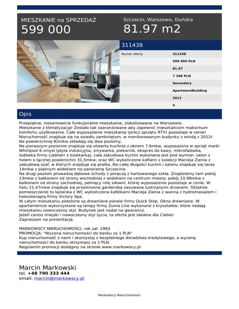 MIESZKANIE na SPRZEDAŻ 599 000 Szczecin, Warszewo, Duńska 81.97 m2 311438 Numer oferty 311438 599 000 PLN 81.97 7 308 PLN Secondary ApartmentBuilding 2012 4 Opis Przepiękne, niesamowicie funkcjonalne mieszkanie, zlokalizowane na Warszewie. Mieszkanie z klimatyzacją! Zostało tak zaaranżowane aby zapewnić mieszkańcom maksimum komfortu użytkowania. Całe wyposażenie mieszkania (prócz sprzętu RTV) pozostaje w cenie! Nieruchomość znajduje się na osiedlu zamkniętym, w monitorowanym budynku z windą z 2012r. Na powierzchnię 82mkw składają się dwa poziomy. Na pierwszym poziomie znajduje się otwarta kuchnia z oknem 7,6mkw, wyposażona w sprzęt marki Whirlpool 6 zmysł (płyta indukcyjna, zmywarka, piekarnik, ekspres do kawy, mikrofalówka, lodówka firmy Liebherr z kostkarką), cała zabudowa kuchni wykonana jest pod wymiar; salon z holem o łącznej powierzchni 31,5mkw; oraz WC wykończone kaflami z kolekcji Macieja Zienia z zabudową szaf, w których znajduje się pralka. Na całej długości kuchni i salonu znajduje się taras 14mkw z pięknym widokiem na panoramę Szczecina. Na drugi poziom prowadzą dębowe schody z poręczą z hartowanego szkła. Znajdziemy tam pokój 13mkw z balkonem od strony wschodniej z widokiem na centrum miasta; pokój 10,98mkw z balkonem od strony zachodniej, pełniący rolę siłowni, której wyposażenie pozostaje w cenie. W holu 11,47mkw znajduje się przestronna garderoba zasuwana lustrzanymi drzwiami. Ostatnie pomieszczenie to łazienka z WC wykończona kafelkami Macieja Zienia z wanną z hydromasażem i koloroterapią firmy Victory Spa. W całym mieszkaniu położone są drewniane panele firmy Quick Step. Okna drewniane. W apartamencie wykorzystane są lampy firmy Zuma Line wykonane z kryształów, które nadają mieszkaniu nowoczesny styl. Budynek jest nadal na gwarancji. Jeżeli cenisz miejski i nowoczesny styl życia, ta oferta jest idealna dla Ciebie! Zapraszam na prezentację. MARKOWSCY NIERUCHOMOŚCI, rok zał. 1993 PROMOCJA: "Wycena nieruchomości do banku za 1 PLN" Kup nieruchomość z nami i skorzystaj z bezpłatnego doradztwa kredytowego, a wycenę nieruchomości do banku otrzymasz za 1 PLN. Regulamin promocji dostępny na stronie www.markowscy.pl Marcin Markowski tel. +48 790 333 444 email: [email protected] Markowscy Nieruchomości Markowscy Nieruchomości Powered by TCPDF (www.tcpdf.org)