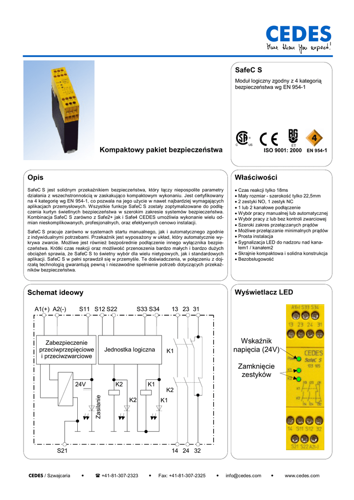 CEDES SafeC S Moduł logiczny zgodny z 4 kategorią bezpieczeństwa wg EN 954-1 ® Kompaktowy pakiet bezpieczeństwa C US ISO 9001: 2000 EN 954-1 Opis Właściwości SafeC S jest solidnym przekaźnikiem bezpieczeństwa, który łączy niepospolite parametry działania z wszechstronnością w zaskakująco kompaktowym wykonaniu. Jest certyfikowany na 4 kategorię wg EN 954-1, co pozwala na jego użycie w nawet najbardziej wymagających aplikacjach przemysłowych. Wszystkie funkcje SafeC S zostały zoptymalizowane do podłączenia kurtyn świetlnych bezpieczeństwa w szerokim zakresie systemów bezpieczeństwa. Kombinacja SafeC S zarówno z Safe2+ jak i Safe4 CEDES umożliwia wykonanie wielu odmian nieskomplikowanych, profesjonalnych, oraz efektywnych cenowo instalacji. · Czas reakcji tylko 18ms · Mały rozmiar - szerokość tylko 22,5mm · 2 zestyki NO, 1 zestyk NC · 1 lub 2 kanałowe podłączenie · Wybór pracy manualnej lub automatycznej · Wybór pracy z lub bez kontroli zwarciowej · Szeroki zakres przełączanych prądów · Możliwe przełączanie minimalnych prądów · Prosta instalacja · Sygnalizacja LED do nadzoru nad kanałem1 / kanałem2 · Skrajnie kompaktowa i solidna konstrukcja · Bezobsługowość SafeC S pracuje zarówno w systemach startu manualnego, jak i automatycznego zgodnie z indywidualnymi potrzebami. Przekaźnik jest wyposażony w układ, który automatycznie wykrywa zwarcie. Możliwe jest również bezpośrednie podłączenie innego wyłącznika bezpieczeństwa. Krótki czas reakcji oraz możliwość przenoszenia bardzo małych i bardzo dużych obciążeń sprawia, że SafeC S to świetny wybór dla wielu nietypowych, jak i standardowych aplikacji. SafeC S w pełni sprawdził się w przemyśle. Te doświadczenia, w połączeniu z dojrzałą technologią gwarantują pewną i niezawodne spełnienie potrzeb dotyczących przekaźników bezpieczeństwa. Wyświetlacz LED Schemat ideowy A1(+) A2(-) S11 S12 S22 Zabezpieczenie przeciwprzepięciowe i przeciwzwarciowe S33 S34 Jednostka logiczna 13 23 31 Wskaźnik napięcia (24V) K1 Zamknięcie zestyków K2 Zasilanie 24V K1 K2 K1 S21 CEDES / Szwajcaria K2 14 24 32 — ( +41-81-307-2323 — Fax: +41-81-307-2325 — [email protected] — www.cedes.com Przekaźnik bezpieczeństwa SafeC S Ustawienie urządzenia Ważne uwagi S1 Zestyki ze złotą powłoką SafeC S umożliwiają przełączanie tak małych obciążeń jak 1mVA - 7VA, 1mW - 7W w zakresie od 0,1V do 60V przy prądzie w zakresie 1 - 300mA. Maksymalnie dopuszczalny prąd może być także przełączany. Nie wolno stosować modułu do małych obciążeń, jeżeli wcześniej występowały duże obciążenia. Bez kontroli zwarciowej Z kontrolą zwarciową Zacisk S21 umożliwia (1) pracę SafeC S w systemach transmisji danych z nadzorem stanu izolacji, (2) może być miejscem napięcia odniesienia dla zewnętrznej aparatury kontrolno-pomiarowej, a także (3) może być użyty do podłączenia obwodu przycisku stopu awaryjnego jeśli jest ustawiona kontrola zwarciowa. S2 Po zdjęciu pokrywki za pomocą śrubokręta, na czole SafeC S widoczne są dwa przełączniki. Poniższy rysunek przedstawia ich ustawienia fabryczne. Start automatyczny Start manualny Zabronione jest używanie zestyków pomocniczych 31 i 32 w obwodach bezpieczeństwa. UWAGA: Nie wolno zmieniać ustawień przy podanym zasilaniu. Może to spowodować uszkodzenie! Schematy blokowe i podłączenia Start manualny: Zewnętrzne wzmocnienie lub zwielokrotnienie zestyków: +24V DC 1 2 3 2 3 L +24 VDC 1 Safe4 Nadajnik Emitter 4 5 6 7 4 Safe4 Odbiornik Receiver 5 6 7 Safe4 Nadajnik Emitter 1 2 3 4 5 6 Safe4 Odbiornik Receiver 1 7 2 3 4 5 6 Si Si Si Si K3 K3 7 13 23 24 31 Pozycja przełącznika S1: bez kontroli zwarciowej Pozycja przełącznika S2: start manualny K3 Start Start K4 A1 S33 S34 Pozycja przełącznika S1: bez kontroli zwarciowej Pozycja przełącznika S2: start manualny CEDES SafeC S K4 13 23 24 31 A1 S33 S34 CEDES SafeC S S21S22 A2 14 S11S12 32 S21 S22 A2 K4 14 S11 S12 32 0V DC N 0V DC Start automatyczny: Podłączenie przycisku stopu awaryjnego: +24V DC 2 3 1 Safe4 Nadajnik Emitter 4 5 6 7 2 3 4 Safe4 Odbiornik Receiver 5 6 7 Start +24 VDC 1 13 23 24 31 A1 S33 S34 CEDES SafeC S 13 23 24 31 Pozycja przełącznika S1: bez kontroli zwarciowej Pozycja przełącznika S2: start automatyczny A1 S33 S34 S21 S22 A2 14 S11S12 32 Pozycja przełącznika S1: z kontrolą zwarciową Pozycja przełącznika S2: start manualny CEDES SafeC S S21S22 A2 14 S11S12 32 0V DC CEDES / Szwajcaria 0V DC — ( +41-81-307-2323 — Fax: +41-81-307-2325 — [email protected] — www.cedes.com Przekaźnik bezpieczeństwa SafeC S Dane Techniczne Wejście Napięcie nominalne U N: Odchylenie napięcia przy 10% tętnieniach: Znamionowy pobór mocy: Min. czas dezaktywacji: Napięcie sterujące na S11: Prąd sterujący w S12 i S22: Min. napięcie na S12, S22: Zabezpieczenie przeciwzwarciowe: Zabezpieczenie przeciwprzepięciowe: 24V DC 0,9 ... 1,1 U N Około 2W DC 250ms 23V DC przy U N 40mA przy U N 21V DC gdy przekaźnik aktywny Wewnętrzny PTC Wewnętrzny VDR Dane podstawowe Tryb pracy: Zakres temperatur: Stopień ochrony: Obudowa: Zaciski: Oznaczenia zacisków: Podłączenie przewodów: Ciągły o -15 ... +55 C IP40, wg EN 60529 IP20, wg EN 60529 Wg EN 50005 2 Linka 1 x 2,5mm z zaciśniętą 2 tulejką lub drut 1 x 4mm albo 2 linka 2 x 1,5 mm z zaciśniętą tulejką DIN 46 228-1/-2/-3/-4 Zdejmowane listwy z niewypadającymi zaciskami śrubowymi M3,5, przewody zabezpieczone Szyna DIN EN 50022 220g 22,5 x 84 x 118mm Mocowanie przewodów: Mocowanie: Waga Wymiary Wyjście Zestyki: Typ. opóźnienie startu przy U N: Start manualny: Start automatyczny: Typ. czas reakcji przy U N: Wyłączenie zasilania: Wyłączenie S12, S22: Rodzaj zestyków: Nominalne napięcie wyjściowe: 2 x NO, 1 x NC 40ms 250ms 50ms 18ms Mechanicznie sprzężone AC: 250V DC: wg krzywej granicznej zdolności łączeniowej Przełączanie małych obciążeń: (ze- > 1