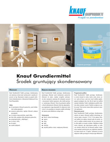 e uj ud fb au Kn ie an uf za Preparaty gruntujące 2010 Knauf Grundiermittel Środek gruntujący skondensowany Właściwości Wytyczne stosowania Knauf Grundiermittel Środek gruntujący skondensowany jest zawiesiną na bazie żywic syntetycznych o wysokiej odporności na ługi. Opracowane receptury są poparte wieloletnimi doświadczeniami w laboratoriach badawczych firmy Knauf Bauprodukte. Knauf Grundiermittel Środek gruntujący skondensowany wyrównujący chłonność przed tynkowaniem powierzchni chłonnych, do wnętrz, znajduje szczególne zastosowanie jako rozwiązanie systemowe dla tynkowania ręcznymi i maszynowymi tynkami gipsowymi, jako środek gruntujący i wyrównujący chłonność. Służy do gruntowania podłoży o silnych właściwościach chłonnych, które bez odpowiedniego przygotowania mogą doprowadzić do odparzenia tynku i przez to nie pozwalają na stosowanie zwykłej technologii jak również przed układaniem suchego tynku. Zalety ■ ■ do gruntowania chłonnych powierzchni, przed układaniem tynków gipsowych, ■ ■ wzmacnia powierzchnie, reguluje chłonność, polepsza przyczepność, ■ ■ nie zawiera rozpuszczalników, zapach słaby, ■■ kolor żółty, powoduje żółte zabarwienie powierzchni, ■ ■ paroprzepuszczalny, „oddychający”, ■ ■ na ściany i sufity, ■ ■ do wnętrz, ■ ■ wysoka wydajność. Zastosowanie ■ ■ bloczki z betonu komórkowego, ■ ■ suporex, ■ ■ ytong, ■ ■ cegła, ■ ■ ceramika, ■ ■ wszystkie podłoża o dużej i zwiększonej chłonności. Przygotowanie podłoża Knauf Grundiermittel Środek gruntujący skondensowany można stosować na nośne, zwarte, suche, mocne, czyste i wolne od kurzu i pyłu oraz innych środków zapobiegających przyleganiu (np. olej, klej do tapet itp.) podłoża wewnątrz budynków. Trwałe i wodoodporne powłoki malarskie należy zmatowić, oczyścić. Powłoki nie odporne na wodę usunąć. Przed użyciem zawsze dobrze wymieszać zawartość opakowania. Nanoszenie gruntu Knauf Grundiermittel Środek gruntujący skondensowany, zależnie od stopnia chłonności podłoża tynkarskiego rozcieńczyć wodą w stosunku 1:2 do 1:5 (im większa chłonność podłoża tym większy stosunek wody do gruntu), nanieść na podłoże metodą natrysku lub przy pomocy wałka albo pędzla nie tworząc zacieków. Nakładanie tynków można rozpocząć, gdy zagruntowane podłoża są suche, czas schnięcia zależny jest od chłonności podłoża, temperatury wewnątrz pomieszczenia oraz wilgotności powietrza, ale zawsze wynosi min. 12 godzin. Tynkowanie na jeszcze wilgotnym środku gruntującym zmniejsza jego efektywność. Wytyczne stosowania Wskazówki uzupełniające ■ ■ temperatura podłoża i powietrza powinna wynosić, co najmniej + 5°C, ściany nie mogą być przemrożone, ■ ■ unikać zapylenia w pomieszczeniach, w których został zastosowany Knauf Grundiermittel Środek gruntujący skondensowany, aby uniknąć osiadania kurzu, ■ ■ Knauf Grundiermittel Środka gruntującego nie należy mieszać z innymi materiałami (tylko z wodą w celu rozcieńczenia), może to spowodować istotne zmiany jego właściwości, ■ ■ narzędzia pracy należy przemyć wodą natychmiast po wykonaniu prac, ■ ■ zaschnięty materiał można zmiękczyć stopniowo za pomocą rozcieńczalnika do żywic syntetycznych (octan etylu lub inny rozpuszczalnik), ■ ■ zanieczyszczenia Knauf Grundiermittel Środkiem gruntującym skondensowanym zmyć na świeżo przy pomocy wody. Uwagi Prace należy wykonywać w suchych warunkach, przy temperaturze powietrza i podłoża od +5°C do +25°C. Wszelkie dane odnoszą się do temperatury +23°C i wilgotności względnej powietrza 60%. W innych warunkach należy uwzględnić szybsze lub wolniejsze schnięcie materiału. W przypadku kontaktu materiału z oczami, płukać je obficie wodą i zasięgnąć porady lekarza. Wyrób przechowywać w miejscu niedostępnym dla dzieci. Opakowanie Kanister 10 kg Paleta 600 kg Wiadra 15 kg Paleta 360 kg Wyrób zawarty jest w aprobacie technicznej Instytutu Techniki Budowlanej AT-15-6944/2006. „Masa szpachlowa Knauf F1/Knauf F2 oraz preparaty Knauf Emulsja Przyczepna, Knauf Środek gruntujący skondensowany”. Wyrób posiada atest higieniczny Państwowego Zakładu Higieny. Parametry techniczne Temperatura stosowania od +5°C do +25°C. Orientacyjne zużycie ■ ■ przy rozcieńczeniu 1:3 (uzależnione również od chłonności podłoża): – – ok. 100 g/m 2 Wydajność ■ ■ opakowanie 15 kg: – – stosunek 1:2 ok. 300 m 2 – – stosunek 1:3 ok. 450 m 2 – – stosunek 1:4 ok. 600 m 2 – – stosunek 1:5 ok. 750 m 2 60 szt. 24 szt. Zalecenia Niniejsza karta techniczna określa zakres stosowania materiału i zalecany sposób prowadzenia robót, ale nie może zastąpić zawodowego przygotowania wykonawcy. Oprócz podanych zaleceń prace należy wykonywać zgodnie ze sztuką budowlaną i zasadami BHP. Producent gwarantuje jakość wyrobu, natomiast nie ma wpływu na warunki i sposób jego użycia. W przypadku wątpliwości należy wykonać własne próby stosowania. Wraz z ukazaniem się niniejszej karty technicznej tracą ważność karty wcześniejsze. Składowanie W suchym miejscu w temperaturze powyżej +3°C dopuszczalny czas składowania wynosi do 12 miesięcy od daty produkcji. Chronić przed bezpośrednim oddziaływaniem promieni słonecznych lub podwyższonej temperatury. Chronić przed mrozem! tel. +48 22/36-95-600 Knauf Bauprodukte Polska Sp. z o.o. fax +48 22/36-95-610 97-427 Rogowiec k. Bełchatowa, ul. Gipsowa 5, tel. +48 22/36-95-600, fax +48 22/36-95-610 www.knauf-bauprodukte.pl Oddział Warszawa: ul. Światowa 25, 02-229 Warszawa, tel. +48 22/36-95-600, fax +48 22/36-95-610 [email protected] Niniejsza karta techniczna okrśla zakres stosowania materiału i zalecany sposób prowadzenia robót, ale nie może zastąpić zawodowego przygotowania wykonawcy. Oprócz podanych zaleceń pra