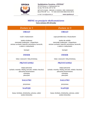 MENU na przyjęcie okolicznościowe Cena zestawu 60 zł/osoba Zestaw nr 1 Zestaw nr 2 OBIAD OBIAD rosół z makaronem zupa pomidorowa z kluseczkami kotlet schabowy ziemniaki tradycyjne z koperkiem zestaw surówek: kapusta zasmażana, buraczki, z selera z rodzynkami kotlet de volaille ziemniaki tradycyjne z koperkiem zestaw surówek: kapusta zasmażana, buraczki, z selera z rodzynkami kompot kompot DESER DESER lody z owocami i bitą śmietaną lody z owocami i bitą śmietaną PRZYSTAWKI PRZYSTAWKI mięsa pieczone (schab z morelą i śliwką, karczek, rolada z boczku) pieczarka faszerowana rolmopsy pieczywo mięsa pieczone (schab z morelą i śliwką, karczek, rolada z boczku) pieczarka faszerowana rolmopsy pieczywo SAŁATKI SAŁATKI jarzynowa jarzynowa NAPOJE NAPOJE kawa, herbata, śmietanka, cytryna, cukier woda mineralna kawa, herbata, śmietanka, cytryna, cukier woda mineralna MENU na przyjęcie okolicznościowe Cena zestawu 80 zł/osoba Zestaw nr 3 Zestaw nr 4 OBIAD OBIAD rosół z makaronem krem pomidorowy z groszkiem ptysiowym kieszonka schabowa z serem i pieczarkami ziemniaki tradycyjne z koperkiem ziemniaki opiekane w ziołach zestaw surówek: z marchewki z jabłkami, z selera z rodzynkami, buraczki rolada drobiowa z fasolką szparagową w sosie Tao Tao ziemniaki tradycyjne z koperkiem ryż biały na sypko zestaw surówek: z kapusty pekińskiej, z selera z rodzynkami, z marchewki z jabłkami kompot kompot DESER DESER szarlotka z bitą śmietaną sernik z gorzką czekoladą PRZYSTAWKI PRZYSTAWKI mięsa pieczone (schab z morelą i śliwką, karczek, rolada z boczku) pieczarka faszerowana galaretka drobiowa śledź na różne sposoby (po węgiersku, w oleju, rolmopsy, pod pierzynką – z jabłkami i śmietaną) pierogi ze szpinakiem – certyfikat „Produkt lokalny nad Białą Przemszą” pieczywo mięsa pieczone (schab z morelą i śliwką, karczek, rolada z boczku) pieczarka faszerowana galaretka drobiowa śledź na różne sposoby (po węgiersku, w oleju, rolmopsy, pod pierzynką – z jabłkami i śmietaną) pierogi ze szpinakiem – certyfikat „Produkt lokalny nad Białą Przemszą” pieczywo SAŁATKI SAŁATKI jarzynowa grecka jarzynowa gyros NAPOJE NAPOJE kawa, herbata, śmietanka, cytryna, cukier soki, napoje, woda mineralna kawa, herbata, śmietanka, cytryna, cukier soki, napoje, woda mineralna KOLACJA do wyboru KOLACJA do wyboru Boeuf Strogonow na wołowinie Pstrąg z warzywami na parze Kluski śląskie, karczek w sosie własnym, surówka z czerwonej kapusty Boeuf Strogonow na wołowinie Pstrąg z warzywami na parze Kluski śląskie, karczek w sosie własnym, surówka z czerwonej kapusty MENU na przyjęcie okolicznościowe Cena zestawu 110 zł/osoba Zestaw nr 5 Zestaw nr 6 OBIAD OBIAD krem z brokułów z grzankami krem borowikowy z grzankami schab pieczony w sosie kurkowym filet z kurczaka saute z pieczarkami ziemniaki tradycyjne z koperkiem ziemniaki opiekane w ziołach surówki 3 do wyboru: z marchewki z jabłkami, z selera z rodzynkami, buraczki, z białej kapusty, z kapusty pekińskiej, warzywa na parze rolada wołowa filet z kurczaka w migdałach lub sezamie ziemniaki tradycyjne z koperkiem gruszka ryżowa surówki 3 do wyboru: z marchewki z jabłkami, z selera z rodzynkami, buraczki, z białej kapusty, z kapusty pekińskiej, warzywa na parze kompot kompot DESER DESER szarlotka na ciepło z lodami i bitą śmietaną szarlotka na ciepło z lodami i bitą śmietaną PRZYSTAWKI PRZYSTAWKI mięsa pieczone (schab z morelą i śliwką, karczek, rolada z boczku) pieczarka faszerowana galaretka drobiowa śledź na różne sposoby (po węgiersku, w oleju, rolmopsy, pod pierzynką – z jabłkami i śmietaną) pierogi ze szpinakiem – certyfikat „Produkt lokalny nad Białą Przemszą” pomidor z mozarellą pieczywo mięsa pieczone (schab z morelą i śliwką, karczek, rolada z boczku) pieczarka faszerowana galaretka drobiowa śledź na różne sposoby (po węgiersku, w oleju, rolmopsy, pod pierzynką – z jabłkami i śmietaną) pierogi ze szpinakiem – certyfikat „Produkt lokalny nad Białą Przemszą” pomidor z mozarellą pieczywo SAŁATKI 2 do wyboru SAŁATKI jarzynowa, grecka, królewska, gyros, curry z kurczakiem jarzynowa, grecka, królewska, gyros, curry z kurczakiem NAPOJE NAPOJE kawa, herbata, śmietanka, cytryna, cukier soki, napoje, woda mineralna kawa, herbata, śmietanka, cytryna, cukier soki, napoje, woda mineralna KOLACJA do wyboru KOLACJA do wyboru Łosoś w sosie, risotto z warzywami, surówka z kapusty pekińskiej Pstrąg z warzywami na parze Kotlet szwajcarski z surówką z kapusty pekińskiej Łosoś w sosie, risotto z warzywami, surówka z kapusty pekińskiej Pstrąg z warzywami na parze Kotlet szwajcarski z surówką z kapusty pekińskiej