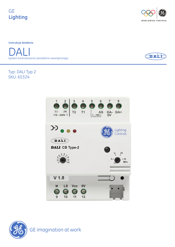 GE Lighting Instrukcje działania DALI System kontrolowania oświetlenia wewnętrznego Typ: DALI Typ 2 SKU: 65324 Zastosowanie DALI Typu 2 może kontrolować maks. 100 balastów/sterowników DALI lub konwerterów DALI.. Zaraz po podłączeniu DALI Typu 2 jest gotowy do działania. Dodatkowa konfiguracja lub przypisanie do grup nie jest konieczne. Wszystkie komponenty DALI kontrolowane są bezpośrednio. Ściemniacz obejmuje już zasilacz interfejsu dla 100 modułów DALI i zapewnia następujące możliwości: • Kontrolę analogową: za pośrednictwem analogowego napięcia 1 ,,10V (0..10) do DALI • Funkcje ściemniacza kontrolowane za pośrednictwem • kombinacji z użyciem 1 lub 2 przycisków oraz kontrolerów wieloczujnikowych (zależne od światła dziennego oraz wykrywania obecności) Podłączenie zewnętrznych paneli do wejścia 2-przyciskowego [T1/T2] oraz / lub analogowego wejścia kontrolnego [AS] umożliwia stosowanie komponentów ALI wraz z analogowym napięciem 1..10V (0...10V) oraz funkcją 1- lub 2-przyciskowego przyciemniania. W połączeniu z multi-czujnikami możliwe jest kontrolowanie funkcji zależnych od światła dziennego oraz ruchu Włącznik lub ustalona wartość może zostać zapisana za pośrednictwem przycisku lub analogowego kontrolera napięcia zgodnego z napięciem analogowego wejścia kontrolnego. Dali Typu 2 jest niezależnym kontrolerem oświetlenia DALI. Pozwala połączyć możliwości systemów DALI z istniejącymi modułami kontroli oświetlenia lub potencjometrem. Konwencjonalne kontrolery oświetlenia wymagające analogowego zasilania mogą być w związku z tym podłączone do balastów/sterowników DALI. Do DALI Typu 2 można podłączyć nawet 6 multi-czujników. Ich identyfikacja następuje automatycznie. DALI Typu 2 w takiej sytuacji działa w oparciu o światło dzienne i wykrywanie obecności. Możliwy do skonfigurowania czas opóźnienia po wykryciu obecności może wynosić do 1 do 32 minut przy module ściemniacza z trymerem. W przypadku braku ruchu ściemniacz redukuje oświetlenie po skonfigurowanym czasie opóźnienia aż do 1 -2% maksymalnej wartości i w końcu wyłącza się po 10 minutach. W przypadku gdy światło dzienne będzie większe niż ustalona wartość multi-czujniki zredukują sztuczne światło do wartości minimalnej. Jeżeli światło dzienne wciąż przekracza ustalony poziom wyłączania światła po 10 min. Jeżeli światło dzienne wciąż znajduje się poniżej ustalonego poziomu, w zależności od pozycji wielofunkcyjnego włącznika światło zostanie włączone. Ręczne włączenie jest jednak możliwe za pośrednictwem przycisku, przełącznika lub analogowego kontrolera w dowolnej chwili, również jeżeli światło przekracza wciąż ustalony poziom. W przypadku używania tylko z pięcioma czujnikami wraz z wielofunkcyjnym przełącznikiem w pozycji 5/6 nie ma możliwości automatycznego wyłączenia. Zastosowanie DALI Typu 2 może kontrolować maks. 100 balastów/sterowników DALI lub konwerterów DALI.. Zaraz po podłączeniu DALI Typu 2 jest gotowy do działania. Dodatkowa konfiguracja lub przypisanie do grup nie jest konieczne. Wszystkie komponenty DALI kontrolowane są bezpośrednio. Ściemniacz obejmuje już zasilacz interfejsu dla 100 modułów DALI i zapewnia następujące możliwości: • Kontrolę analogową: za pośrednictwem analogowego napięcia 1 ,,10V (0..10) do DALI • Funkcje ściemniacza kontrolowane za pośrednictwem • kombinacji z użyciem 1 lub 2 przycisków oraz kontrolerów wieloczujnikowych (zależne od światła dziennego oraz wykrywania obecności) Podłączenie zewnętrznych paneli do wejścia 2-przyciskowego [T1/T2] oraz / lub analogowego wejścia kontrolnego [AS] umożliwia stosowanie komponentów ALI wraz z analogowym napięciem 1.10V (0.10V) oraz funkcją 1- lub 2-przyciskowego przyciemniania. W połączeniu z multi-czujnikami możliwe jest kontrolowanie funkcji zależnych od światła dziennego oraz ruchu Włącznik lub ustalona wartość może zostać zapisana za pośrednictwem przycisku lub analogowego kontrolera napięcia zgodnego z napięciem analogowego wejścia kontrolnego. Dali Typu 2 jest niezależnym kontrolerem oświetlenia DALI. Pozwala połączyć możliwości systemów DALI z istniejącymi modułami kontroli oświetlenia lub potencjometrem. Konwencjonalne kontrolery oświetlenia wymagające analogowego zasilania mogą być w związku z tym podłączone do balastów/sterowników DALI. Do DALI Typu 2 można podłączyć nawet 6 multi-czujników. Ich identyfikacja następuje automatycznie. DALI Typu 2 w takiej sytuacji działa w oparciu o światło dzienne i wykrywanie obecności. Możliwy do skonfigurowania czas opóźnienia po wykryciu obecności może wynosić do 1 do 32 minut przy module ściemniacza z trymerem. W przypadku braku ruchu ściemniacz redukuje oświetlenie po skonfigurowanym czasie opóźnienia aż do 1 -2% maksymalnej wartości i w końcu wyłącza się po 10 minutach. W przypadku gdy światło dzienne będzie większe niż ustalona wartość multi-czujniki zredukują sztuczne światło do wartości minimalnej. Jeżeli światło dzienne wciąż przekracza ustalony poziom wyłączania światła po 10 min. Jeżeli światło dzienne wciąż znajduje się poniżej ustalonego poziomu, w zależności od pozycji wielofunkcyjnego włącznika światło zostanie włączone. Ręczne włączenie jest jednak możliwe za pośrednictwem przycisku, przełącznika lub analogowego kontrolera w dowolnej chwili, również jeżeli światło przekracza wciąż ustalony poziom. W przypadku używania tylko z pięcioma czujnikami wraz z wielofunkcyjnym przełącznikiem w pozycji 5/6 nie ma możliwości automatycznego wyłączenia. Z wielofunkcyjnym przełącznikiem oraz DALI Typu 2 możliwe są następujące działania: Pozycja 1: Analogowa kontrola przy użyciu zatrzasków na: 1...10V do DALI z przełącznikiem typu włącznik/wyłącznik • Włącznik/wyłączn