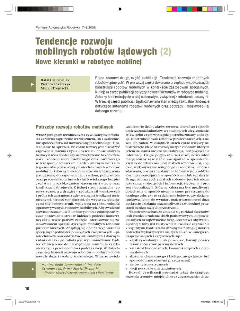 Pomiary Automatyka Robotyka 7-8/2008 Tendencje rozwoju mobilnych robotów lądowych (2) Nowe kierunki w robotyce mobilnej Rafał Czupryniak Piotr Szynkarczyk Maciej Trojnacki Praca stanowi drugą część publikacji „Tendencje rozwoju mobilnych robotów lądowych”. W pierwszej części dokonano przeglądu współczesnych konstrukcji robotów mobilnych w kontekście zastosowań specjalnych. Niniejsza część publikacji dotyczy nowych kierunków w robotyce mobilnej. Autorzy koncentrują się w niej na tematyce związanej z robotami rzucanymi. W trzeciej części publikacji będą omawiane stan wiedzy i aktualne tendencje dotyczące autonomii robotów mobilnych oraz potrzeby i możliwości jej dalszego rozwoju. Potrzeby rozwoju robotów mobilnych Wraz z postępem technicznym i cywilizacyjnym wzrasta zarówno zagrożenie terroryzmem, jak i uzależnienie społeczeństw od nowoczesnych technologii. Uzależnienie to sprawia, że coraz łatwiej jest stworzyć zagrożenie mienia i życia obywateli. Spowodowało to duży nacisk społeczny na zwiększenie bezpieczeństwa i kontroli ruchu osobowego oraz towarowego w transporcie lotniczym. Bardzo istotnym skutkiem tego nacisku jest rozwój pirotechnicznych robotów mobilnych. Głównym motorem wzrostu ich znaczenia jest dążenie do zapewnienia cywilom, policjantom oraz pracownikom innych służb większego bezpieczeństwa w szybko zmieniającym się świecie oraz konfliktach zbrojnych. Z jednej strony zamachy terrorystyczne, a z drugiej – redukcja sił wojskowych i próba ich zastąpienia adekwatnymi środkami technicznymi, nieuszczuplającymi, ale wręcz zwiększającymi siłę bojową armii, wpływają na różnorodność opracowywanych robotów mobilnych. Aby zwalczać zjawisko zamachów bombowych oraz zmniejszać ryzyko poniesienia strat w ludziach podczas konkretnej akcji, wiele państw zaczęło interesować się zastosowaniem specjalistycznych mobilnych robotów pirotechnicznych. Znajdują się one na wyposażeniu specjalnych jednostek policyjnych i wojskowych – pirotechników oraz oddziałów szturmowych. Głównym zadaniem takiego robota jest wyeliminowanie bądź też zmniejszenie do niezbędnego minimum ryzyka utraty życia przez operatora podczas akcji. W dotychczasowej historii rozwoju robotów mobilnych dominowały duże i średnie konstrukcje. Wraz ze zwięk- mgr inż. Rafał Czupryniak, dr inż. Piotr Szynkarczyk, dr inż. Maciej Trojnacki – Przemysłowy Instytut Automatyki i Pomiarów szaniem się liczby aktów terroru, charakter i sposób umieszczania ładunków wybuchowych uległ zmianie. W związku z tym wystąpiła potrzeba zmiany koncepcji, konstrukcji i skali robotów pirotechnicznych, a nawet ich zadań. W ostatnich latach coraz większy nacisk zaczęto kłaść na rozwój małych robotów, których celem działania nie jest neutralizacja, lecz pozyskanie informacji. Dzięki pozyskaniu właściwej ilości informacji, służby są w stanie zareagować w sposób adekwatny do zdarzenia. Rolą małych robotów jest, i będzie, wykonywanie wstępnego rekonesansu miejsca zdarzenia, pozyskanie danych i informacji dla oddziałów interwencyjnych w sposób jawny lub też skryty. Drugą istotną cechą małych robotów jest ich niezależna praca jako źródeł informacji, śledzenia i prostej neutralizacji. Główną zaletą ma być możliwość dojechania w sposób niezauważony praktycznie do każdego celu, czy to są działania bojowe, czy akcja ratunkowa. Ich małe wymiary mają gwarantować dużą dyskrecję działania oraz możliwość swobodnej penetracji bardzo małych przestrzeni. Współcześnie bardzo zmienia się rozkład akcentów, jeśli chodzi o zadania służb państwowych, odpowiedzialnych za zapewnienie bezpieczeństwa obywateli. Z jednej strony jest relatywnie niewielkie zagrożenie klasycznymi konfliktami zbrojnymi, z drugiej narasta potrzeba wykorzystywania tych służb w innego rodzaju sytuacjach kryzysowych, np.: klęsk żywiołowych, jak powodzie, lawiny, pożary lasów i obiektów przemysłowych katastrof budowlanych, komunikacyjnych i przemysłowych skażenia chemicznego i biologicznego (może być spowodowane różnymi przyczynami) aktów terrorystycznych akcji poszukiwania zaginionych. Rozwój cywilizacji prowadzi także do ciągłego rozwoju terenów miejskich oraz zagęszczenia ich za- 10 Czupryniak2.indd 10 7/28/2008 9:12:49 AM Pomiary Automatyka Robotyka 7-8/2008 budowy. Wraz z tym wzrasta ryzyko katastrof budowlanych. Gruzowisko powstałe po katastrofie budowlanej jest środowiskiem wyjątkowo niebezpiecznym, a praca w nim zagraża zdrowiu i życiu ratowników. Jest zatem zrozumiałe, że prowadzone są liczne prace badawcze i konstrukcyjne, dotyczące robotów mobilnych przeznaczonych do wspomagania różnych aspektów działań poszukiwawczo-ratowniczych. Udane konstrukcje robotów poszukiwawczo-ratowniczych mogą stać się istotnym elementem uzupełniającym systemu reagowania na katastrofy w obszarach miejskich. Ważne jest więc rozpoznanie oczekiwań przyszłych użytkowników wobec robotów poszukiwawczo-ratowniczych oraz uwzględnienie wiedzy i doświadczenia ekspertów w dziedzinie prowadzenia akcji ratowniczych na gruzowiskach. Roboty poszukiwawczo-ratownicze można podzielić na: kołowe, gąsienicowe, pełzające i niekonwencjonalne. Zazwyczaj nie mogą samodzielnie poruszać się po obszarze gruzowiska i są przenoszone przez operatora z jednego miejsca pracy do drugiego. Ich podstawowym zadaniem jest penetrowanie wnętrza gruzowiska w celu odnalezienia poszkodowanych. Mogą także dostarczać informacji o strukturze gruzowiska, co ułatwia podjęcie decyzji dotyczących dalszych poszukiwań lub odgruzowania, a także jest bardzo istotne dla bezpieczeństwa samych ratowników. Ważną cechą robota jest jego żywotność podczas akcji ratowniczej. Łatwość demontażu, naprawy i ponownego montażu robota jest czynnikiem często decydującym o powodzeniu akcji, gdyż zazwyczaj r