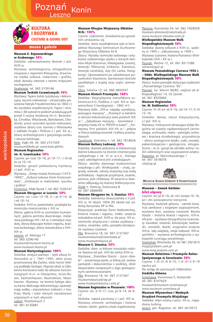 KULTURA I ROZRYWKA CULTURE & GOING OUT muzea i galerie Muzeum E. Bojanowskiego w Grabonogu: 50% Siedziba: odrestaurowany dworek z po³. XVIII w. Wystawy: archeologiczna, etnograficzna zwi¹zana z regionem Biskupizny, drewniana rzeŸba ludowa, malarstwo i grafika, obok dworku internat z tanimi miejscami noclegowymi. Grabonóg, tel. 065 5739146 Muzeum Technik Ceramicznych: 50% Wystawy: fajans kolski (u¿ytkowy i dekoracyjny, rêcznie malowany) – od pocz¹tku powstania Fabryki Freudenreichów (w 1842 r.) do wyrobów wspó³czesnych; fajans i ceramika z 38 wytwórni polskich produkuj¹cych przed II wojn¹ œwiatow¹ (m.in. Baranówka, Æmielów, W³oc³awek, Boles³awiec, Chodzie¿); prace autorskie rêcznie malowane, osobliwe zbiory tzw. lavinitu z W³oc³awka z zak³adu Krupki i Perlicza z I po³. XX w.; zbiory archeologiczne z gotyckiego zamku i ratusza kolskiego. Ko³o, Kajki 44, tel. 063 2721559 [email protected], www.kolo.pl/mtc Muzeum Regionalne im. H. £awniczaka: 50% Czynne: pn–czw 10–16, pt 10–17, I i III nd m-ca 10–14. Siedziba: gmach poklasztorny trynitarzy z I po³. XVIII w. Wystawy: „Dzieje miasta Krotoszyn (1415– 1945)”, „Kultura ludowa Ziemi Krotoszyñskiej”, „Krotoszyn w malarstwie, rysunku i grafice”. Krotoszyn, Ma³y Rynek 1, tel. 062 7226147 Muzeum Okrêgowe w Lesznie: 50% Czynne: wt i czw 13–18, œr i pt 9–14, sb i nd 10–14. Siedziba: XVIII-w. pastorówka i przyleg³a kamieniczka mieszczañska z XIX w. Zbiory: galeria XVIII-w. portretów trumiennych, galeria portretu dworskiego, malarstwa polskiego XIX i XX w. o tematyce wiejskiej, zbiory dotycz¹ce historii regionu, bractwa kurkowego, zbiory starodruków z XVII– XIX w. Leszno, pl. Metziga 17 tel. 065 5296140 [email protected] www.muzeum.leszno.pl Muzeum Martyrologiczne: 100% Siedziba: miejsce pamiêci – by³e obozy hitlerowskie w l. 1941–1945, obóz pracy przymusowej dla ¯ydów, obóz karno-œledczy podleg³y Gestapo. Poprzez obóz w ¯abikowie kierowano ludzi do obozów koncentracyjnych m.in. w Oœwiêcimiu, Gross-Rosen, Sachsenhausen, Ravensbrück, Mauthausen. Wystawy: na terenie by³ego obozu karno-œledczego dokumentuj¹ i upamiêtniaj¹ walkê i mêczeñstwo ludnoœci z tzw. Kraju Warty i ludzi ró¿nych narodowoœci wiêzionych w tych obozach. Luboñ, Niez³omnych 2 tel. 061 8130681 98 Muzeum Misyjne Misjonarzy Oblatów M.N.: 100% Czynne: codziennie. Zwiedzanie po uprzednim umówieniu siê. Siedziba: dwie wyodrêbnione sale w kompleksie Wy¿szego Seminarium Duchownego Misjonarzy Oblatów M.N. Zbiory: Wyroby rzemios³a ludowego i artyku³ów codziennego u¿ytku z ró¿nych terenów Afryki (Kamerun, Madagaskar, Lesoto), Ameryki Pó³nocnej (Indianie, Eskimosi), Ameryki £aciñskiej, Azji (Sri Lanka, Hongkong). Oprowadzanie po zabytkowym pocysterskim klasztorze, barokowym koœciele parafialnym z krypt¹ oraz czêœci seminarium. Obra, Szkolna 12, tel. 068 3842047 Muzeum Historii Przemys³u: 100% Siedziba: klasycystyczna manufaktura sukiennicza A.G. Fiedlera, z I po³. XIX w. (powierzchnia 5 kondygnacji – 1862 m2). Wystawy sta³e: „XIX-w. napêdy, wynalazcy, pracuj¹ce maszyny”, „Przemys³ w kaliskim w okresie industrializacji ziem polskich XIX w.”, „Zabytkowe maszyny – bonneterie – projekty mody XX w. PWSSP w £odzi”, „Fortepiany firm polskich XIX–XX w.”, jedyna w Polsce kolekcja koronek i haftów przemys³owych. Opatówek, Koœcielna 1, tel. 062 7618626 Muzeum Kultury Ludowej: 30% Siedziba: skansen po³o¿ony w malowniczej dolinie £obozonki na terenie cmentarzyska cia³opalnego z ok. VI w. p.n.e., którego czêœæ udostêpniona jest zwiedzaj¹cym. Zbiory: obiekty dawnego budownictwa wiejskiego z p³n. Wielkopolski – chaty, zagrody, wiatraki, remizê stra¿ack¹ oraz ma³¹ architekturê – kapliczki przydro¿ne, studnie, piwnice, piec chlebowy. W sezonie w skansenie odbywaj¹ siê imprezy folklorystyczne. Osiek n. Noteci¹, Dworcowa 8 tel. 067 2866090 Muzeum Okrêgowe im. S. Staszica: 50% Siedziba: kamienica mieszczañska z II po³. XIX w. W latach 1934–39 obiekt by³ siedzib¹ Konsulatu RP w Pile. Ekspozycje: pradzieje Ziemi Nadnoteckiej, historia miasta i regionu, mebli, wnêtrza mieszkalne od po³. XVIII w. do pocz. XX w., rzemios³o artystyczne i sztuka u¿ytkowa – srebro, ceramika, szk³o, ponadto tematyczne wystawy czasowe. Pi³a, Browarna 18, tel. 067 2131567 [email protected] www.muzeumstaszica.pl Muzeum S. Staszica: 50% Siedziba: dom, w którym mieszka³a rodzina Staszica od po³. XVII do koñca XVIII w. Wystawa: „Stanis³aw Staszic – ¿ycie i dzie³a” – prezentacja epoki, w której ¿y³, zestaw pami¹tek i dokumentów z podró¿y, zbiór eksponatów zwi¹zanych z jego geologicznymi zainteresowaniami. Pi³a, Browarna 18, tel. 067 2131567 [email protected] www.muzeumstaszica.i-pila.pl Muzeum Regionalne w Pleszewie: 100% Czynne: wt, œr 9–17, czw, pt 9–14, sb 9– 12. Siedziba: zajazd pocztowy z I po³. XIX w. Wystawy zmienne: archeologia i historia miasta i okolic, galeria sztuki wspó³czesnej. Pleszew, Poznañska 34, tel. 062 7428359 [email protected] www.muzeum-pleszew.isnet.pl Wielkopolskie Muzeum Walk Niepodleg³oœciowych: 50% Siedziba: dawny odwach z XVIII w., spalony w 1945 r., odbudowany w 1950 r. Wystawy czasowe: historia Poznania i Wielkopolski (XIX i XX w.). Poznañ, WoŸna 12, tel. 061 8517288 [email protected] Muzeum Poznañskiego Czerwca 1956 r. – Oddz. Wielkopolskiego Muzeum Walk Niepodleg³oœciowych: 50% Zbiory: liczne pami¹tki dotycz¹ce wydarzeñ „Poznañskiego Czerwca ‘56”. Poznañ, œw. Marcin 80/82, wejœcie od al. Niepodleg³oœci 14, CK Zamek tel. 061 8529464 Muzeum Regionalne im. W. Dutkiewicz: 50% Czynne: IV–IX wt–sb 9–16, nd 14–17; X–III 13–16. Siedziba: dawny ratusz klasycystyczny, z I po³. XIX w. Wystawy: historyczna obrazuj¹ca dzieje RogoŸna od czasów najdawniejszych (archeologia, archiwalia, realia – pami¹tki cechowe i bractwa strzeleckiego), przyrodnicza – zbiory z