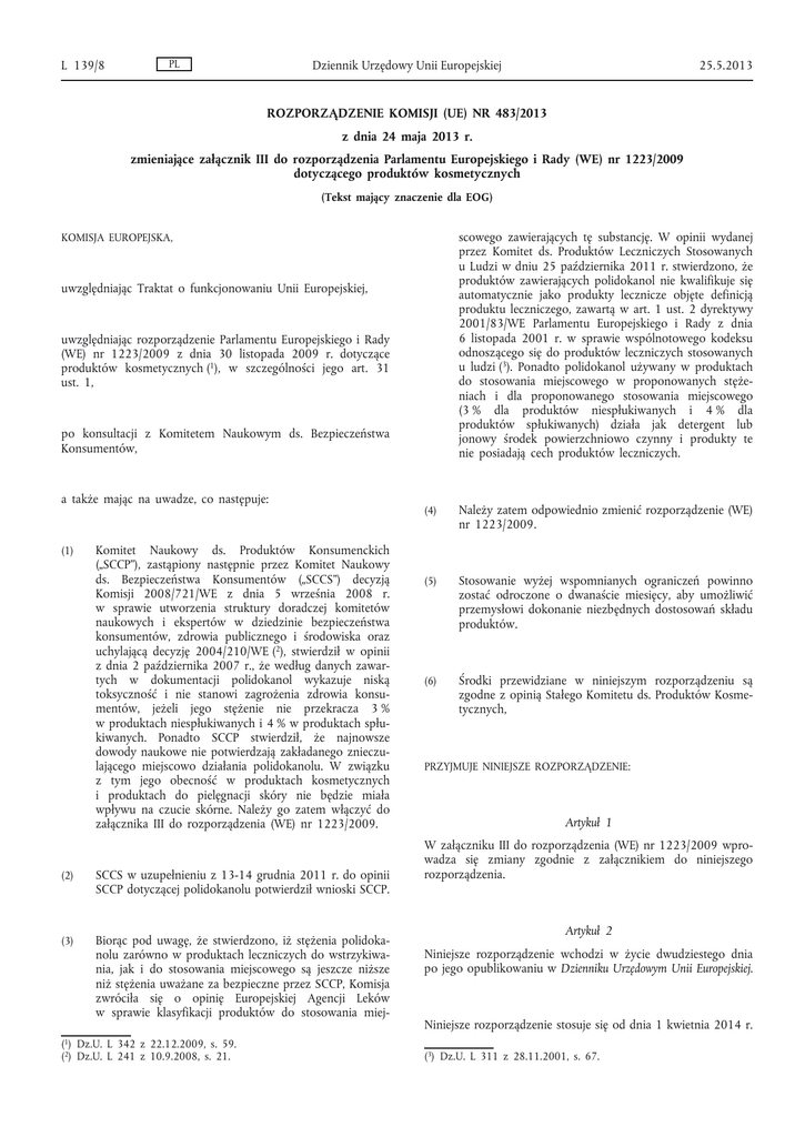 L 139/8 PL Dziennik Urzędowy Unii Europejskiej 25.5.2013 ROZPORZĄDZENIE KOMISJI (UE) NR 483/2013 z dnia 24 maja 2013 r. zmieniające załącznik III do rozporządzenia Parlamentu Europejskiego i Rady (WE) nr 1223/2009 dotyczącego produktów kosmetycznych (Tekst mający znaczenie dla EOG) scowego zawierających tę substancję. W opinii wydanej przez Komitet ds. Produktów Leczniczych Stosowanych u Ludzi w dniu 25 października 2011 r. stwierdzono, że produktów zawierających polidokanol nie kwalifikuje się automatycznie jako produkty lecznicze objęte definicją produktu leczniczego, zawartą w art. 1 ust. 2 dyrektywy 2001/83/WE Parlamentu Europejskiego i Rady z dnia 6 listopada 2001 r. w sprawie wspólnotowego kodeksu odnoszącego się do produktów leczniczych stosowanych u ludzi (3). Ponadto polidokanol używany w produktach do stosowania miejscowego w proponowanych stęże niach i dla proponowanego stosowania miejscowego (3 % dla produktów niespłukiwanych i 4 % dla produktów spłukiwanych) działa jak detergent lub jonowy środek powierzchniowo czynny i produkty te nie posiadają cech produktów leczniczych. KOMISJA EUROPEJSKA, uwzględniając Traktat o funkcjonowaniu Unii Europejskiej, uwzględniając rozporządzenie Parlamentu Europejskiego i Rady (WE) nr 1223/2009 z dnia 30 listopada 2009 r. dotyczące produktów kosmetycznych (1), w szczególności jego art. 31 ust. 1, po konsultacji z Komitetem Naukowym ds. Bezpieczeństwa Konsumentów, a także mając na uwadze, co następuje: (1) Komitet Naukowy ds. Produktów Konsumenckich („SCCP”), zastąpiony następnie przez Komitet Naukowy ds. Bezpieczeństwa Konsumentów („SCCS”) decyzją Komisji 2008/721/WE z dnia 5 września 2008 r. w sprawie utworzenia struktury doradczej komitetów naukowych i ekspertów w dziedzinie bezpieczeństwa konsumentów, zdrowia publicznego i środowiska oraz uchylającą decyzję 2004/210/WE (2), stwierdził w opinii z dnia 2 października 2007 r., że według danych zawar tych w dokumentacji polidokanol wykazuje niską toksyczność i nie stanowi zagrożenia zdrowia konsu mentów, jeżeli jego stężenie nie przekracza 3 % w produktach niespłukiwanych i 4 % w produktach spłu kiwanych. Ponadto SCCP stwierdził, że najnowsze dowody naukowe nie potwierdzają zakładanego znieczu lającego miejscowo działania polidokanolu. W związku z tym jego obecność w produktach kosmetycznych i produktach do pielęgnacji skóry nie będzie miała wpływu na czucie skórne. Należy go zatem włączyć do załącznika III do rozporządzenia (WE) nr 1223/2009. (2) SCCS w uzupełnieniu z 13-14 grudnia 2011 r. do opinii SCCP dotyczącej polidokanolu potwierdził wnioski SCCP. (3) Biorąc pod uwagę, że stwierdzono, iż stężenia polidoka nolu zarówno w produktach leczniczych do wstrzykiwa nia, jak i do stosowania miejscowego są jeszcze niższe niż stężenia uważane za bezpieczne przez SCCP, Komisja zwróciła się o opinię Europejskiej Agencji Leków w sprawie klasyfikacji produktów do stosowania miej (1 ) Dz.U. L 342 z 22.12.2009, s. 59. (2) Dz.U. L 241 z 10.9.2008, s. 21. (4) Należy zatem odpowiednio zmienić rozporządzenie (WE) nr 1223/2009. (5) Stosowanie wyżej wspomnianych ograniczeń powinno zostać odroczone o dwanaście miesięcy, aby umożliwić przemysłowi dokonanie niezbędnych dostosowań składu produktów. (6) Środki przewidziane w niniejszym rozporządzeniu są zgodne z opinią Stałego Komitetu ds. Produktów Kosme tycznych, PRZYJMUJE NINIEJSZE ROZPORZĄDZENIE: Artykuł 1 W załączniku III do rozporządzenia (WE) nr 1223/2009 wpro wadza się zmiany zgodnie z załącznikiem do niniejszego rozporządzenia. Artykuł 2 Niniejsze rozporządzenie wchodzi w życie dwudziestego dnia po jego opublikowaniu w Dzienniku Urzędowym Unii Europejskiej. Niniejsze rozporządzenie stosuje się od dnia 1 kwietnia 2014 r. (3) Dz.U. L 311 z 28.11.2001, s. 67. 25.5.2013 PL Dziennik Urzędowy Unii Europejskiej Niniejsze rozporządzenie wiąże w całości i jest bezpośrednio stosowane we wszystkich państwach członkowskich. Sporządzono w Brukseli dnia 24 maja 2013 r. W imieniu Komisji José Manuel BARROSO Przewodniczący L 139/9 L 139/10 ZAŁĄCZNIK W załączniku III do rozporządzenia (WE) nr 1223/2009 dodaje się pozycję w brzmieniu: Ograniczenia Określenie substancji Numer porządkowy „257 Nazwa w słowniku wspólnych nazw składników Nr CAS Nr WE Rodzaj produktu, części ciała Maksymalne stężenie w preparacie gotowym do użycia Inne b c d e f g h Polidokanol Laureth-9 3055-99-0 221-284-4 a) Produkty niespłukiwane a) 3,0 % b) Produkty spłukiwane b) 4,0 %” Warunki i ostrzeżenia na opakowaniach PL a Nazwa chemiczna/INN i Dziennik Urzędowy Unii Europejskiej 25.5.2013