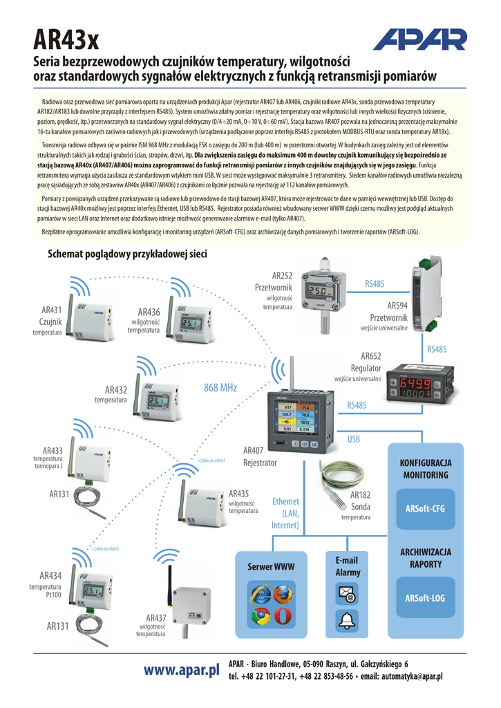 AR43x Seria bezprzewodowych czujników temperatury, wilgotności oraz standardowych sygnałów elektrycznych z funkcją retransmisji pomiarów Radiowa oraz przewodowa sieć pomiarowa oparta na urządzeniach produkcji Apar (rejestrator AR407 lub AR406, czujniki radiowe AR43x, sonda przewodowa temperatury AR182/AR183 lub dowolne przyrządy z interfejsem RS485). System umożliwia zdalny pomiar i rejestrację temperatury oraz wilgotności lub innych wielkości fizycznych (ciśnienie, poziom, prędkość, itp.) przetworzonych na standardowy sygnał elektryczny (0/4÷20 mA, 0÷10 V, 0÷60 mV). Stacja bazowa AR407 pozwala na jednoczesną prezentację maksymalnie 16-tu kanałów pomiarowych zarówno radiowych jak i przewodowych (urządzenia podłączone poprzez interfejs RS485 z protokołem MODBUS-RTU oraz sonda temperatury AR18x). Transmisja radiowa odbywa się w paśmie ISM 868 MHz z modulacją FSK o zasięgu do 200 m (lub 400 m) w przestrzeni otwartej. W budynkach zasięg zależny jest od elementów strukturalnych takich jak rodzaj i grubości ścian, stropów, drzwi, itp. Dla zwiększenia zasięgu do maksimum 400 m dowolny czujnik komunikujący się bezpośrednio ze stacją bazową AR40x (AR407/AR406) można zaprogramować do funkcji retransmisji pomiarów z innych czujników znajdujących się w jego zasięgu. Funkcja retransmitera wymaga użycia zasilacza ze standardowym wtykiem mini USB. W sieci może występować maksymalnie 3 retransmitery. Siedem kanałów radiowych umożliwia niezależną pracę sąsiadujących ze sobą zestawów AR40x (AR407/AR406) z czujnikami co łącznie pozwala na rejestrację aż 112 kanałów pomiarowych. Pomiary z powiązanych urządzeń przekazywane są radiowo lub przewodowo do stacji bazowej AR407, która może rejestrować te dane w pamięci wewnętrznej lub USB. Dostęp do stacji bazowej AR40x możliwy jest poprzez interfejs Ethernet, USB lub RS485. Rejestrator posiada również wbudowany serwer WWW dzięki czemu możliwy jest podgląd aktualnych pomiarów w sieci LAN oraz Internet oraz dodatkowo istnieje możliwość generowanie alarmów e-mail (tylko AR407). Bezpłatne oprogramowanie umożliwia konfigurację i monitoring urządzeń (ARSoft-CFG) oraz archiwizację danych pomiarowych i tworzenie raportów (ARSoft-LOG). Schemat poglądowy przykładowej sieci AR252 Przetwornik AR431 Czujnik RS485 wilgotność temperatura AR436 AR594 Przetwornik wilgotność temperatura temperatura wejście uniwersalne AR652 Regulator wejście uniwersalne 868 MHz AR432 RS485 temperatura RS485 USB AR433 temperatura termopara J <200m do AR407 AR407 Rejestrator AR435 AR131 wilgotność temperatura Ethernet (LAN, Internet) KONFIGURACJA MONITORING AR182 Sonda temperatura <200m do AR435 Serwer WWW AR434 temperatura Pt100 AR131 E-mail Alarmy ARSoft-CFG ARCHIWIZACJA RAPORTY ARSoft-LOG AR437 wilgotność temperatura www.apar.pl APAR - Biuro Handlowe, 05-090 Raszyn, ul. Gałczyńskiego 6 tel. +48 22 101-27-31, +48 22 853-48-56 • email: [email protected] Charakterystyka n seria radiowych czujników przeznaczona do współpracy z rejestratorem AR40x (AR407/AR406) AR431/1 AR435/1 n transmisja radiowa w pasmie ISM 868MHz, zasięg w przestrzeni otwartej do 200m (lub 400m) - zależny od lokalnych warunków propagacji fal radiowych: rodzaju i grubości ścian, stropów, itp. n możliwość zwiększenia zasięgu radiowego do 400 m poprzez włączenie funkcji retransmisji pomiarów pochodzących z innych czujników (retransmisja wymaga zasilania poprzez port mini USB, w sieci może występować maksymalnie 3 retransmitery znajdujące się w zasięgu AR407/AR406) n 7 kanałów radiowych umożliwiających niezależną pracę siedmiu sąsiadujących zestawów składających się z rejestratorów AR407/AR406 i powiązanych z nimi czujników n dostępne modele: - AR431, AR432 - pomiar temperatury w zakresie -30÷80 °C lub-20÷70 °C, czujnik 1-kanałowy - AR433, AR434 - uniwersalne wejście pomiarowe termometryczne i analogowe (Pt100/Ni100/J/K/S/B/ R/T/E/N/0÷20mA/ 4÷20mA/0÷10V/0÷60mV/0÷700Ω ) oraz wbudowany pomiar temperatury otoczenia (-20÷70 °C), czujnik 2-kanałowy - kompensacja rezystancji linii dla czujników rezystancyjnych oraz temperatury zimnych końców termopar (automatyczna lub stała) - AR435, AR436, AR437 - pomiar wilgotności względnej i temperatury (-30÷80 °C lub-20÷70 °C), 2-kanałowy n sondy temperatury oraz wilgotności zintegrowane w obudowie lub zewnętrzne (uwaga: nie zalewać wodą oraz unikać kondensacji pary wodnej w urządzeniu) n AR432, AR434, AR436: - wyświetlacz LCD pokazujący wartości mierzone oraz komunikaty i błędy - alarmy dolne, górne, w paśmie i poza pasmem, sygnalizacja diodą LED n możliwość prezentacji i rejestracji danych z maksymalnie 16-tu kanałów pomiarowych w pojedynczym rejestratorze AR407/AR406 (z dowolnych czujników 1- lub 2-kanałowych) n obudowa przenośna dostosowana do montażu naściennego n zasilanie bateryjne z możliwością wymiany baterii we własnym zakresie n długi czas pracy na nowej baterii (do około 4 lat bez wyświetlacza LCD, w temperaturze pokojowej, okresie pomiarowym > 30 min i niezakłóconej transmisji radiowej) n dołączone bezpłatne oprogramowanie umożliwiające prezentację graficzną lub tekstową zarejestrowanych (w AR407/AR406) wyników oraz konfigurację parametrów n programowalna rozdzielczość wskazań, parametry kalibracyjne, alarmowe, numery identyfikacyjne (ID) czujnika oraz retransmitera, rodzaj wejścia i zakres pomiarowy dla sygnałów analogowych (AR433/434) oraz inne parametry konfiguracyjne n konfiguracja parametrów poprzez interfejs szeregowy USB n zabezpieczenie przed odwrotnym włożeniem baterii n wysoka dokładność, długoterminowa stabilność pomiarów i odporność na zakłócenia n zgodność z dyrektywą R&TTE (99/5/WE) AR432/1 AR436/1 Dla powyższych modeli istnieje możliwość umieszczenia elementu pomiarowego w zewnętrznej sondzie AR433 n AR437 - stopień ochr