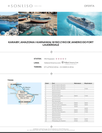 OFERTA KARAIBY, AMAZONIA I KARNAWAŁ W RIO Z RIO DE JANERIO DO FORT LAUDERDALE STATEK: MS Maasdam LINIA: Holland America Line TERMIN: 07 LUTEGO 2016 – 01 MARCA 2016 TRASA Dzień 1 2 3 4 5 6 7 8 9 10 11 12 13 14 15 16 17 18 19 20 21 Port Rio de Janerio, Brazylia Rio de Janerio, Brazylia Rio de Janerio, Brazylia dzień na morzu dzień na morzu dzień na morzu Fortaleza, Brazylia dzień na morzu dzień na morzu Rejs Amazonką Santarem, Brazylia Boca de Valeria, Brazylia Manaus, Brazylia Manaus, Brazylia Parintins, Brazylia Alter Do Chao, Brazylia dzień na morzu dzień na morzu dzień na morzu Castries, St Lucia Philipsburg, St. Maarten Wpłynięcie 08:00 08:00 08:00 10:00 08:00 08:00 08:00 09:00 SONRISO | Lipiński Passage | Al. Jero zo limskie 61 | 00-697 Warszawa tel. +48 22 206 45 00 | fax. +48 22 100 14 61 | e-mail: biuro @so nriso .pl | web: www.so nriso .pl Wypłynięcie 17:00 17:00 18:00 18:00 16:00 17:00 17:00 16:00 17:00 OFERTA Dzień Port Wpłynięcie Wypłynięcie 22 23 dzień na morzu dzień na morzu - - 24 Fort Lauderdale, Stany Zjednoczone 08:00 - CENA Typ kabiny Cena z osobę Kabina z oknem od 3 598 EUR Kabina z balkonem od 5 098 EUR kabina wewnętrzna od 3 098 EUR Verandah Suite od 7 315 EUR CENA ZAWIERA DOTATKOWE OPŁATY zakwaterowanie w 2 - os. kabinie wybranej kategorii pełne wyżywienie: 3 posiłki, przekąski między posiłakmi, bufet o północy napoje do posiłków: woda stołowa, kawa, herbata oraz sok do śniadania serwis bagażowy podczas wejścia i zejścia ze statku 24 godzinny serwis kabinowy korzystanie z urządzeń sportowo - rekreacyjnych dostępnych na pokładzie (baseny, jacuzzi, boiska sportowe, kluby dla dzieci i młodzieży itp.) udział we wszystkich imprezach organizowanych na pokładzie (przedstawienia, pokazy, aukcje, animacje i inne) obowiązkowe opłaty portowe dojazd/przelot do portu rozpoczęcia i zakończenia rejsu transfery (lotnisko - port - lotnisko) ewentulne noclegi przed lub po rejsie wycieczki fakultatywne napoje: bezalkoholowe, alkoholowe, woda mineralna dostępne w restauracjach i barach (istnieje możliwość wykupienia pakietów napojów, o szczegóły zapytaj w biurze) korzystanie z mini baru w kabinie korzystanie z usług typu: SPA, salon piękności, pralnia itp. wydatki osobiste tj. zakupy w butikach, internet, kasyno itp. obowiązkowa opłata serwisowa (napiwki dla obsługi statku ok. 12,50 USD/os. dorosła/dzień, dzieci poniżej 3 lat nie płacą) obowiązkowe ubezpieczenie turystyczne koszt wymaganych wiz Na życzenie świadczymy dodatkowo usługi: rezerwacje hotelowe na całym świecie rezerwacje biletów lotniczych, trasferów oraz parkingu w porcie rezerwacje wycieczek fakultatywnych i innych atrakcji SONRISO | Lipiński Passage | Al. Jero zo limskie 61 | 00-697 Warszawa tel. +48 22 206 45 00 | fax. +48 22 100 14 61 | e-mail: biuro @so nriso .pl | web: www.so nriso .pl
