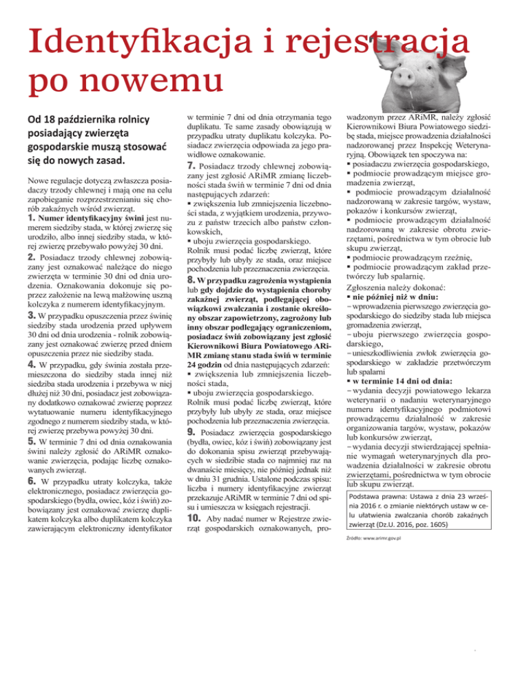 Identyfikacja i rejestracja po nowemu Od 18 października rolnicy posiadający zwierzęta gospodarskie muszą stosować się do nowych zasad. Nowe regulacje dotyczą zwłaszcza posiadaczy trzody chlewnej i mają one na celu zapobieganie rozprzestrzenianiu się chorób zakaźnych wśród zwierząt. 1. numer identyfikacyjny świni jest numerem siedziby stada, w której zwierzę się urodziło, albo innej siedziby stada, w której zwierzę przebywało powyżej 30 dni. 2. Posiadacz trzody chlewnej zobowiązany jest oznakować należące do niego zwierzęta w terminie 30 dni od dnia urodzenia. Oznakowania dokonuje się poprzez założenie na lewą małżowinę uszną kolczyka z numerem identyfikacyjnym. 3. W przypadku opuszczenia przez świnię siedziby stada urodzenia przed upływem 30 dni od dnia urodzenia - rolnik zobowiązany jest oznakować zwierzę przed dniem opuszczenia przez nie siedziby stada. 4. W przypadku, gdy świnia została prze mieszczona do siedziby stada innej niż siedziba stada urodzenia i przebywa w niej dłużej niż 30 dni, posiadacz jest zobowiązany dodatkowo oznakować zwierzę poprzez wytatuowanie numeru identyfikacyjnego zgodnego z numerem siedziby stada, w której zwierzę przebywa powyżej 30 dni. 5. W terminie 7 dni od dnia oznakowania świni należy zgłosić do ARiMR oznakowanie zwierzęcia, podając liczbę oznakowanych zwierząt. 6. W przypadku utraty kolczyka, także elektronicznego, posiadacz zwierzęcia gospodarskiego (bydła, owiec, kóz i świń) zobowiązany jest oznakować zwierzę duplikatem kolczyka albo duplikatem kolczyka zawierającym elektroniczny identyfikator w terminie 7 dni od dnia otrzymania tego duplikatu. Te same zasady obowiązują w przypadku utraty duplikatu kolczyka. Posiadacz zwierzęcia odpowiada za jego prawidłowe oznakowanie. 7. Posiadacz trzody chlewnej zobowiązany jest zgłosić ARiMR zmianę liczebności stada świń w terminie 7 dni od dnia następujących zdarzeń: § zwiększenia lub zmniejszenia liczebności stada, z wyjątkiem urodzenia, przywozu z państw trzecich albo państw członkowskich, § uboju zwierzęcia gospodarskiego. Rolnik musi podać liczbę zwierząt, które przybyły lub ubyły ze stada, oraz miejsce pochodzenia lub przeznaczenia zwierzęcia. 8. W przypadku zagrożenia wystąpienia lub gdy dojdzie do wystąpienia choroby zakaźnej zwierząt, podlegającej obowiązkowi zwalczania i zostanie określony obszar zapowietrzony, zagrożony lub inny obszar podlegający ograniczeniom, posiadacz świń zobowiązany jest zgłosić Kierownikowi Biura Powiatowego ARiMR zmianę stanu stada świń w terminie 24 godzin od dnia następujących zdarzeń: § zwiększenia lub zmniejszenia liczebności stada, § uboju zwierzęcia gospodarskiego. Rolnik musi podać liczbę zwierząt, które przybyły lub ubyły ze stada, oraz miejsce pochodzenia lub przeznaczenia zwierzęcia. 9. Posiadacz zwierzęcia gospodarskiego (bydła, owiec, kóz i świń) zobowiązany jest do dokonania spisu zwierząt przebywających w siedzibie stada co najmniej raz na dwanaście miesięcy, nie później jednak niż w dniu 31 grudnia. Ustalone podczas spisu: liczba i numery identyfikacyjne zwierząt przekazuje ARiMR w terminie 7 dni od spisu i umieszcza w księgach rejestracji. 10. Aby nadać numer w Rejestrze zwierząt gospodarskich oznakowanych, pro- wadzonym przez ARiMR, należy zgłosić Kierownikowi Biura Powiatowego siedzibę stada, miejsce prowadzenia działalności nadzorowanej przez Inspekcję Weterynaryjną. Obowiązek ten spoczywa na: § posiadaczu zwierzęcia gospodarskiego, § podmiocie prowadzącym miejsce gromadzenia zwierząt, § podmiocie prowadzącym działalność nadzorowaną w zakresie targów, wystaw, pokazów i konkursów zwierząt, § podmiocie prowadzącym działalność nadzorowaną w zakresie obrotu zwierzętami, pośrednictwa w tym obrocie lub skupu zwierząt, § podmiocie prowadzącym rzeźnię, § podmiocie prowadzącym zakład przetwórczy lub spalarnię. Zgłoszenia należy dokonać: § nie później niż w dniu: - wprowadzenia pierwszego zwierzęcia gospodarskiego do siedziby stada lub miejsca gromadzenia zwierząt, - uboju pierwszego zwierzęcia gospodarskiego, - unieszkodliwienia zwłok zwierzęcia gospodarskiego w zakładzie przetwórczym lub spalarni § w terminie 14 dni od dnia: - wydania decyzji powiatowego lekarza weterynarii o nadaniu weterynaryjnego numeru identyfikacyjnego podmiotowi prowadzącemu działalność w zakresie organizowania targów, wystaw, pokazów lub konkursów zwierząt, - wydania decyzji stwierdzającej spełnianie wymagań weterynaryjnych dla prowadzenia działalności w zakresie obrotu zwierzętami, pośrednictwa w tym obrocie lub skupu zwierząt. Podstawa prawna: Ustawa z dnia 23 wrześ nia 2016 r. o zmianie niektórych ustaw w ce lu ułatwienia zwalczania chorób zakaźnych zwierząt (Dz.U. 2016, poz. 1605) Źródło: www.arimr.gov.pl ZACHODNIOPOMORSKI MAGAZYN ROLNICZY listopad 2016 13