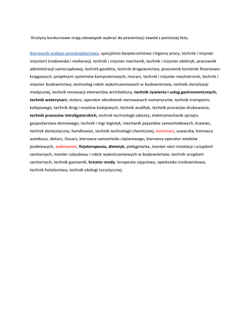 Drużyny konkursowe mają obowiązek wybrać do prezentacji zawód z poniższej listy: Kierownik małego przedsiębiorstwa, specjalista bezpieczeństwa i higieny pracy, technik i inżynier inżynierii środowiska i melioracji, technik i inżynier mechanik, technik i inżynier elektryk, pracownik administracji samorządowej, technik geodeta, technik drogownictwa, pracownik komórek finansowoksięgowych, projektant systemów komputerowych, murarz, technik i inżynier mechatronik, technik i inżynier budownictwa, technolog robót wykończeniowych w budownictwie, technik sterylizacji medycznej, technik renowacji elementów architektury, technik żywienia i usług gastronomicznych, technik weterynarz, stolarz, operator obrabiarek sterowanych numerycznie, technik transportu kolejowego, technik dróg i mostów kolejowych, technik analityk, technik procesów drukowania, technik procesów introligatorskich, technik technologii odzieży, elektromechanik sprzętu gospodarstwa domowego, technik i mgr logistyk, mechanik pojazdów samochodowych, krawiec, technik dentystyczny, handlowiec, technik technologii chemicznej, kominiarz, szwaczka, kierowca autobusu, dekarz, ślusarz, kierowca samochodu ciężarowego, kierowca operator wózków jezdniowych, webmaster, fizjoterapeuta, dietetyk, pielęgniarka, monter sieci instalacji i urządzeń sanitarnych, monter zabudowy i robót wykończeniowych w budownictwie, technik urządzeń sanitarnych, technik gazownik, kreator mody, terapeuta zajęciowy, opiekunka środowiskowa, technik hotelarstwa, technik obsługi turystycznej.