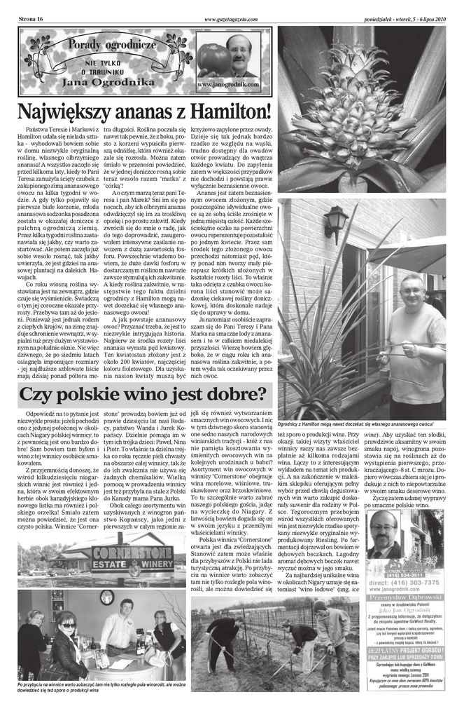 Strona 16 www.gazetagazeta.com poniedziałek - wtorek, 5 - 6 lipca 2010 Porady ogrodnicze NIE TYLKO O TRAWNIKU Jana Ogrodnika www.janogrodnik.com Największy ananas z Hamilton! Państwu Teresie i Markowi z Hamilton udała się nielada sztuka - wyhodowali bowiem sobie w domu niezwykle oryginalną roślinę, własnego olbrzymiego ananasa! A wszystko zaczęło się przed kilkoma laty, kiedy to Pani Teresa zanużyła ścięty czubek z zakupionego zimą ananasowego owocu na kilka tygodni w wodzie. A gdy tylko pojawiły się pierwsze białe korzenie, młoda ananasowa sodzonka posadzona została w okazałej doniczce z pulchną ogrodniczą ziemią. Przez kilka tygodni roślina zastanawiała się jakby, czy warto zastartować. Ale potem zaczęła już sobie wesoło rosnąć, tak jakby uwierzyła, że jest gdzieś na anasowej plantacji na dalekich Hawajach. Co roku wiosną roślina wystawiana jest na zewnątrz, gdzie czuje się wyśmienicie. Świadczą o tym jej coroczne okazałe przyrosty. Przebywa tam aż do jesieni. Ponieważ jest jednak rodem z ciepłych krajów, na zimę znajduje schronienie wewnątrz, w sypialni tuż przy dużym wystawionym na południe oknie. Nic więc dziwnego, że po siedmiu latach osiagnęła imponujące rozmiary - jej najdłuższe szblowate liście mają dzisiaj ponad półtora me- tra długości. Roślina poczuła się nawet tak pewnie, że z boku, prosto z korzeni wypuściła pierwszą odnóżkę, która również okazale się rozrosła. Można zatem śmiało w przenośni powiedzieć, że w jednej doniczce rosną sobie teraz wesoło razem "matka" z "córką"! A o czym marzą teraz pani Teresa i pan Marek? Śni im się po nocach, aby ich olbrzymi ananas odwdzięczył się im za troskliwą opiekę i po prostu zakwitł. Kiedy zwrócili się do mnie o radę, jak do tego doprowadzić, zasugerowałem intensywne zasilanie nawozem z dużą zawartością fosforu. Powszechnie wiadomo bowiem, że duże dawki fosforu w dostarczanym roślinom nawozie zawsze stymulują ich zakwitanie. A kiedy roślina zakwitnie, w następstwie tego faktu dzielni ogrodnicy z Hamilton mogą nawet doczekać się własnego ananasowego owocu! A jak powstaje ananasowy owoc? Przyznać trzeba, że jest to niezwykle intrygująca historia. Najpierw ze środka rozety liści ananasa wyrasta pęd kwiatowy. Ten kwiatostan złożony jest z około 200 kwiatów, najczęściej koloru fioletowego. Dla uzyskania nasion kwiaty muszą być krzyżowo zapylone przez owady. Dzieje się tak jednak bardzo rzadko ze względu na wąski, trudno dostępny dla owadów otwór prowadzący do wnętrza każdego kwiatu. Do zapylenia zatem w większości przypadków nie dochodzi i powstają prawie wyłącznie beznasienne owoce. Ananas jest zatem beznasiennym owocem złożonym, gdzie poszczególne idywidualne owoce są ze sobą ściśle zrośnięte w jedną mięsistą całość. Każde sześciokątne oczko na powierzchni owocu reperezentuje pozostałość po jednym kwiecie. Przez sam środek tego złożonego owocu przechodzi natomiast pęd, który ponad nim tworzy mały pióropusz krótkich ułożonych w kształcie rozety liści. To właśnie taka odcięta z czubka owocu korona liści stanowić może sadzonkę ciekawej rośliny doniczkowej, która doskonale nadaje się do uprawy w domu. Ja natomiast osobiście zapraszam się do Pani Teresy i Pana Marka na smaczne lody z ananasem i to w całkiem niedalekiej przyszłości. Wierzę bowiem głęboko, że w ciągu roku ich ananasowa roślina zakwitnie, a potem wyda tak oczekiwany przez nich owoc. Czy polskie wino jest dobre? Odpowiedź na to pytanie jest niezwykle prosta: jeżeli pochodzi ono z jedynej położonej w okolicach Niagary polskiej winnicy, to z pewnością jest ono bardzo dobre! Sam bowiem tam byłem i wino z tej winnicy osobiście smakowałem. Z przyjemnością donoszę, że wśród kilkudziesięciu niagarskich winnic jest również i jedna, która w swoim efektownym herbie obok kanadyjskiego klonowego listka ma również i polskiego orzełka! Śmiało zatem można powiedzieć, że jest ona czysto polska. Winnice "Corner- stone" prowadzą bowiem już od prawie dziesięciu lat nasi Rodacy, państwo Wanda i Jurek Kopańscy. Dzielnie pomaga im w tym ich trójka dzieci: Paweł, Nina i Piotr. To właśnie ta dzielna trójka co roku ręcznie pieli chwasty na obszarze całej winnicy, tak że do ich zwalcznia nie używa się żadnych chemikaliów. Wielką pomocą w prowadzeniu winnicy jest też przybyła na stale z Polski do Kanady mama Pana Jurka. Obok całego asortymentu win uzyskiwanych z winogron państwo Kopańscy, jako jedni z pierwszych w całym regionie za- Po przybyciu na winnice warto zobaczyć tam nie tylko rozległe pola winorośli, ale można dowiedzieć się też sporo o produkcji wina jęli się również wytwarzaniem smacznych win owocowych. I nic w tym dziwnego skoro stanowią one sedno naszych narodowych winiarskich tradycji - któż z nas nie pamięta kosztowania wyśmienitych owocowych win na kolejnych urodzinach u babci? Asortyment win owocowych w winnicy "Cornerstone" obejmuje wina morelowe, wiśniowe, truskawkowe oraz brzoskwiniowe. To tu szczególnie warto zabrać naszego polskiego gościa, jadąc na wycieczkę do Niagary. Z łatwością bowiem dogada się on w swoim języku z przemiłymi właścicielami winnicy. Polska winnica "Cornerstone" otwarta jest dla zwiedzających. Stanowić zatem może właśnie dla przybyszów z Polski nie lada turystyczną atrakcję. Po przybyciu na winnice warto zobaczyć tam nie tylko rozległe pola winorośli, ale można dowiedzieć się Ogrodnicy z Hamilton mogą nawet doczekać się własnego ananasowego owocu! też sporo o produkcji wina. Przy okazji takiej wizyty właściciel winnicy raczy nas zawsze bezpłatnie aż kilkoma rodzajami wina. Łączy to z interesującym wykładem na temat ich produkcji. A na zakończenie w maleńkim sklepiku oferującym pełny wybór przed chwilą degustowanych win warto zakupić doskonały suweni