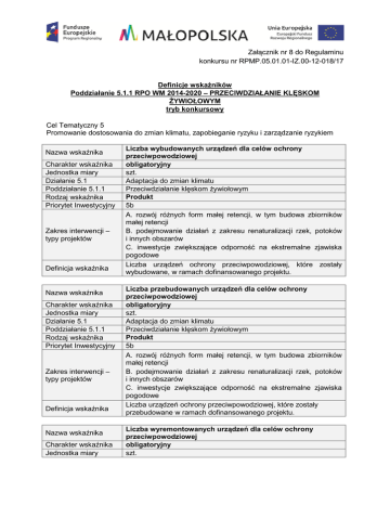 Załącznik nr 8 do Regulaminu konkursu nr RPMP.05.01.01-IZ.00-12-018/17 Definicje wskaźników Poddziałanie 5.1.1 RPO WM 2014-2020 – PRZECIWDZIAŁANIE KLĘSKOM ŻYWIOŁOWYM tryb konkursowy Cel Tematyczny 5 Promowanie dostosowania do zmian klimatu, zapobieganie ryzyku i zarządzanie ryzykiem Nazwa wskaźnika Charakter wskaźnika Jednostka miary Działanie 5.1 Poddziałanie 5.1.1 Rodzaj wskaźnika Priorytet Inwestycyjny Zakres interwencji – typy projektów Definicja wskaźnika Nazwa wskaźnika Charakter wskaźnika Jednostka miary Działanie 5.1 Poddziałanie 5.1.1 Rodzaj wskaźnika Priorytet Inwestycyjny Zakres interwencji – typy projektów Definicja wskaźnika Nazwa wskaźnika Charakter wskaźnika Jednostka miary Liczba wybudowanych urządzeń dla celów ochrony przeciwpowodziowej obligatoryjny szt. Adaptacja do zmian klimatu Przeciwdziałanie klęskom żywiołowym Produkt 5b A. rozwój różnych form małej retencji, w tym budowa zbiorników małej retencji B. podejmowanie działań z zakresu renaturalizacji rzek, potoków i innych obszarów C. inwestycje zwiększające odporność na ekstremalne zjawiska pogodowe Liczba urządzeń ochrony przeciwpowodziowej, które zostały wybudowane, w ramach dofinansowanego projektu. Liczba przebudowanych urządzeń dla celów ochrony przeciwpowodziowej obligatoryjny szt. Adaptacja do zmian klimatu Przeciwdziałanie klęskom żywiołowym Produkt 5b A. rozwój różnych form małej retencji, w tym budowa zbiorników małej retencji B. podejmowanie działań z zakresu renaturalizacji rzek, potoków i innych obszarów C. inwestycje zwiększające odporność na ekstremalne zjawiska pogodowe Liczba urządzeń ochrony przeciwpowodziowej, które zostały przebudowane w ramach dofinansowanego projektu. Liczba wyremontowanych urządzeń dla celów ochrony przeciwpowodziowej obligatoryjny szt. Działanie 5.1 Poddziałanie 5.1.1 Rodzaj wskaźnika Priorytet Inwestycyjny Zakres interwencji – typy projektów Definicja wskaźnika Nazwa wskaźnika Charakter wskaźnika Jednostka miary Działanie 5.1 Poddziałanie 5.1.1 Rodzaj wskaźnika Priorytet Inwestycyjny Zakres interwencji – typy projektów Definicja wskaźnika Nazwa wskaźnika Charakter wskaźnika Jednostka miary Działanie 5.1 Poddziałanie 5.1.1 Rodzaj wskaźnika Priorytet Inwestycyjny Zakres interwencji – typy projektów Adaptacja do zmian klimatu Przeciwdziałanie klęskom żywiołowym Produkt 5b A. rozwój różnych form małej retencji, w tym budowa zbiorników małej retencji B. podejmowanie działań z zakresu renaturalizacji rzek, potoków i innych obszarów C. inwestycje zwiększające odporność na ekstremalne zjawiska pogodowe Liczba urządzeń ochrony przeciwpowodziowej, które zostały poddane remontowi w ramach dofinansowanego projektu. Pojemność obiektów małej retencji obligatoryjny m3 Adaptacja do zmian klimatu Przeciwdziałanie klęskom żywiołowym Produkt 5b A. rozwój różnych form małej retencji, w tym budowa zbiorników małej retencji Możliwa do uzyskania pojemność retencjonowania wody w wyniku budowy/przebudowy obiektów małej retencji. Obiekty małej retencji to budowle i urządzenia służące zatrzymaniu jak największej ilości wody w jej powierzchniowym i przypowierzchniowym obiegu. Są to np.: • sztuczne zbiorniki wodne o pojemności do 5 mln m3; • samodzielne budowle piętrzące i ujęcia wody; • stawy rybne; • inne budowle piętrzące lub transportujące wodę. Liczba przedsięwzięć realizowanych w ramach renaturalizacji obligatoryjny szt. Adaptacja do zmian klimatu Przeciwdziałanie klęskom żywiołowym Produkt (specyficzny dla programu) 5b B. podejmowanie działań z zakresu renaturalizacji rzek, potoków i innych obszarów Liczba przedsięwzięć z zakresu renaturalizacji zrealizowanych w ramach dofinansowanego projektu. Definicja wskaźnika Renaturalizacja rozumiana zgodnie z definicją wskazaną w SzOOP RPO WM. Nazwa wskaźnika Charakter wskaźnika Powierzchnia terenu objęta renaturalizacją obszarów hydrogenicznych oraz utrzymaniem obszarów wodno-błotnych obligatoryjny Jednostka miary Działanie 5.1 Poddziałanie 5.1.1 Rodzaj wskaźnika Priorytet Inwestycyjny Zakres interwencji – typy projektów Definicja wskaźnika ha Adaptacja do zmian klimatu Przeciwdziałanie klęskom żywiołowym Produkt (specyficzny dla programu) 5b B. podejmowanie działań z zakresu renaturalizacji rzek, potoków i innych obszarów Powierzchnia terenu objęta renaturalizacją obszarów hydrogenicznych oraz utrzymaniem obszarów wodno-błotnych w wyniku realizacji projektu. Renaturalizacja rozumiana zgodnie z definicją wskazaną w SzOOP RPO WM. Nazwa wskaźnika Charakter wskaźnika Jednostka miary Działanie 5.1 Poddziałanie 5.1.1 Rodzaj wskaźnika Priorytet Inwestycyjny Zakres interwencji – typy projektów Definicja wskaźnika Nazwa wskaźnika Charakter wskaźnika Jednostka miary Działanie 5.1 Poddziałanie 5.1.1 Rodzaj wskaźnika Priorytet Inwestycyjny Zakres interwencji – typy projektów Definicja wskaźnika Liczba ludności odnoszących korzyści ze środków ochrony przeciwpowodziowej (CI 20) obligatoryjny osoby Adaptacja do zmian klimatu Przeciwdziałanie klęskom żywiołowym Rezultat bezpośredni 5b A. rozwój różnych form małej retencji, w tym budowa zbiorników małej retencji B. podejmowanie działań z zakresu renaturalizacji rzek, potoków i innych obszarów C. inwestycje zwiększające odporność na ekstremalne zjawiska pogodowe Liczba osób zagrożonych ryzykiem powodzi, w przypadku których ryzyko powodzi zmniejszyło się bezpośrednio w wyniku realizacji projektu. Liczba obiektów małej retencji obligatoryjny o charakterze informacyjnym szt. Adaptacja do zmian klimatu Przeciwdziałanie klęskom żywiołowym Produkt (specyficzny dla programu) 5b A. rozwój różnych form małej retencji, w tym budowa zbiorników małej retencji Liczba obiektów małej retencji wybudowanych/przebudowanych w wyniku realizacji projektu. Obiekty ma