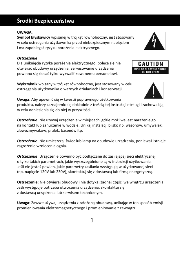 Środki Bezpieczeństwa UWAGA: Symbol błyskawicy wpisanej w trójkąt równoboczny, jest stosowany w celu ostrzegania użytkownika przed niebezpiecznym napięciem i ma zapobiegać ryzyku porażenia elektrycznego. Ostrzeżenie: Dla uniknięcia ryzyka porażenia elektrycznego, poleca się nie otwierać obudowy urządzenia. Serwisowanie urządzenia powinno się zlecać tylko wykwalifikowanemu personelowi. Wykrzyknik wpisany w trójkąt równoboczny, jest stosowany w celu ostrzegania użytkownika o ważnych działaniach i konserwacji. Uwaga: Aby upewnić się w kwestii poprawnego użytkowania produktu, należy zaznajomić się dokładnie z treścią tej instrukcji obsługi i zachować ją w celu odniesienia się do niej w przyszłości. Ostrzeżenie: Nie używaj urządzenia w miejscach, gdzie możliwe jest narażenie go na kontakt lub zanurzenie w wodzie. Unikaj instalacji blisko np. wazonów, umywalek, zlewozmywaków, pralek, basenów itp. Ostrzeżenie: Nie umieszczaj świec lub lamp na obudowie urządzenia, ponieważ istnieje zagrożenie wzniecenia ognia. Ostrzeżenie: Urządzenie powinno być podłączane do zasilającej sieci elektrycznej o tylko takich parametrach, jakie wyszczególnione są w instrukcji użytkowania. Jeśli nie jesteś pewien, jakie parametry zasilania występują w użytkowanej sieci (np. napięcie 120V lub 230V), skontaktuj się z dostawcą lub firmą energetyczną. Ostrzeżenie: Nie otwieraj obudowy i nie dotykaj żadnej części we wnętrzu urządzenia. Jeśli występuje potrzeba otworzenia urządzenia, skontaktuj się z dostawcą urządzenia lub serwisem technicznym. Uwaga: Zawsze używaj urządzenia z założoną obudową, unikając w ten sposób emisji promieniowania elektromagnetycznego i promieniowanie z zewnątrz. 1 Opis produktu Odbiór cyfrowej telewizji naziemnej DVB-T/T2 Obsługa standardów MPEG-2, MPEG-4, MPEG-4 AVC/H.264 Full HD MPEG-2 MP@HL. AVC/H.264, [email protected],MPEG4 A SP Supported Wbudowany adapter sieci bezprzewodowej WiFi Opcje internetowe: YouTube, Dailymotion, Pogoda, Net Photo i inne. Obsługa aplikacji FTP Niski pobór prądu w trybie Stand-by poniżej 1W; PVR, Timer, Time Shift 8 grup ulubionych kanałów i Kontrola Rodzicielska 3-dniowy Przewodnik po Kanałach (EPG) Obsługa telegazety i napisów ekranowych Odtwarzacz plików multimedialnych: muzyki, zdjęć, filmów Wielojęzyczne Menu 6000 programowanych kanałów Obsługa dźwięku Dolby Digital Plus (E-AC3) Wyjście wideo wysok.rozdz. – HDMI Automatyczny Stand-By Szybkie złącze USB 2.0 port 2 Wyposażenie Panel przedni 1 – Dioda zasilania 2 – Dioda wskaźnika sygnału 3 – Wyświetlacz numeryczny 4 – Czujnik pilota IR 3 Panel tylni 1.- Gniazdo antenowe 2.- Gniazdo USB 2.0 3.- Gniazdo HDMI 4.- Gniazdo AV do podłączenia TV i Audio 5.- Gniazdo zasilania 4 Opis pilota POWER - Przełącza pomiędzy trybami pracy i gotowości Mute.- Wyłączenie/włączenie dźwięku ►II – Odtwarzanie/Pauza ■ - Stop - Włączenie nagrywania USB - Wyświetla zawartość dysku USB CZERWONY/AUDIO - Przyciska funkcyjny menu /Zmiana ścieżki audio ZIELONY/TXT - Przyciska funkcyjny menu / Wyświetlanie telegazety ŻÓŁTY/INFO - Przyciska funkcyjny menu /Informacje o programie NIEBIESK/SUBTITLE - Przyciska funkcyjny menu /Wyświetlanie napisów FAV - Wyświetla listę ulubionych kanałów RECAL - Przywołanie poprzedniego kanału/menu - Zmiana kanałów/ruch w menu góra/dół - Regulacja wzmocnienia dźwięku / ruch w menu prawo/lewo OK - Potwierdza wybraną operacje albo wyświetla listę kanałów podczas oglądania programu MENU - Wyświetla menu tunera EXIT – Wyjście z menu/funkcji I◄◄ ►►I - Przesuwanie do przodu/tyłu--◄◄ ►► - Szybkie przewijanie do przodu/tyłu PAGE- PAGE+ - Zmienia program/kanał EPG - (Electronic Program Guide): Wyświetla przewodnik po programach 1,2,3……0 - Numeryczne wybieranie kanałów TV/RADIO - Przełączenie odbioru programów radiowy i telewizyjnych 5 Podłączenie Podłącz dekoder do anteny i telewizora wg schematu Podłączenie Podłączenie sprzętu audio lub telewizora „starego” typu poprzez gniazdo AV za pomocą kabla JACK – 3 x RCA. Podłącz zasilacz dekodera do gniazdka elektrycznego. W telewizorze wybierz odbiór sygnału poprzez gniado HDMI Włącz urządzenie przyciskiem POWER na pilocie zdalnego. 6 Pierwsze uruchomienie Jeżeli podłączenie dekodera do telewizora zostało prawidłowo wykonane to na ekranie telewizora wyświetli się menu startowe z opcją wyboru wersji językowej menu. Przyciskami na pilocie góra/dół należy wybrać odpowiednią wersję językową i wcisnąć przycisk OK. Programowanie kanałów Uwaga: Warunkiem prawidłowego odbioru programów telewizyjny i radiowych jest odpowiednie dobranie anteny do miejsca instalacji oraz jej precyzyjne ustawienie. Źle dobrana antena oraz nieprawidłowa regulacja w sposób istotny wpłynie na pogorszenie odbioru programów. Polecamy skorzystanie z pomocy instalatora w instalacji anteny. Aby wyszukać programy na dekoderze należy wcisnąć na pilocie przycisk MENU . Ne ekranie telewizora wyświetli się menu dekodera. Przyciskiem OK należy wybrać opcję Instalacja. Na ekranie wyświetli się menu wyszukiwania programów 7 Wyszukiwanie ręczne - wyszukiwanie pojedynczych programów/nadawców Wyszukiwanie automatyczne - wyszukiwanie wszystkich nadawanych programów Ustawienie zasilania anteny - włączenie/wyłączenie zasilania 5 V wzmacniacza anteny Ustawienia fabryczne – kod fabryczny 0000 Przywraca ustawienia fabryczne dekodera, usuwanie kanałów. W opcji menu przyciskami góra/dół Wyszukiwanie automatyczne i wcisnąć OK. W opcji Przeszukiwanie sieci przyciskiem prawo/lewo wybrać NIE i wcisnąć OK – nastąpi wyszukiwanie programów. Po zakończeniu programowania aby wyjść z menu należy wcisnąć przycisk EXIT. 8 Podłączenie dekodera do sieci WiFi Dekoder umożliwia korzystanie z opcji internetowych: MENU > Rozszerzenie > WIFI > OK Aby