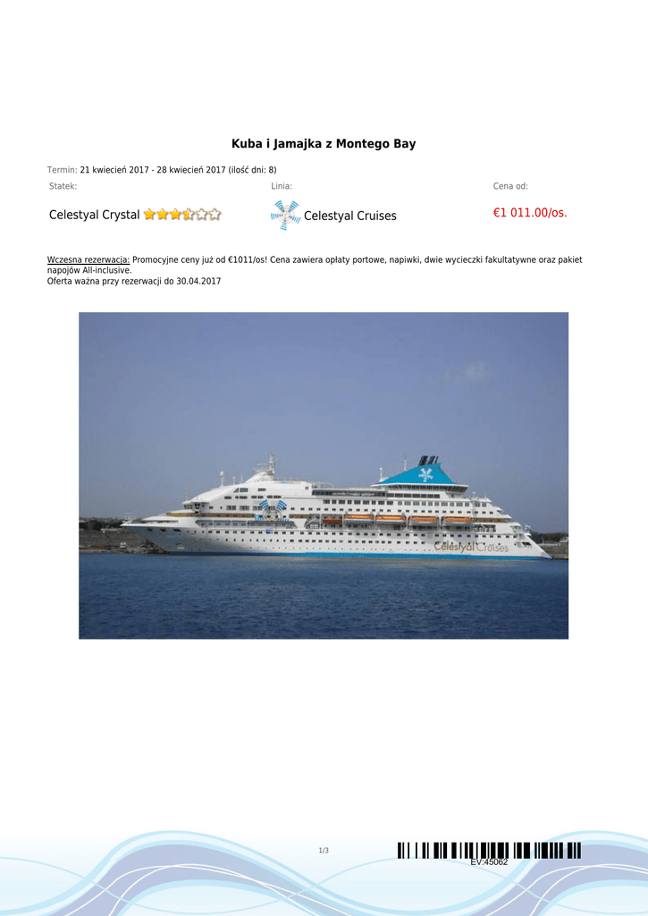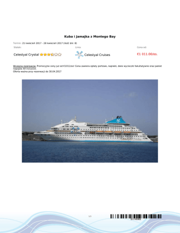 Kuba i Jamajka z Montego Bay Termin: 21 kwiecień 2017 - 28 kwiecień 2017 (ilość dni: 8) Statek: Celestyal Crystal Linia: Cena od: Celestyal Cruises €1 011.00/os. Wczesna rezerwacja: Promocyjne ceny już od €1011/os! Cena zawiera opłaty portowe, napiwki, dwie wycieczki fakultatywne oraz pakiet napojów All-inclusive. Oferta ważna przy rezerwacji do 30.04.2017 1/3 EV:45062 TRASA REJSU Data Port Wpłynięcie Wypłynięcie piątek 21.04.2017 Montego Bay --:-- 20:00 sobota 22.04.2017 Santiago de Cuba 08:00 16:00 dzień 3 niedziela 23.04.2017 Dzień na morzu --:-- --:-- dzień 4 poniedziałek 24.04.2017 Hawana 09:30 --:-- wtorek 25.04.2017 Hawana --:-- 17:00 środa 26.04.2017 Punta Frances, Isla de la Juventud 13:00 18:00 07:00 15:00 08:00 --:-- dzień 1 dzień 2 dzień 5 dzień 6 Legenda Jamajka Kuba Kuba Kuba Kuba dzień 7 dzień 8 czwartek 27.04.2017 Cienfuegos piątek 28.04.2017 Montego Bay Kuba Jamajka CENNIK Cena katalogowa Cena promocyjna Kabina wewnętrzna od €1 153.00 od €1 011.00 Kabina zewnętrzna z oknem od €1 386.00 od €1 209.00 Suite (apartament) od €1 756.00 od €1 523.00 Kabina jednoosobowa na zapytanie 3, 4 i 5 osoba dorosła w kabinie od €941.00 od €830.00 dziecko od 2 do 12 lat jako 3, 4 i 5 osoba w kabinie od €626.00 od €559.00 dziecko od 0 do 2 lat jako 3, 4 i 5 osoba w kabinie €149.00 2/3 EV:45062 Opłaty portowe w cenie Uwaga! Ceny za osobę w kabinie dwuosobowej. Cena zawiera: zakwaterowanie w kabinie wybranej kategorii; wyżywienie - 3 główne posiłki, podwieczorek; pakiet napojów all inclusive Blue (dorośli), White (dzieci); dwie wycieczki Havana City Tour i Panorami Santiago de Cuba; opłaty portowe; napiwki; napoje serwowane do śniadania i w bufetach samoobsługowych; serwis bagażowy podczas wejścia i zejścia ze statku; serwis kabinowy; korzystanie ze wszystkich urządzeń sportowo - rekreacyjnych znajdujących się na pokładzie statku (basen, jacuzzi, sala fitness, itp.); udział we wszystkich imprezach organizowanych na statku (przedstawienia w teatrze, koncerty, programy animacyjne itp.). Cena nie zawiera: kosztów dojazdu do portu; ewentualnych noclegów w hotelu przed/po rejsie i transferów; wycieczek fakultatywnych w trakcie rejsu (poza uwzględnionymi w cenie); korzystania z barów, mini baru w kabinie oraz napojów zamawianych w restauracji*; korzystania z punktów usługowych (fryzjer, pralnia, fotograf, salon piękności i odnowy biologicznej, internet) i wydatków osobistych; ubezpieczenia KL, NNW i bagaż, Karty Turysty (ok. 23EUR/os. - do nabycia w konsulacie kubańskim w Warszawie, opłaty wylotowej z Kuby ok. 25CUC/os. płatnej na miejscu. Uwagi: Przeloty na Kubę i Jamajkę obsługiwane są m. in. przez linie KLM i Air France - koszt przelotu to ok. 3500 - 4500PLN w zależności od terminu. 3/3 EV:45062