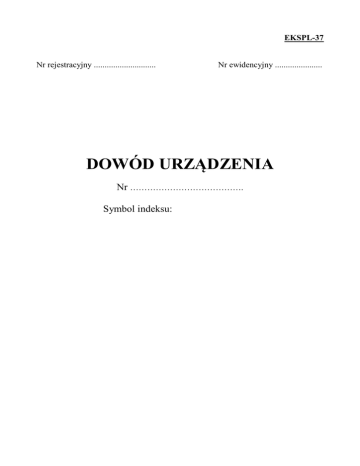 EKSPL-37 Nr rejestracyjny ............................. Nr ewidencyjny ...................... DOWÓD URZĄDZENIA Nr …………………………………. Symbol indeksu: I. Dane ogólne 1. Nazwa sprzętu: 2. Symbol indeksu: 3. Nr fabryczny ............................................................ seria .................................. 4. Data produkcji ..................................................................................................... 5. Zakład produkcyjny: ………………………………………………………… …..……………………………………………………………………………. 6. Urządzenie zamontowano w: 7. Data zamontowania: ……………………………. 8. Dane ewidencyjne pojazdu: ................................................................................. a) marka i typ ....................................................................................................... b) typ nadwozia ................................................................................................... c) nr rejestracyjny ................................................................................................ d) nr podwozia ..................................................................................................... e) nr silnika .......................................................................................................... f) nr przyczepy .................................................................................................... 9. Data rozpoczęcia eksploatacji: ……………………….. 10. Podstawa rozpoczęcia eksploatacji ...................................................................... ............................................................................................................................... ............................................................................................................................... ............................................................................................................................ MON-EKSPL-37 1 II. Karta kontroli technicznej Urządzenie zostało sprawdzone, odpowiada warunkom technicznym nr ................................................................................................................................. a) Przedstawiciel KT ............................................................... stanowisko, imię i nazwisko mp. ............................................................... podpis b) Przedstawiciel wojskowy ............................................................... stanowisko, imię i nazwisko mp. ............................................................... podpis Data ...................................... III. Karta gwarancyjna Zakład produkcyjny (warsztat, jednostka) gwarantuje niezawodną pracę urządzenia, użytkowanego zgodnie z obowiązującymi instrukcjami na okres .................................. lat eksploatacji przy .................................. godz. pracy lub na okres .................................. lat przechowywania począwszy od dnia .................................. ............................................................... stanowisko, imię i nazwisko mp. ............................................................... podpis Data ...................................... 2 IV. Opis kompletu przemysłowego Lp. Wyszczególnienie Symbol indeksu, nr katalogu, rysunku lub normy 3 Ilość wg dokumentacji rzeczywista IV. Opis kompletu przemysłowego Lp. Wyszczególnienie Symbol indeksu, nr katalogu, rysunku lub normy 4 Ilość wg dokumentacji rzeczywista V. Eksploatacja urządzenia Data Nr Odpowiedzialny Nr otrzy- Jednostki za urządzenie (stopień, rozkazu mania Wojskowej nazwisko i imię) dziennego 5 Podpis i pieczęć Podpis przyjmującego V. Eksploatacja urządzenia Data Nr Odpowiedzialny Nr otrzy- Jednostki za urządzenie (stopień, rozkazu mania Wojskowej nazwisko i imię) dziennego 6 Podpis i pieczęć Podpis przyjmującego VI. Dane dotyczące zamontowania lub miejsca pracy urządzenia Data Wyszczególnienie Podstawa, nr pisma lub rozkazu 7 Podpis i pieczęć Uwagi VI. Dane dotyczące zamontowania lub miejsca pracy urządzenia Data Wyszczególnienie Podstawa, nr pisma lub rozkazu 8 Podpis i pieczęć Uwagi VII. Wykaz pracy urządzenia (w godzinach) w ................. roku Dzień I II III IV V Miesiące VI VII VIII 1 2 3 4 5 6 7 8 9 10 11 12 13 14 15 16 17 18 19 20 21 22 23 24 25 26 27 28 29 30 31 Razem w m-cu Razem w roku Razem od początku eksploatacji 9 IX X XI XII VII. Wykaz pracy urządzenia (w godzinach) w ................. roku Dzień I II III IV V Miesiące VI VII VIII 1 2 3 4 5 6 7 8 9 10 11 12 13 14 15 16 17 18 19 20 21 22 23 24 25 26 27 28 29 30 31 Razem w m-cu Razem w roku Razem od początku eksploatacji 10 IX X XI XII VII. Wykaz pracy urządzenia (w godzinach) w ................. roku Dzień I II III IV V Miesiące VI VII VIII 1 2 3 4 5 6 7 8 9 10 11 12 13 14 15 16 17 18 19 20 21 22 23 24 25 26 27 28 29 30 31 Razem w m-cu Razem w roku Razem od początku eksploatacji 11 IX X XI XII VII. Wykaz pracy urządzenia (w godzinach) w ................. roku Dzień I II III IV V Miesiące VI VII VIII 1 2 3 4 5 6 7 8 9 10 11 12 13 14 15 16 17 18 19 20 21 22 23 24 25 26 27 28 29 30 31 Razem w m-cu Razem w roku Razem od początku eksploatacji 12 IX X XI XII VII. Wykaz pracy urządzenia (w godzinach) w ................. roku Dzień I II III IV V Miesiące VI VII VIII 1 2 3 4 5 6 7 8 9 10 11 12 13 14 15 16 17 18 19 20 21 22 23 24 25 26 27 28 29 30 31 Razem w m-cu Razem w roku Razem od początku eksploatacji 13 IX X XI XII VII. Wykaz pracy urządzenia (w godzinach) w ................. roku Dzień I II III IV V Miesiące VI VII VIII 1 2 3 4 5 6 7 8 9 10 11 12 13 14 15 16 17 18 19 20 21 22 23 24 25 26 27 28 29 30 31 Razem w m-cu Razem w roku Razem od początku eksploatacji 14 IX X XI XII VIII. Kategoria urządzenia Podstawa zmiany Data 