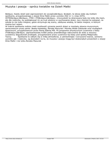 CKZiU Strzelce Opolskie Muzyka i poezja - oprócz kwiatów na Dzień Matki „ Każdy dzień jest zaproszeniem do szczęścia” – te słowa stały się mottem spotkania, przygotowanego z okazji Dnia Matki przez uczniów ZSZ nr 1 z klas IIITH, IIITEK”b”, ITEK i ITG”b”. Uroczystość ta skierowana była nie tylko dla mam, ale dla rodziców, by podziękować im za trud włożony w wychowanie dzieci, lecz również by pokazać, że szkoła to nie tylko miejsce, gdzie otrzymuje się oceny, zdobywa wiedzę, to także miejsce, w którym można być razem. W trakcie spotkania rodzice mieli możliwość ujrzenia swoich dzieci w montażu słowno-muzycznym, opracowanym przez panie: Beatę Kasielską, Renatę Mazurek i Monikę Wilde-Zdobylak oraz występach tanecznych, przygotowanych przez Panią Sabinę Miś. Po programie artystycznym uczennice z klasy ITG”b” zaprezentowały krótki pokaz prawidłowego nakrywania do stołu a wszyscy uczestnicy degustowali przekąski, przygotowane przez uczennice tej klasy pod opieką Małgorzaty Tacicy. Spotkanie to odbyło się w miłej atmosferze, a uśmiechnięte i wzruszone twarze, zarówno uczniów jak i rodziców, są dowodem na to, że muzyka i poezja mogą być doskonałym prezentem z okazji Dnia Matki i nie tylko.Renata Mazurek http://www.ckziu-strzelce.pl Kreator PDF Utworzono 2 March, 2017, 03:24
