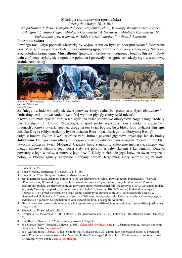 Mitologia skandynawska (germańska) Przemysław Borys, 20.11.2015 Na podstawie J. Rosa „Herojów Północy” uzupełnionych o „Mitologię skandynawską w epoce Wikingów” L. Słupeckiego, „Mitologię Germańską” A. Szrejtera, „Mitologię Germańską” St. Piekarczyka oraz, w końcu, o „Eddę starszą i młodszą” w tłum. J. Lelewela. Powstanie świata Pewnego razu Odyn poprosił wieszczkę by wyjawiła mu co było na początku świata 1. Wieszczka powiedziała, że na początku była pustka Ginnungagap, otoczona z północy krainą mgły Niflheim, a od południa krainą ognia Muspelheim2 (przyszłym królestwem pogromcy bogów, Surtra3). Bryły lodu z północy stykały się z ogniem z południa i parowały, następnie schładzały się i w środkowej krainie padał śnieg4. Ilustracja 1: Ginnungagap otoczona Niflheimem i Muspelheimem. Ilustracja 2: Imir i Audumla Ilustracja 3: Audumla wylizuje Buriego z lodu Ze śniegu i z lodu wyłoniły się dwie pierwsze istoty. Jedną był protoplasta złych olbrzymów 5— Imir, drugą zaś—krowa Audumla,z której wymion płynęły cztery rzeki mleka6. Krowa Audumala żywiła Imira, a ten wydał na świat potomstwo olbrzymów. Noga z nogą zrodziły mu Thrudgelmira (Głośno Ryczącego), a spod pachy wyskoczył syn i córka o nieznanych imionach7. Krowa otwarła również drogę na ten świat bogom, bo z bloku lodu wylizała Buriego, dziadka Odyna (Odyn zrodzony był ze związku Bora—syna Buriego—z olbrzymką Bestlą8). Odyn z braćmi (Wilim i We 9) wkrótce zabił Imira i pokonał gigantów, spychając ich do krainy Jotunheim. Od tego czasu olbrzymi i bogowie stali się odwiecznymi wrogami. Z ciała Imira Odyn utworzył doczesny świat, Midgard. Czaszka Imira stanowi tu sklepienie niebieskie, strzępy jego mózgu stanowią chmury, jego kości stały się górami, a zęby skałami i kamieniami. Drzewa powstały z jego włosów, a morze z jego krwi 10. Kiedy rozlała się jego krew, na świat przyszedł potop, w którym zginęły wszystkie olbrzymy oprócz Bergelmira, który schronił się w statku 1 2 3 4 5 6 7 8 9 10 Słupecki, s. 25. Edda Młodsza, Damesaga 4 (Lelewel, s. 115-116). Słupecki, s. 27 (o olbrzymie Surtrze w Muspelheimie). Jest to narracja Rosa. Zdaniem Szrejtera (s. 51) ze ścieranie się tych sił powstał ocean. Piekarczyk s. 78 cytuje „Przepowiednię Wieszczki”, gdzie w chwili narodzin Imira nie było jeszcze zimnych fal ni morza! Z kolei Wafthrodnir podaje, że pierwszy olbrzym powstał z kropel wzburdzonej fali (Piekarczyk, s. 80)... Woluspa:3 podaje, że „kiedy Ymer żył; ni piasku, ni morza, ani wiatru było” (Lelewel, s. 10). W Młodszej Eddzie (Damesaga 3, Lelewel s. 115), przed stworzeniem nieba i ziemi istniały tylko mroźne olbrzymy (czyli raczej nie ocean). W Damesadze 4 (Lelewel, s. 116) mamy o tym, że z Niflheimu wypływały rzeki, które zamarzały w Ginnungagap, a stykając się z gorącem Muspelheimu, z lodu wytopił się Imir, a następnie Audumla. Giganci charakteryzowali się olbrzymią siła i ograniczonymi możliwościami umysłowymi: personifikacja sił natury. Ross, s. 276. Słupecki, s. 28 (o rzekach mleka). Szrejter, s. 52, Piekarczyk, s. 208, Lelewel, s. 19 (Wafthrudnismal:30-33), Lelewel s. 116 (Młodsza Edda, Damesaga 4). Imię Bestli – Szrejter, s. 52. Wspomina ją również Słupecki. Wg Starszej Eddy (Hawamal, Lelewel, s. 105), Odyn miał również siostrę (?): „Znam tajemnice, których kobietom nie wydam, chyba mej siostrze”. Wg Wafthrudnira (Lelewel, s. 18) i Grimnis mal:40 (Lelewel, s. 27) z potu, lecz pot znaczył często w przenośni krew. Powstanie świata opisuje też w Młodszej Eddzie Damesaga 6 (Lelewel, s. 117), tutaj morze powstaje z krwi. Co więcej, w tym opisie Ziemia jest okrągła. zbudowanym z szuflady na mąkę11. Następnie Odyn wziął z Muspelheimu nieco ognia 12 i utworzył z niego ciała niebieskie, umieszczając Słońce i Księżyc na rydwanach, w których mogą uciekać przed straszliwymi wilkami olbrzymów (Solla i Hati13). Wilki te są potomstwem straszliwego Fenrira, który pożre Odyna na koniec świata14. Na koniec z ciała Imira niczym robaki wyłoniły się Elfy15 i Karły16. Elfy opiekowały się roślinami i mieszkały w Alfheimie (Elfheimie). Karły stały się natomiast strażnikami podziemi i rud, które ziemia skrywała we wnętrzu. Dwa pierwsze z nich nosiły imiona Módsognir i Durin, i stworzyły z ziemi swoich pozostałych współziomków na podobieństwo ludzi 17. Niektóre z karłów stały się przyjazne i pomocne ludziom: te nosiły miano koboldów 18. Inne (Austri, Westri, Nordri, Sudri) zajmowały się dźwiganiem sklepienia niebieskiego19. Jeszcze inne były dobrymi rzemieślnikami20. Ilustracja 4: Pokonany Imir jako materia do stworzenia świata Ilustracja 5: Wilki Solla i Hati ścigają Słońce i Księżyc. Karły nazywano niekiedy Ciemnymi Elfami, jakby na wzór chrześcijańskich aniołów i diabłów21. Ponad ziemią (Midgardem) rozciągało się królestwo bogów, Asgard, do którego dostać się można było poprzez tęczowy most Bifrost, którego strażnikiem był mieszkający w Himminbjorgu 22 Heimdal—światłem odziany23 bóg o złotych zębach, z mieczem Hoffud w dłoni, zrodzony z 9 faldziewic24. W Asgardzie panowały dwie rodziny: Asów (wojowników i władców, do których należał Odyn) oraz kilku Wanów25 (opiekunów sił przyrody, płodności). Gościł tam również jeden z olbrzymów, demon ognia, Loki, syn olbrzyma chaosu Fornjotra i bogini zadrzewionej wyspy Laufei (Naali), 11 12 13 14 15 16 17 18 19 20 21 22 23 24 25 Szrejter, s. 73. Młodsza Edda, Damesaga 6 (Lelewel, s. 117). Lelewel, s. 27 (Grimnis mal:39), s. 119 (Młodsza Edda, Damesaga 10). Szrejter, s. 59. Wg Słupeckiego elfy w wielu przypadkach są utożsamiane w źródłach z Wanami – s. 78, s. 308. Słupecki zwraca uwagę, że tak jak ludzie, karły nie powstały „z niczego” - s. 36. Powstanie karłów z robaków o