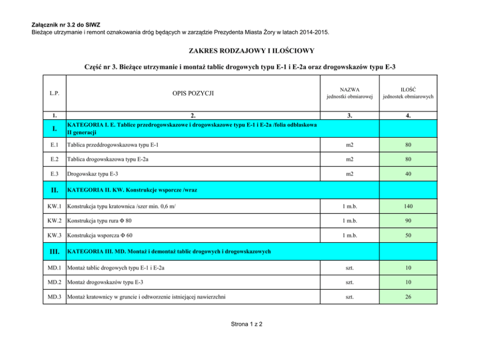 Załącznik nr 3.2 do SIWZ Bieżące utrzymanie i remont oznakowania dróg będących w zarządzie Prezydenta Miasta Żory w latach 2014-2015. ZAKRES RODZAJOWY I ILOŚCIOWY Część nr 3. Bieżące utrzymanie i montaż tablic drogowych typu E-1 i E-2a oraz drogowskazów typu E-3 OPIS POZYCJI NAZWA jednostki obmiarowej ILOŚĆ jednostek obmiarowych 1. 2. 3. 4. I. KATEGORIA I. E. Tablice przedrogowskazowe i drogowskazowe typu E-1 i E-2a /folia odblaskowa II generacji L.P. E.1 Tablica przeddrogowskazowa typu E-1 m2 80 E.2 Tablica drogowskazowa typu E-2a m2 80 E.3 Drogowskaz typu E-3 m2 40 II. KATEGORIA II. KW. Konstrukcje wsporcze /wraz KW.1 Konstrukcja typu kratownica /szer min. 0,6 m/ 1 m.b. 140 KW.2 Konstrukcja typu rura Φ 80 1 m.b. 90 KW.3 Konstrukcja wsporcza Φ 60 1 m.b. 50 MD.1 Montaż tablic drogowych typu E-1 i E-2a szt. 10 MD.2 Montaż drogowskazów typu E-3 szt. 10 MD.3 Montaż kratownicy w gruncie i odtworzenie istniejącej nawierzchni szt. 26 III. KATEGORIA III. MD. Montaż i demontaż tablic drogowych i drogowskazowych Strona 1 z 2 Załącznik nr 3.2 do SIWZ Bieżące utrzymanie i remont oznakowania dróg będących w zarządzie Prezydenta Miasta Żory w latach 2014-2015. MD.4 Montaż słupka w gruncie i odtworzenie istniejącej nawierzchni szt. 22 MD.5 Demontaż tablicy drogowej i odtworzenie istniejącej nawierzchni szt. 20 Strona 2 z 2
