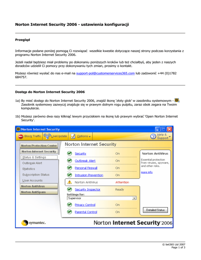 Norton Internet Security 2006 - ustawienia konfiguracji Przegląd Informacje podane poniżej pomogą Ci rozwiązać wszelkie kwestie dotyczące naszej strony podczas korzystania z programu Norton Internet Security 2006. Jeżeli nadal będziesz miał problemy po dokonaniu poniższych kroków lub też chciałbyś, aby jeden z naszych doradców udzielił Ci pomocy przy dokonywaniu tych zmian, prosimy o kontakt. Możesz również wysłać do nas e-mail na [email protected] lub zadzwonić +44 (0)1782 684757. Dostęp do Norton Internet Security 2006 1a) By mieć dostęp do Norton Internet Security 2006, znajdź ikonę ‘złoty glob’ w zasobniku systemowym - ; Zasobnik systemowy zazwyczj znajduje się w prawym dolnym rogu pulpitu, zaraz obok zegara na Twoim komputerze. 1b) Możesz zarówno dwa razy kliknąć lewym przyciskiem na ikonę lub prawym wybrać ‘Open Norton Internet Security’. © bet365 Ltd 2007 Page 1 of 3 2) Kliknij na opcje ‘Personal Firewall’ i następnie wybierz ‘Configure’. © bet365 Ltd 2007 Page 2 of 3 3) W zakładce ‘Firewall’ wybierz ‘ Default Level’ następnie kliknij na ‘OK’ 4) Teraz zamknij wszystkie okna przeglądarki, które są obecnie otwarte, otwórz nowe okno, wpisz adres naszej strony, a następnie zaloguj się do swojego konta. Powinieneś być teraz w stanie przeglądać naszą stronę bez problemów • Jeżeli w dalszym ciągu będziesz miał problemy, proszę skontaktować się z naszym Biurem Obsługi klienta. Informacje kontaktowe znajdziesz na pierwszej stronie tego dokumentu. © bet365 Ltd 2007 Page 3 of 3