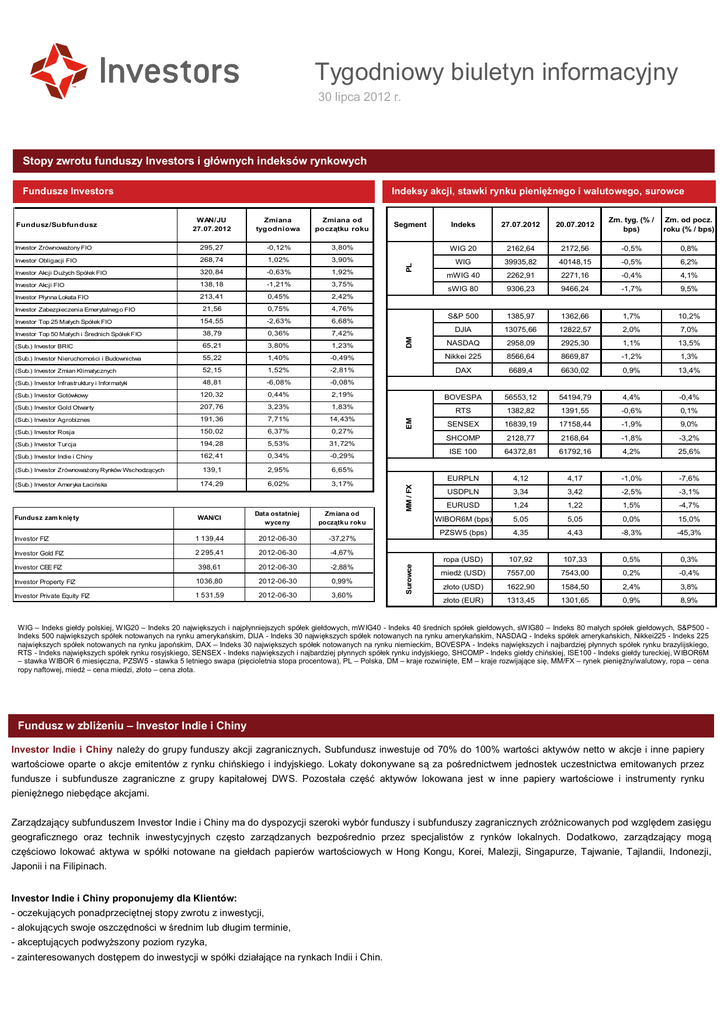 Tygodniowy biuletyn informacyjny 30 lipca 2012 r. Stopy zwrotu funduszy Investors i głównych indeksów rynkowych Fundusze Investors Indeksy akcji, stawki rynku pieniężnego i walutowego, surowce WAN/JU 27.07.2012 Zmiana tyg odniowa Zmiana od po czątku roku Investor Zrównoważony FIO 295,27 -0,12% 3,80% WIG 20 Investor Obligacji FIO 268,74 1,02% 3,90% WIG Investor Akcji Dużych Spółek FIO 320,84 -0,63% 1,92% mWIG 40 Investor Akcji FIO 138,18 -1,21% 3,75% sWIG 80 Investor Płynna Lokata FIO 213,41 0,45% 2,42% 21,56 0,75% 4,76% 154,55 -2,63% 6,68% Investor Zabezpieczenia Emerytalneg o FIO Investor Top 25 Małych Spółek FIO Segment PL Fundusz/Su bfun dusz Indeks 20.07.2012 Zm. tyg. (% / bps) Zm. od pocz. roku (% / bps) 2162,64 2172,56 -0,5% 0,8% 39935,82 40148,15 -0,5% 6,2% 2262,91 2271,16 -0,4% 4,1% 9306,23 9466,24 -1,7% 9,5% 10,2% 27.07.2012 S&P 500 1385,97 1362,66 1,7% DJIA 13075,66 12822,57 2,0% 7,0% NASDAQ 2958,09 2925,30 1,1% 13,5% 38,79 0,36% 7,42% (Sub.) Investor BRIC 65,21 3,80% 1,23% (Sub.) Investor Nieruchomości i Budownictwa 55,22 1,40% -0,49% Nikkei 225 8566,64 8669,87 -1,2% 1,3% (Sub.) Investor Zmian Klimatycznych 52,15 1,52% -2,81% DAX 6689,4 6630,02 0,9% 13,4% BOVESPA 56553,12 54194,79 4,4% -0,4% RTS 1382,82 1391,55 -0,6% 0,1% SENSEX 16839,19 17158,44 -1,9% 9,0% SHCOMP 2128,77 2168,64 -1,8% -3,2% ISE 100 64372,81 61792,16 4,2% 25,6% EURPLN 4,12 4,17 -1,0% -7,6% USDPLN 3,34 3,42 -2,5% -3,1% EURUSD 1,24 1,22 1,5% -4,7% WIBOR6M (bps) 5,05 5,05 0,0% 15,0% PZSW5 (bps) 4,35 4,43 -8,3% -45,3% 2,19% (Sub.) Investor Gold Otwarty 207,76 3,23% 1,83% (Sub.) Investor Agrobiznes 191,36 7,71% 14,43% (Sub.) Investor Rosja 150,02 6,37% 0,27% (Sub.) Investor Turcja 194,28 5,53% 31,72% (Sub.) Investor Indie i Chiny 162,41 0,34% -0,29% 139,1 2,95% 6,65% 174,29 6,02% 3,17% (Sub.) Investor Zrównoważony Rynków Wschodzących (Sub.) Investor Ameryka Łacińska WAN/CI Data ostatniej w yce ny Zm iana od początk u rok u Investor FIZ 1 139,44 2012-06-30 -37,27% Investor Gold FIZ 2 295,41 2012-06-30 -4,67% Investor CEE FIZ 398,61 2012-06-30 -2,88% Investor Property FIZ 1036,80 2012-06-30 0,99% Investor Private Equity FIZ 1 531,59 2012-06-30 3,60% Fundusz zam k nię ty EM -0,08% 0,44% MM / FX -6,08% 120,32 Surowce 48,81 (Sub.) Investor Gotówkowy (Sub.) Investor Infrastruktury i Informatyki DM Investor Top 50 Małych i Średnich Spółek FIO ropa (USD) 107,92 107,33 0,5% 0,3% miedź (USD) 7557,00 7543,00 0,2% -0,4% złoto (USD) 1622,90 1584,50 2,4% 3,8% złoto (EUR) 1313,45 1301,65 0,9% 8,9% WIG – Indeks giełdy polskiej, WIG20 – Indeks 20 największych i najpłynniejszych spółek giełdowych, mWIG40 - Indeks 40 średnich spółek giełdowych, sWIG80 – Indeks 80 małych spółek giełdowych, S&P500 Indeks 500 największych spółek notowanych na rynku amerykańskim, DIJA - Indeks 30 największych spółek notowanych na rynku amerykańskim, NASDAQ - Indeks spółek amerykańskich, Nikkei225 - Indeks 225 największych spółek notowanych na rynku japońskim, DAX – Indeks 30 największych spółek notowanych na rynku niemieckim, BOVESPA - Indeks największych i najbardziej płynnych spółek rynku brazylijskiego, RTS - Indeks największych spółek rynku rosyjskiego, SENSEX - Indeks największych i najbardziej płynnych spółek rynku indyjskiego, SHCOMP - Indeks giełdy chińskiej, ISE100 - Indeks giełdy tureckiej, WIBOR6M – stawka WIBOR 6 miesięczna, PZSW5 - stawka 5 letniego swapa (pięcioletnia stopa procentowa), PL – Polska, DM – kraje rozwinięte, EM – kraje rozwijające się, MM/FX – rynek pieniężny/walutowy, ropa – cena ropy naftowej, miedź – cena miedzi, złoto – cena złota. Fundusz w zbliżeniu – Investor Indie i Chiny Investor Indie i Chiny należy do grupy funduszy akcji zagranicznych. Subfundusz inwestuje od 70% do 100% wartości aktywów netto w akcje i inne papiery wartościowe oparte o akcje emitentów z rynku chińskiego i indyjskiego. Lokaty dokonywane są za pośrednictwem jednostek uczestnictwa emitowanych przez fundusze i subfundusze zagraniczne z grupy kapitałowej DWS. Pozostała część aktywów lokowana jest w inne papiery wartościowe i instrumenty rynku pieniężnego niebędące akcjami. Zarządzający subfunduszem Investor Indie i Chiny ma do dyspozycji szeroki wybór funduszy i subfunduszy zagranicznych zróżnicowanych pod względem zasięgu geograficznego oraz technik inwestycyjnych często zarządzanych bezpośrednio przez specjalistów z rynków lokalnych. Dodatkowo, zarządzający mogą częściowo lokować aktywa w spółki notowane na giełdach papierów wartościowych w Hong Kongu, Korei, Malezji, Singapurze, Tajwanie, Tajlandii, Indonezji, Japonii i na Filipinach. Investor Indie i Chiny proponujemy dla Klientów: - oczekujących ponadprzeciętnej stopy zwrotu z inwestycji, - alokujących swoje oszczędności w średnim lub długim terminie, - akceptujących podwyższony poziom ryzyka, - zainteresowanych dostępem do inwestycji w spółki działające na rynkach Indii i Chin. Komentarz rynkowy Amerykańscy inwestorzy mają za sobą całkiem udany tydzień, wszystkie główne indeksy zakończyły notowania powyżej poziomów sprzed tygodnia. Najwięcej zyskał DJIA, który zwiększył wartość o 1.97%, ale dobre nastroje mają też posiadacze spółek z S&P500 (+1.71% w ciągu tygodnia) i Nasdaq (+1.12%). Skupiający mniejsze spółki indeks Russell2000 zyskał w ciągu tygodnia 0.56%. Indeksy zyskiwały na wartości głównie w czwartek i piątek w reakcji na wypowiedzi Mario Draghiego dotyczące planów ratowania strefy euro z użyciem wszystkich możliwych narzędzi będących w posiadaniu EBC. Deklaracja szefa EBC wywołała euforię na giełdach europejskich i przełożyła się na wzrosty w USA. Deklaracje Draghiego były o tyle ważne, że od początku tygodnia rynek spekulował, że MFW zrezygnuje z dalszego finansowania Grecji, co z kolei może doprowadzić do ogłoszenia bankructwa kraju już we wrześniu. Wróciły