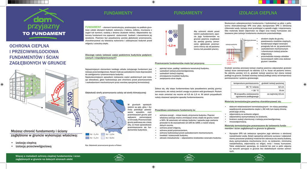 Fundament – element konstrukcyjny, przekazujący na podłoże grun- OCHRONA CIEPLNA i przeciwwilgociowa FUNDAMENTÓW I ŚCIAN ZAGŁĘBIONYCH W GRUNCIE IZOLACJA CIEPLNA FUNDAMENTY FUNDAMENTY towe całość obciążeń budowli, wykonany z betonu, żelbetu, murowany z cegieł lub kamieni, rzadziej z drewna (budowle lekkie). Odpowiednio wykonany fundament ma zapewnić stateczność budowli i równomierne jej osiadanie. Powinien być posadowiony poniżej głębokości przemarzania, charakteryzować się łatwością wykonania i zabezpieczać budynek przed wilgocią i ucieczką ciepła. Aby ochronić obiekt przed takimi uszkodzeniami, oparcie jego fundamentów na gruncie powinno znajdować się poniżej granicy zamarzania (głębokość przemarzania mierzy się od poziomu terenu lub posadzki piwnic). Skutecznym zabezpieczeniem fundamentu i hydroizolacji są płyty z polistyrenu ekstrudowanego XPS oraz płyty styropianowe EPS o obniżonej chłonności wody. Izolacja musi przebiegać w sposób ciągły i nieprzerwany. Oba materiały dzięki odporności na wilgoć oraz kwasy humusowe zastosowane jako izolacja fundamentu skutecznie przeciwdziałają: izolacja pionowa izolacja pozioma • Dlaczego należy izolować części podziemne budynków podpiwniczonych i niepodpiwniczonych? • do gruntu ucieka 3-15 % ciepła Przemarzanie fundamentów może być przyczyną: Najważniejszym elementem każdego układu izolującego fundament jest izolacja przeciwwilgociowa. Nawet małe jej uszkodzenie może doprowadzić do zawilgocenia i przemarznięcia budynku. Najskuteczniejszym sposobem izolowania części podziemnych jest izolacja obwodowa, gdzie hydroizolacja jest chroniona przed przemarzaniem i uszkodzeniami mechanicznymi przez warstwę specjalnej termoizolacji. Głębokość strefy przemarzania zależy od strefy klimatycznej: • • • • • • • • pęknięć ścian, podłóg i osłabienia konstrukcji budynku, uszkodzeń izolacji przeciwwilgociowej, uszkodzeń izolacji cieplnej, zmniejszenia trwałości budynku, zwiększenia strat ciepła. stratom ciepła do gruntu, powstawaniu mostków cieplnych, kondensacji wilgoci wewnątrz przegrody lub na jej powierzchni, uszkodzeniom mechanicznym i chemicznym izolacji przeciwwilgociowej, przeciwdziała rozwoju układów korzeniowych roślin oraz atakowi gryzoni i owadów. Grubość warstwy pionowej izolacji cieplnej powinna odpowiadać grubości izolacji ścian zewnętrznych na odcinku 1,5 m, licząc od poziomu terenu. Na odcinku poniżej 1,5 m, grubość izolacji powinna być równa izolacji podłogi na gruncie. Grubość warstwy izolacji podłogi zależy od temperatury pomieszczenia i systemu grzewczego: Zaleca się, aby stopa fundamentowa była posadowiona poniżej granicy zamarzania, ale należy zwrócić uwagę na poziom wód gruntowych. Poziom ten może zmieniać się rocznie od 0,5 do 1,5 m. W takich przypadkach należy stosować specjalne sposoby fundamentowania. temperatura pomieszczenia grubość izolacji poziomej 16 °C i więcej 12 cm < 16 °C 8 cm W przypadku zastosowania ogrzewania podłogowego co najmniej 15 cm Materiały termoizolacyjne powinny charakteryzować się: W gruntach spoistych (jakimi są pyły, gliny i iły) mróz powoduje powstawanie wysadzin, czyli przemieszczeń gruntu pod wpływem zamarzającej w nim wody. Przemarznięte grunty podnoszą się z dużą siłą, co może spowodować przemieszczanie się fundamentów budynków. Możesz chronić fundamenty i ściany zagłębione w gruncie wykonując właściwą: • izolację cieplną • izolację przeciwwilgociową Więcej o metodach ochrony cieplnej fundamentów i ścian zagłębionych w gruncie na dalszych stronach ulotki Rys. Głębokość przemarzania gruntu w Polsce • Prawidłowo zaizolowane fundamenty to: • • • • • • ochrona energii – niższe koszty utrzymania budynku. Poprzez właściwą izolację można zmniejszyć straty ciepła do gruntu nawet o 50%. W zależności od rodzaju budynku i sposobu jego zasilania prowadzi to do oszczędności od 100 do 1000, a nawet więcej złotych rocznie, ochrona przed wilgocią, ochrona przed przemarzaniem, ochrona hydroizolacji przed uszkodzeniami mechanicznymi, trwałość i stateczność budynku, zdrowie mieszkańców – odpowiednie środowisko wewnątrz budynku. • • • • dobrymi właściwościami termoizolacyjnymi - im niższy posiadają współczynnik przewodzenia ciepła λ, (W/mK) tym lepiej chronią przed jego utratą, odpornością na wnikanie wilgoci, odpowiednią wytrzymałością na ściskanie, brakiem reakcji chemicznej z izolacją przeciwwilgociową, mrozoodpornością. Materiały termoizolacyjne przeznaczone do izolowania fundamentów i ścian zagłębionych w gruncie to głównie: • Styropian EPS lub zwłaszcza specjalna jego odmiana o obniżonej nasiąkliwości wodą. Dzięki specjalnej odmianie surowca i odpowiedniemu procesowi produkcji materiał ten odznacza się zwartą budową, dużą wytrzymałością mechaniczną (m.in. na ściskanie), minimalną nasiąkliwością, odpornością na wilgoć, mróz i kwasy humusowe. Takie właściwości sprawiają, że materiał ten jest w pełni odporny na warunki panujące w gruncie bez dodatkowych warstw ochronnych, IZOLACJA CIEPLNA I PRZECIWWILGOCIOWA • Polistyren ekstrudowany XPS, który jest wytwarzany technologią ekstruzji (inaczej wyciskania). XPS oprócz właściwości termoizolacyjnych, jest odporny na działanie wilgoci, mrozu, kwasów humusowych oraz ma bardzo wysoką wytrzymałość mechaniczną. Dzięki tym właściwościom jest jednym z nielicznych materiałów termoizolacyjnych, który może być stosowany jako termoizolacja w miejscach narażonych na kontakt z mrozem, wodą, kwasami humusowymi i uszkodzeniami mechanicznymi, bez jakichkolwiek dodatkowych warstw ochronnych Właściwie wykonana izolacja przeciwwilgociowa ochraniająca budynek przed wodą gruntową i wilgocią, zapewnia bezpieczeństwo i komfort użytkowania domu. Wilgo