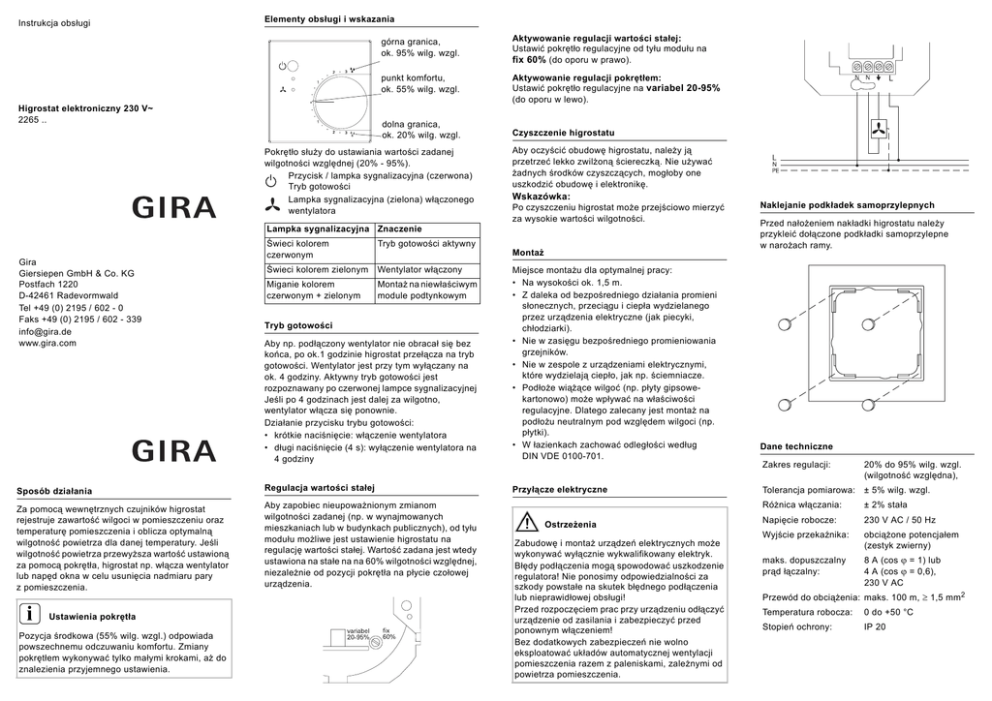 Instrukcja obsługi Elementy obsługi i wskazania Higrostat elektroniczny 230 V~ 2265 .. górna granica, ok. 95% wilg. wzgl. Aktywowanie regulacji wartości stałej: Ustawić pokrętło regulacyjne od tyłu modułu na fix 60% (do oporu w prawo). punkt komfortu, ok. 55% wilg. wzgl. Aktywowanie regulacji pokrętłem: Ustawić pokrętło regulacyjne na variabel 20-95% (do oporu w lewo). dolna granica, ok. 20% wilg. wzgl. Pokrętło służy do ustawiania wartości zadanej wilgotności względnej (20% - 95%). Przycisk / lampka sygnalizacyjna (czerwona) Tryb gotowości Lampka sygnalizacyjna (zielona) włączonego wentylatora Czyszczenie higrostatu Aby oczyścić obudowę higrostatu, należy ją przetrzeć lekko zwilżoną ściereczką. Nie używać żadnych środków czyszczących, mogłoby one uszkodzić obudowę i elektronikę. Wskazówka: Po czyszczeniu higrostat może przejściowo mierzyć za wysokie wartości wilgotności. Lampka sygnalizacyjna Znaczenie Gira Giersiepen GmbH & Co. KG Postfach 1220 D-42461 Radevormwald Tel +49 (0) 2195 / 602 - 0 Faks +49 (0) 2195 / 602 - 339 [email protected] www.gira.com Świeci kolorem czerwonym Tryb gotowości aktywny Świeci kolorem zielonym Wentylator włączony Miganie kolorem czerwonym + zielonym Montaż na niewłaściwym module podtynkowym Montaż Aby np. podłączony wentylator nie obracał się bez końca, po ok.1 godzinie higrostat przełącza na tryb gotowości. Wentylator jest przy tym wyłączany na ok. 4 godziny. Aktywny tryb gotowości jest rozpoznawany po czerwonej lampce sygnalizacyjnej Jeśli po 4 godzinach jest dalej za wilgotno, wentylator włącza się ponownie. Działanie przycisku trybu gotowości: • krótkie naciśnięcie: włączenie wentylatora • długi naciśnięcie (4 s): wyłączenie wentylatora na 4 godziny Miejsce montażu dla optymalnej pracy: • Na wysokości ok. 1,5 m. • Z daleka od bezpośredniego działania promieni słonecznych, przeciągu i ciepła wydzielanego przez urządzenia elektryczne (jak piecyki, chłodziarki). • Nie w zasięgu bezpośredniego promieniowania grzejników. • Nie w zespole z urządzeniami elektrycznymi, które wydzielają ciepło, jak np. ściemniacze. • Podłoże wiążące wilgoć (np. płyty gipsowekartonowo) może wpływać na właściwości regulacyjne. Dlatego zalecany jest montaż na podłożu neutralnym pod względem wilgoci (np. płytki). • W łazienkach zachować odległości według DIN VDE 0100-701. Sposób działania Regulacja wartości stałej Przyłącze elektryczne Za pomocą wewnętrznych czujników higrostat rejestruje zawartość wilgoci w pomieszczeniu oraz temperaturę pomieszczenia i oblicza optymalną wilgotność powietrza dla danej temperatury. Jeśli wilgotność powietrza przewyższa wartość ustawioną za pomocą pokrętła, higrostat np. włącza wentylator lub napęd okna w celu usunięcia nadmiaru pary z pomieszczenia. Aby zapobiec nieupoważnionym zmianom wilgotności zadanej (np. w wynajmowanych mieszkaniach lub w budynkach publicznych), od tyłu modułu możliwe jest ustawienie higrostatu na regulację wartości stałej. Wartość zadana jest wtedy ustawiona na stałe na na 60% wilgotności względnej, niezależnie od pozycji pokrętła na płycie czołowej urządzenia. i Ustawienia pokrętła Pozycja środkowa (55% wilg. wzgl.) odpowiada powszechnemu odczuwaniu komfortu. Zmiany pokrętłem wykonywać tylko małymi krokami, aż do znalezienia przyjemnego ustawienia. Tryb gotowości Ostrzeżenia Zabudowę i montaż urządzeń elektrycznych może wykonywać wyłącznie wykwalifikowany elektryk. Błędy podłączenia mogą spowodować uszkodzenie regulatora! Nie ponosimy odpowiedzialności za szkody powstałe na skutek błędnego podłączenia lub nieprawidłowej obsługi! Przed rozpoczęciem prac przy urządzeniu odłączyć urządzenie od zasilania i zabezpieczyć przed ponownym włączeniem! Bez dodatkowych zabezpieczeń nie wolno eksploatować układów automatycznej wentylacji pomieszczenia razem z paleniskami, zależnymi od powietrza pomieszczenia. Naklejanie podkładek samoprzylepnych Przed nałożeniem nakładki higrostatu należy przykleić dołączone podkładki samoprzylepne w narożach ramy. Dane techniczne Zakres regulacji: 20% do 95% wilg. wzgl. (wilgotność względna), Tolerancja pomiarowa: ± 5% wilg. wzgl. Różnica włączania: ± 2% stała Napięcie robocze: 230 V AC / 50 Hz Wyjście przekaźnika: obciążone potencjałem (zestyk zwierny) maks. dopuszczalny prąd łączalny: 8 A (cos ϕ = 1) lub 4 A (cos ϕ = 0,6), 230 V AC Przewód do obciążenia: maks. 100 m, ≥ 1,5 mm 2 Temperatura robocza: 0 do +50 °C Stopień ochrony: IP 20