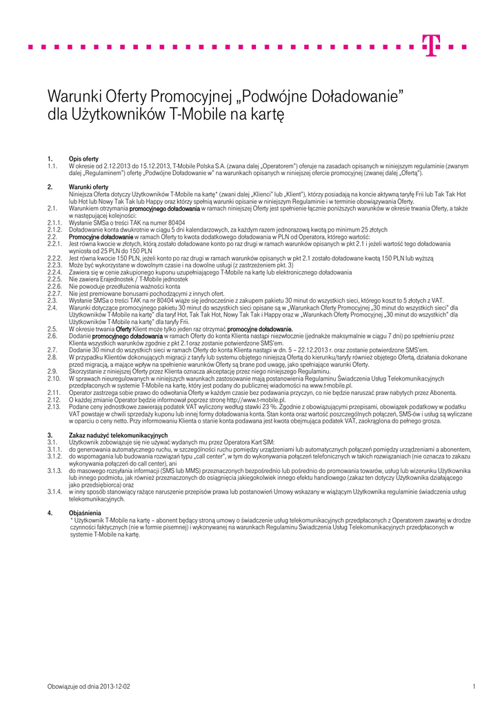 Warunki Oferty Promocyjnej „Podwójne Doładowanie” dla Użytkowników T-Mobile na kartę 1. 1.1. Opis oferty W okresie od 2.12.2013 do 15.12.2013, T-Mobile Polska S.A. (zwana dalej „Operatorem”) oferuje na zasadach opisanych w niniejszym regulaminie (zwanym dalej „Regulaminem”) ofertę „Podwójne Doładowanie w” na warunkach opisanych w niniejszej ofercie promocyjnej (zwanej dalej „Ofertą”). 2. Warunki oferty Niniejsza Oferta dotyczy Użytkowników T-Mobile na kartę* (zwani dalej „Klienci” lub „Klient”), którzy posiadają na koncie aktywną taryfę Frii lub Tak Tak Hot lub Hot lub Nowy Tak Tak lub Happy oraz którzy spełnią warunki opisanie w niniejszym Regulaminie i w terminie obowiązywania Oferty. Warunkiem otrzymania promocyjnego doładowania w ramach niniejszej Oferty jest spełnienie łącznie poniższych warunków w okresie trwania Oferty, a także w następującej kolejności: Wysłanie SMSa o treści TAK na numer 80404 Doładowanie konta dwukrotnie w ciągu 5 dni kalendarzowych, za każdym razem jednorazową kwotą po minimum 25 złotych Promocyjne doładowanie w ramach Oferty to kwota dodatkowego doładowania w PLN od Operatora, którego wartość: Jest równa kwocie w złotych, którą zostało doładowane konto po raz drugi w ramach warunków opisanych w pkt 2.1 i jeżeli wartość tego doładowania wyniosła od 25 PLN do 150 PLN Jest równa kwocie 150 PLN, jeżeli konto po raz drugi w ramach warunków opisanych w pkt 2.1 zostało doładowane kwotą 150 PLN lub wyższą Może być wykorzystane w dowolnym czasie i na dowolne usługi (z zastrzeżeniem pkt. 3) Zawiera się w cenie zakupionego kuponu uzupełniającego T-Mobile na kartę lub elektronicznego doładowania Nie zawiera Erajednostek / T-Mobile jednostek Nie powoduje przedłużenia ważności konta Nie jest premiowane bonusami pochodzącymi z innych ofert. Wysłanie SMSa o treści TAK na nr 80404 wiąże się jednocześnie z zakupem pakietu 30 minut do wszystkich sieci, którego koszt to 5 złotych z VAT. Warunki dotyczące promocyjnego pakietu 30 minut do wszystkich sieci opisane są w „Warunkach Oferty Promocyjnej „30 minut do wszystkich sieci” dla Użytkowników T-Mobile na kartę” dla taryf Hot, Tak Tak Hot, Nowy Tak Tak i Happy oraz w „Warunkach Oferty Promocyjnej „30 minut do wszystkich” dla Użytkowników T-Mobile na kartę” dla taryfy Frii. W okresie trwania Oferty Klient może tylko jeden raz otrzymać promocyjne doładowanie. Dodanie promocyjnego doładowania w ramach Oferty do konta Klienta nastąpi niezwłocznie (jednakże maksymalnie w ciągu 7 dni) po spełnieniu przez Klienta wszystkich warunków zgodnie z pkt 2.1oraz zostanie potwierdzone SMS’em. Dodanie 30 minut do wszystkich sieci w ramach Oferty do konta Klienta nastąpi w dn. 5 – 22.12.2013 r. oraz zostanie potwierdzone SMS’em. W przypadku Klientów dokonujących migracji z taryfy lub systemu objętego niniejszą Ofertą do kierunku/taryfy również objętego Ofertą, działania dokonane przed migracją, a mające wpływ na spełnienie warunków Oferty są brane pod uwagę, jako spełniające warunki Oferty. Skorzystanie z niniejszej Oferty przez Klienta oznacza akceptację przez niego niniejszego Regulaminu. W sprawach nieuregulowanych w niniejszych warunkach zastosowanie mają postanowienia Regulaminu Świadczenia Usług Telekomunikacyjnych przedpłaconych w systemie T-Mobile na kartę, który jest podany do publicznej wiadomości na www.t-mobile.pl. Operator zastrzega sobie prawo do odwołania Oferty w każdym czasie bez podawania przyczyn, co nie będzie naruszać praw nabytych przez Abonenta. O każdej zmianie Operator będzie informował poprzez stronę http://www.t-mobile.pl. Podane ceny jednostkowe zawierają podatek VAT wyliczony według stawki 23 %. Zgodnie z obowiązującymi przepisami, obowiązek podatkowy w podatku VAT powstaje w chwili sprzedaży kuponu lub innej formy doładowania konta. Stan konta oraz wartość poszczególnych połączeń, SMS-ów i usług są wyliczane w oparciu o ceny netto. Przy informowaniu Klienta o stanie konta podawana jest kwota obejmująca podatek VAT, zaokrąglona do pełnego grosza. 2.1. 2.1.1. 2.1.2. 2.2. 2.2.1. 2.2.2. 2.2.3. 2.2.4. 2.2.5. 2.2.6. 2.2.7. 2.3. 2.4. 2.5. 2.6. 2.7. 2.8. 2.9. 2.10. 2.11. 2.12. 2.13. 3. 3.1. 3.1.1. 3.1.2. Zakaz nadużyć telekomunikacyjnych Użytkownik zobowiązuje się nie używać wydanych mu przez Operatora Kart SIM: do generowania automatycznego ruchu, w szczególności ruchu pomiędzy urządzeniami lub automatycznych połączeń pomiędzy urządzeniami a abonentem, do wspomagania lub budowania rozwiązań typu „call center”, w tym do wykonywania połączeń telefonicznych w takich rozwiązaniach (nie oznacza to zakazu wykonywania połączeń do call center), ani 3.1.3. do masowego rozsyłania informacji (SMS lub MMS) przeznaczonych bezpośrednio lub pośrednio do promowania towarów, usług lub wizerunku Użytkownika lub innego podmiotu, jak również przeznaczonych do osiągnięcia jakiegokolwiek innego efektu handlowego (zakaz ten dotyczy Użytkownika działającego jako przedsiębiorca) oraz 3.1.4. w inny sposób stanowiący rażące naruszenie przepisów prawa lub postanowień Umowy wskazany w wiążącym Użytkownika regulaminie świadczenia usług telekomunikacyjnych. 4. Objaśnienia * Użytkownik T-Mobile na kartę – abonent będący stroną umowy o świadczenie usług telekomunikacyjnych przedpłaconych z Operatorem zawartej w drodze czynności faktycznych (nie w formie pisemnej) i wykonywanej na warunkach Regulaminu Świadczenia Usług Telekomunikacyjnych przedpłaconych w systemie T-Mobile na kartę. Obowiązuje od dnia 2013-12-02 1