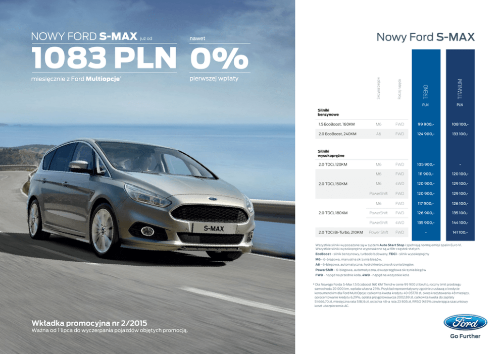 NOWY FORD S-MAX już od TREND TITANIUM Skrzynia biegów 1083 PLN Rodzaj napędu Nowy Ford S-MAX PLN PLN Silniki benzynowe 1.5 EcoBoost, 160KM M6 FWD 99 900,- 108 100,- 2.0 EcoBoost, 240KM A6 FWD 124 900,- 133 100,- M6 FWD 105 900,- - M6 FWD 111 900,- 120 100,- M6 4WD 120 900,- 129 100,- PowerShift FWD 120 900,- 129 100,- M6 FWD 117 900,- 126 100,- PowerShift FWD 126 900,- 135 100,- PowerShift 4WD 135 900,- 144 100,- Power Shift FWD - 141 100,- Silniki wysokoprężne 2.0 TDCi, 120KM 2.0 TDCi, 150KM 2.0 TDCi, 180KM 2.0 TDCi Bi-Turbo, 210KM Wszystkie silniki wyposażone są w system Auto Start Stop i spełniają normę emisji spalin Euro VI. Wszystkie silniki wysokoprężne wyposażone są w filtr cząstek stałych. EcoBoost - silnik benzynowy, turbodoładowany, TDCi - silnik wysokoprężny M6 - 6-biegowa, manualna skrzynia biegów, A6 - 6-biegowa, automatyczna, hydrokinetyczna skrzynia biegów, PowerShift - 6-biegowa, automatyczna, dwusprzęgłowa skrzynia biegów FWD - napęd na przednie koła, 4WD - napęd na wszystkie koła * Dla Nowego Forda S-Max 1.5 Ecoboost 160 KM Trend w cenie 99 900 zł brutto, roczny limit przebiegu samochodu 20 000 km, wpłata własna 25%. Przykład reprezentatywny zgodnie z ustawą o kredycie konsumenckim dla Ford MultiOpcje: całkowita kwota kredytu 40 057,70 zł, okres kredytowania 48 miesięcy, oprocentowanie kredytu 6,29%, opłata przygotowawcza 2002,89 zł, całkowita kwota do zapłaty 51 666,70 zł, miesięczna rata 518,16 zł, ostatnia 48-a rata 23 805 zł, RRSO 9,85% zawierająca szacunkowy koszt ubezpieczenia AC. Wkładka promocyjna nr 2/2015 Ważna od 1 lipca do wyczerpania pojazdów objętych promocją. Nowy Ford S-MAX Wyposażenie standardowe bez kompromisów. S-MAX Trend Nadwozie •17” stalowe obręcze kół z kołpakami •Wyłącznik przedniej poduszki powietrznej •Reflektory halogenowe projekcyjne z funkcją •Przednie fotele w stylu sportowym •Regulacja położenia fotela kierowcy i pasażera o wzorze 7-ramiennym opóźnionego wyłączania •Przednie światła przeciwmgielne •Światła do jazdy dziennej •Tylne światła w technologii LED •Górna, przednia krata wlotu powietrza z chromowanym obramowaniem •Elektrycznie sterowane i podgrzewane lusterka boczne z obudowami lakierowanymi w kolorze nadwozia i zintegrowanymi kierunkowskazami •Centralny zamek z pilotem •Układ ułatwiający ruszanie na wzniesieniach (HSA) •Elektryczny hamulec postojowy Wnętrze •Klimatyzacja dwustrefowa z automatyczną regulacją temperatury (DEATC) •Radioodtwarzacz CD/MP3 zawiera: kolorowy wyświetlacz 4,2”, 8 głośników, zdalne sterowanie na kierownicy (ICFAK) Poduszki powietrzne czołowe i boczne dla kierowcy i pasażera z przodu • •Boczne kurtyny powietrzne chroniące osoby w 1. i 2. rzędzie siedzeń •Poduszka kolanowa kierowcy pasażera w czterech kierunkach •Regulacja podparcia odcinka lędźwiowego fotela kierowcy i pasażera •Schowki pod fotelem kierowcy i pasażera z przodu •Konsola centralna z podłokietnikiem, schowkiem i uchwytem na kubki •Kierownica i gałka dzwigni zmiany biegów wykończone skórą •Przycisk rozrusznika Ford Power •Manetki na kierownicy do zmiany biegów (dostępne tylko ze skrzynią automatyczną) •Elektrycznie sterowane szyby przednich i tylnych drzwi, z czujnikiem przeszkody i funkcją całkowitego otwierania i zamykania •Konsola sufitowa ze schowkiem na okulary i lusterkiem do obserwowania dzieci •Nakładki na progi przednich drzwi •Dywaniki welurowe z przodu •Lampki do czytania w 2. rzędzie foteli •Ford MyKey® •Roleta zasłaniająca przestrzeń bagażową S-MAX Titanium Dodatkowe elementy zewnętrzne w porównaniu do wersji Trend •17” obręcze kół ze stopów lekkich, wzór 10-ramienny (D2YDN) •Światła do jazdy dziennej LED •Przednia szyba podgrzewana (Quickclear) i podgrzewane dysze spryskiwaczy •Reflektory automatyczne z systemem automatycznego sterowania światłami drogowymi i funkcją zapobiegającą oślepianiu (Glare-Free Auto High Beam) •Wycieraczki przedniej szyby sterowane automatycznie, z czujnikiem deszczu • Dolna przednia krata wlotu powietrza z chromowanym obramowaniem •Obramowanie szyb bocznych w kolorze chromu Dodatkowe elementy wyposażenia wnętrza w porównaniu do wersji Trend •Radioodtwarzacz CD/MP3 z Ford Sync i AppLink zawiera: kolorowy wyświetlacz 4.2”, zestaw głośnomówiący z Bluetooth® i rozbudowaną funkcją sterowania głosem (bez języka polskiego) oraz funkcją wzywania pomocy, 8 głośników, zdalne sterowanie na kierownicy, gniazda: AUX-IN i USB/iPod® (ICFAP) Lane Keeping Alert zawiera: Lane Keeping Aid, Driver Alert, Glare-Free Auto High Beam Kolorowy wyświetlacz wielofunkcyjny 10,1” na tablicy zegarów • • •Tempomat z Traffic Sign Recognition i Intelligent Speed Limiter •Oświetlenie wnętrza diodami LED •Przednie fotele podgrzewane, z regulacją temperatury •Welurowe dywaniki podłogowe w 1. i 2. rzędzie foteli