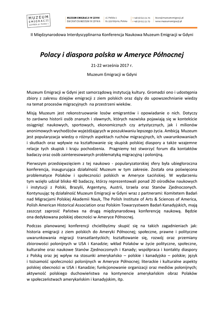 II Międzynarodowa Interdyscyplinarna Konferencja Naukowa Muzeum Emigracji w Gdyni Polacy i diaspora polska w Ameryce Północnej 21-22 września 2017 r. Muzeum Emigracji w Gdyni Muzeum Emigracji w Gdyni jest samorządową instytucją kultury. Gromadzi ono i udostępnia zbiory z zakresu dziejów emigracji z ziem polskich oraz dąży do upowszechnianie wiedzy na temat procesów migracyjnych na przestrzeni wieków. Misją Muzeum jest rekonstruowanie losów emigrantów i opowiadanie o nich. Dotyczy to zarówno historii osób znanych i sławnych, których nazwiska pojawiają się w kontekście osiągnięć naukowych, sportowych, ekonomicznych czy artystycznych, jak i milionów anonimowych wychodźców wyjeżdżających w poszukiwaniu lepszego życia. Ambicją Muzeum jest popularyzacja wiedzy o różnych aspektach ruchów migracyjnych, ich uwarunkowaniach i skutkach oraz wpływie na kształtowanie się skupisk polskiej diaspory a także wzajemne relacje tych skupisk i kraju pochodzenia. Pragniemy też stworzyć forum dla kontaktów badaczy oraz osób zainteresowanych problematyką migracyjną i polonijną. Pierwszym przedsięwzięciem z tej naukowo - popularyzatorskiej sfery była ubiegłoroczna konferencja, inaugurująca działalność Muzeum w tym zakresie. Została ona poświęcona problematyce Polaków i społeczności polskich w Ameryce Łacińskiej. W wydarzeniu tym wzięło udział blisko 40 badaczy, którzy reprezentowali ponad 20 ośrodków naukowych i instytucji z Polski, Brazylii, Argentyny, Austrii, Izraela oraz Stanów Zjednoczonych. Kontynuując tę działalność Muzeum Emigracji w Gdyni wraz z partnerami: Komitetem Badań nad Migracjami Polskiej Akademii Nauk, The Polish Institute of Arts & Sciences of America, Polish American Historical Association oraz Polskim Towarzystwem Badań Kanadyjskich, mają zaszczyt zaprosić Państwa na drugą międzynarodową konferencję naukową. Będzie ona dedykowana polskiej obecności w Ameryce Północnej. Podczas planowanej konferencji chcielibyśmy skupić się na takich zagadnieniach jak: historia emigracji z ziem polskich do Ameryki Północnej; społeczne, prawne i polityczne uwarunkowania migracji transatlantyckich; kształtowanie się, rozwój oraz przemiany zbiorowości polonijnych w USA i Kanadzie; wkład Polaków w życie polityczne, społeczne, kulturalne oraz naukowe Stanów Zjednoczonych i Kanady; współpraca i kontakty diaspory z Polską oraz jej wpływ na stosunki amerykańsko – polskie i kanadyjsko – polskie; język i tożsamość społeczności polonijnych w Ameryce Północnej; literackie i kulturalne aspekty polskiej obecności w USA i Kanadzie; funkcjonowanie organizacji oraz mediów polonijnych; aktywność polskiego duchowieństwa na kontynencie amerykańskim obraz Polaków w społeczeństwach amerykańskim i kanadyjskim, itp. Powyższa lista jest tylko propozycją zagadnień, które mogą być prezentowane w ramach konferencji. Konferencja będzie miała charakter interdyscyplinarny i dlatego do udziału w niej zapraszamy zajmujących się Polakami i społecznościami polonijnymi w Ameryce Północnej specjalistów reprezentujących różne dyscypliny naukowe, w tym historyków, amerykanistów, kanadystów, politologów, socjologów, kulturoznawców, literaturoznawców, antropologów kulturowych, filologów itp. Mamy nadzieję, iż podobnie jak w ubiegłym roku, Muzeum Emigracji w Gdyni będzie stanowiło dla uczestników konferencji inspirującą przestrzeń umożliwiającą kreatywną i krytyczną wymianę poglądów i najnowszych ustaleń badawczych. Podsumowanie konferencji będzie stanowiła recenzowana publikacja monograficzna wydana formie drukowanej. Język konferencji: polski / angielski ZGŁOSZENIE UDZIAŁU W KONFERENCJI: Dołączony do zaproszenia Formularz zgłoszeniowy prosimy przesłać do dnia 30.04.2017 r. na adres mailowy: [email protected] Informacja o przyjęciu referatu zostanie przekazana najpóźniej do dnia 15.05.2017 r. Udział w konferencji jest dla jej uczestników bezpłatny. Organizatorzy konferencji zapewniają referentom: jeden nocleg z 21/22 września dla uczestników z Polski; trzy noclegi z 20/21, 21/22 oraz 22/23 września dla uczestników z zagranicy, wyżywienie (w postaci śniadania, lunchów, przerw kawowych oraz uroczystego bankietu), druk (po uzyskaniu pozytywnej recenzji) tekstu w publikacji monograficznej. UWAGA: Ilość miejsc ograniczona. Ostatecznego wyboru osób zakwalifikowanych do udziału w konferencji dokona Komitet Naukowy konferencji na podstawie nadesłanych abstraktów wystąpień. HARMONOGRAM: do 30.04.2017 – przyjmowanie zgłoszeń, do 15.05.2017 – potwierdzenie zakwalifikowania się do udziału, 21-22.09.2017 – konferencja w siedzibie Muzeum Emigracji w Gdyni, do 15.11.2017 – ostateczny termin nadsyłania tekstów do publikacji. KOMITET NAUKOWY KONFERENCJI: prof. dr hab. Adam Walaszek – Instytut Amerykanistyki i Studiów Polonijnych Uniwersytetu Jagiellońskiego (przewodniczący), prof. AP, dr hab. Katarzyna Jerzak – Instytut Neofilologii Akademii Pomorskiej w Słupsku, dr Magdalena Lesińska – Ośrodek Badań nad Migracjami Uniwersytetu Warszawskiego, prof. Bożena Leven – The College of New Jersey, dyrektor The Polish Institute of Arts & Sciences of America, dr Anna Mazurkiewicz – Instytut Historii Uniwersytetu Gdańskiego, prezes Polish American Historical Association, prof. dr hab. Anna Reczyńska – Instytut Amerykanistyki i Studiów Polonijnych Uniwersytetu Jagiellońskiego. KOMITET ORGANIZACYJNY KONFERENCJI: Sebastian Tyrakowski, dr Rafał Raczyński (koordynator konferencji), dr Katarzyna Morawska. PARTNERZY: Komitet Badań nad Migracjami Polskiej Akademii Nauk http://www.kbnm.pan.pl/ The Polish Institute of Arts & Sciences of America http://www.piasa.org/ Polish American Historical Association http://www.polishamericanstudies.org/ Polskie Towarzystwo Badań Kanadyjskich http://www.ptbk.org.pl/ OSOBA DO KONTAKTU: dr Rafał Raczyń